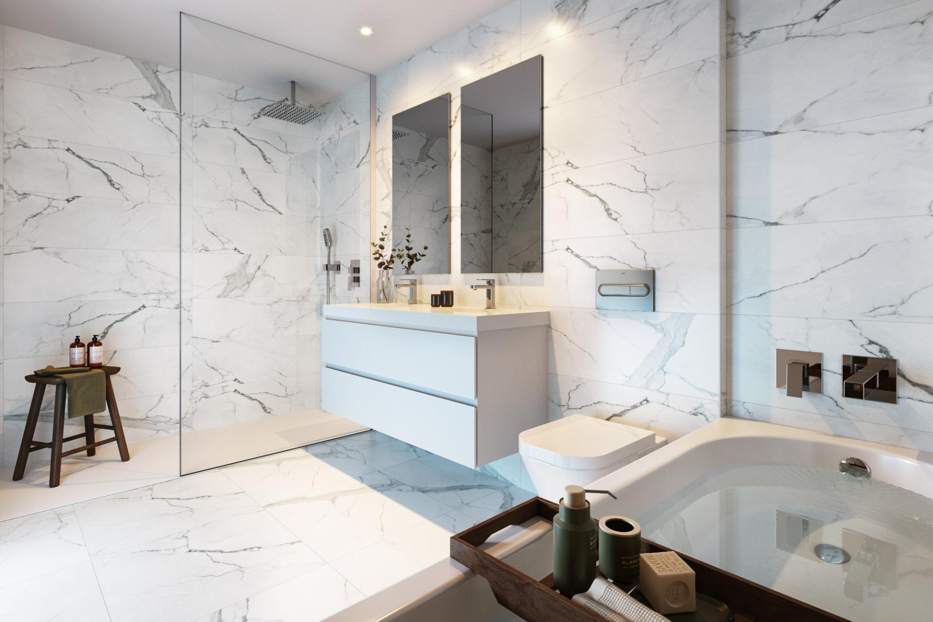 -3 baños completos con mamparas y muebles lavabos de diseño, uno en la planta baja y otro en suite en el dormitorio principal.