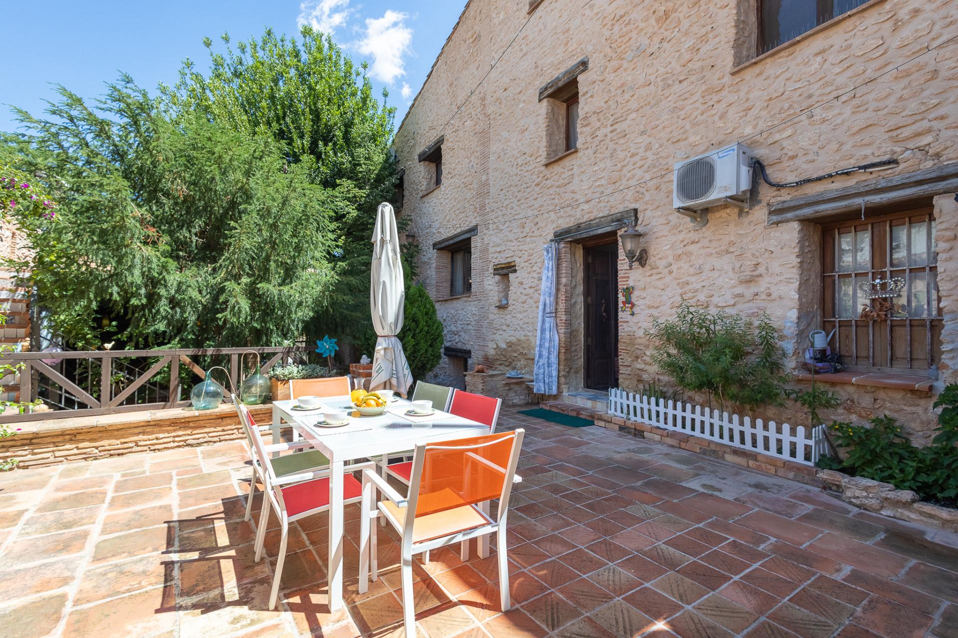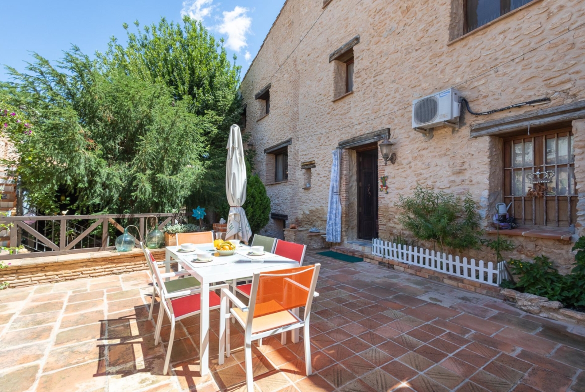 Esta centenaria casa está totalmente reformada, tiene cuatro dormitorios, todos ellos dobles con techos altos y tres de los mismos con baño en suite. Un comedor y un salón que cada uno ronda los 23 m2, los dormitorios están cerca de los 20 m2 y una zona habilitada como biblioteca de casi 10 m2. Los cerramientos son de alta calidad, lo que permite una eficiencia energética considerable y aislarla del frío en invierno. La casa cuenta además con una estufa de pellet. La zona exterior se puede dividir en cuatro espacios; una cercana al salón, ideal para los desayunos; otra elevada desde donde poder observar las estrellas gracias a la poca contaminación lumínica de la zona, la tercera ya habilitada bajo techo y una cuarta en donde se encuentra la piscina junto con paellero.