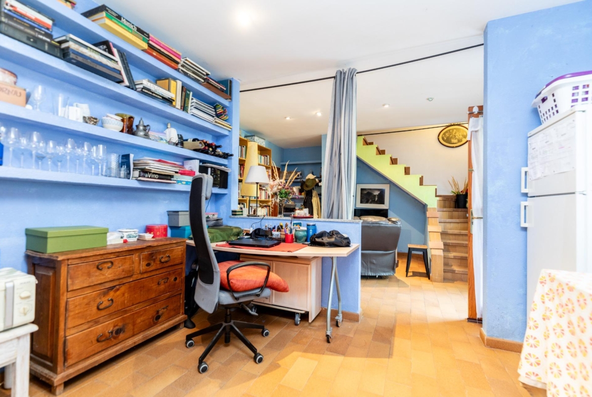 La planta inferior, es un estudio que dispone de una gran habitación con baño y extenso armario empotrado. Amplio espacio para el salón y office, con salida y entrada independiente directa. Ventanales y salida a un ambiente idílico para relajarse, disfrutar del silencio, compartir con amigos, leer con un vino, todo bajo la sombra de los frondosos árboles.