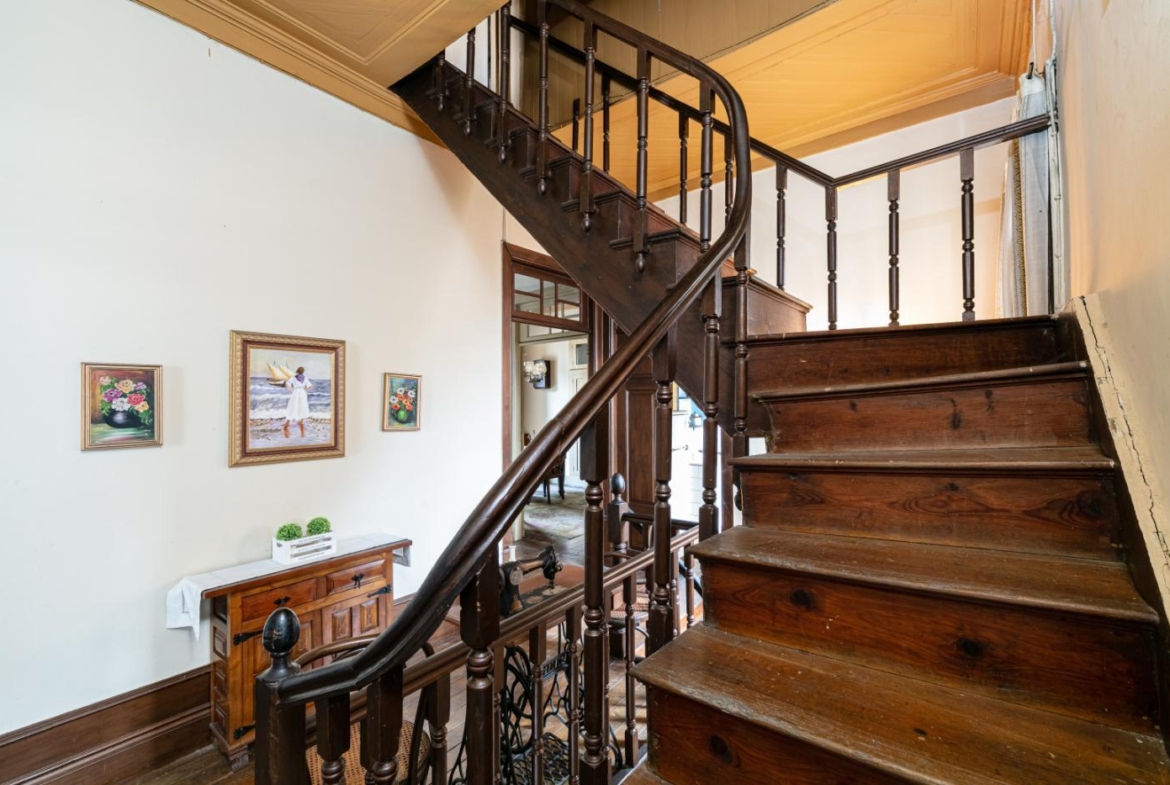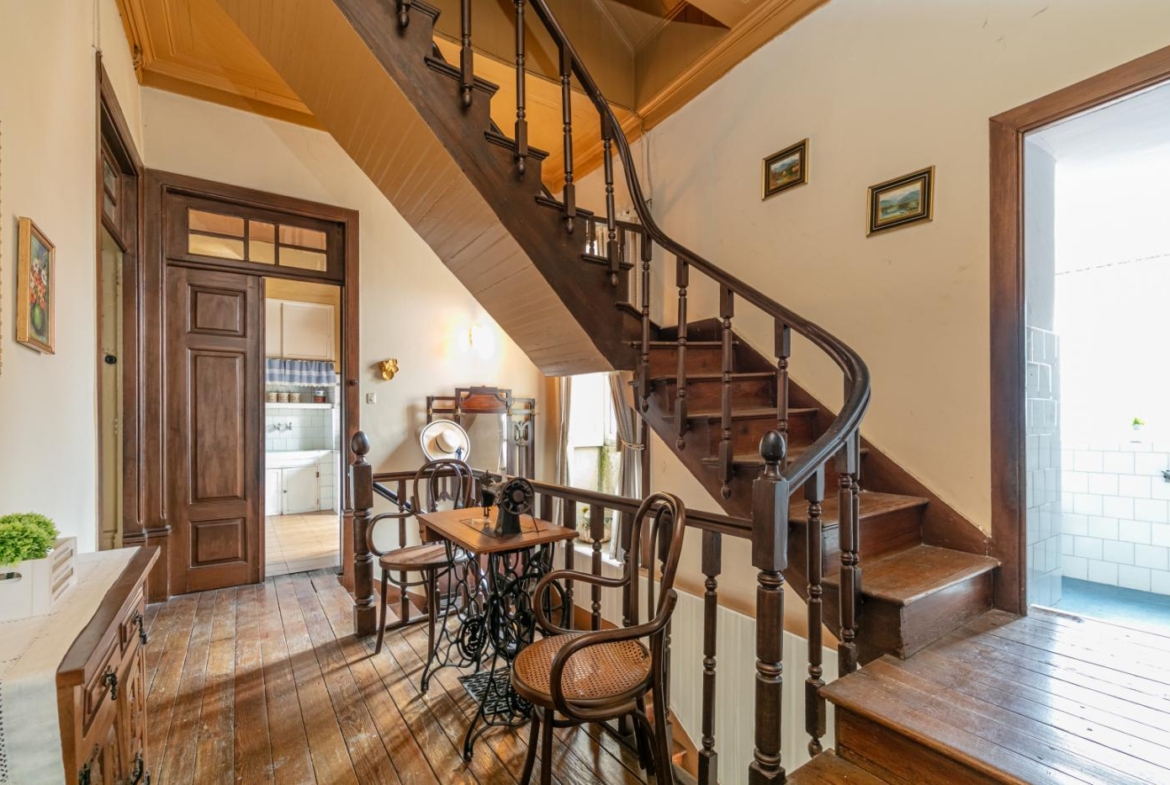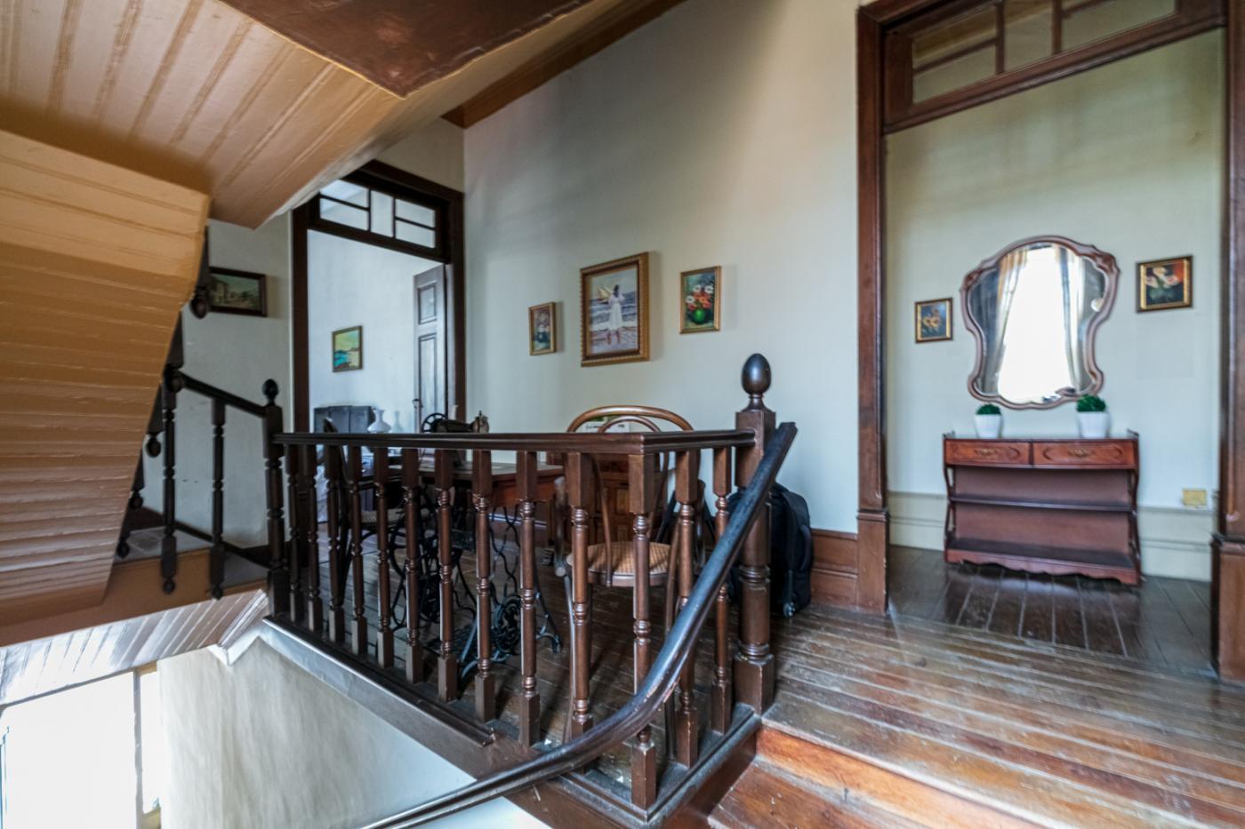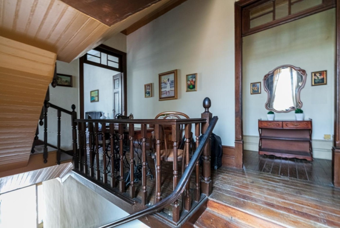 El vestíbulo de entrada principal tiene la escalera de madera original al primer piso, donde se encuentra la zona de vivienda principal y se compone de 3 habitaciones dobles, salón, cocina y sala de desayuno, comedor y la escalera que continúa hasta el ático con ventanas que idealmente podría convertirse a un dormitorio adicional con baño.