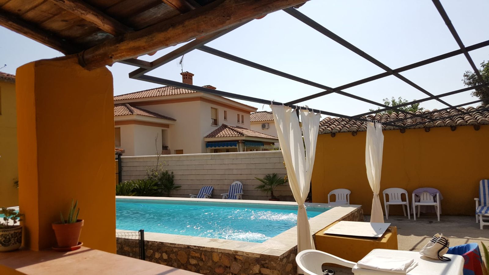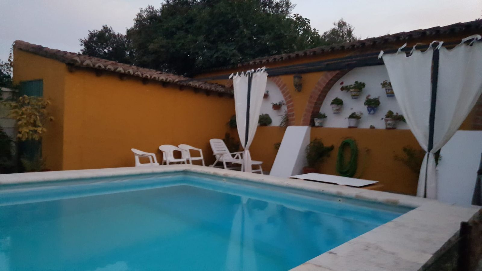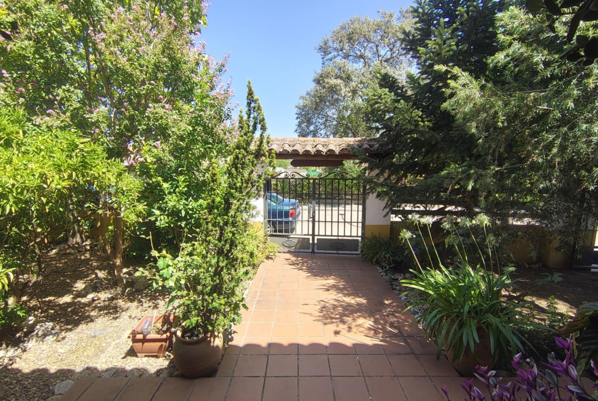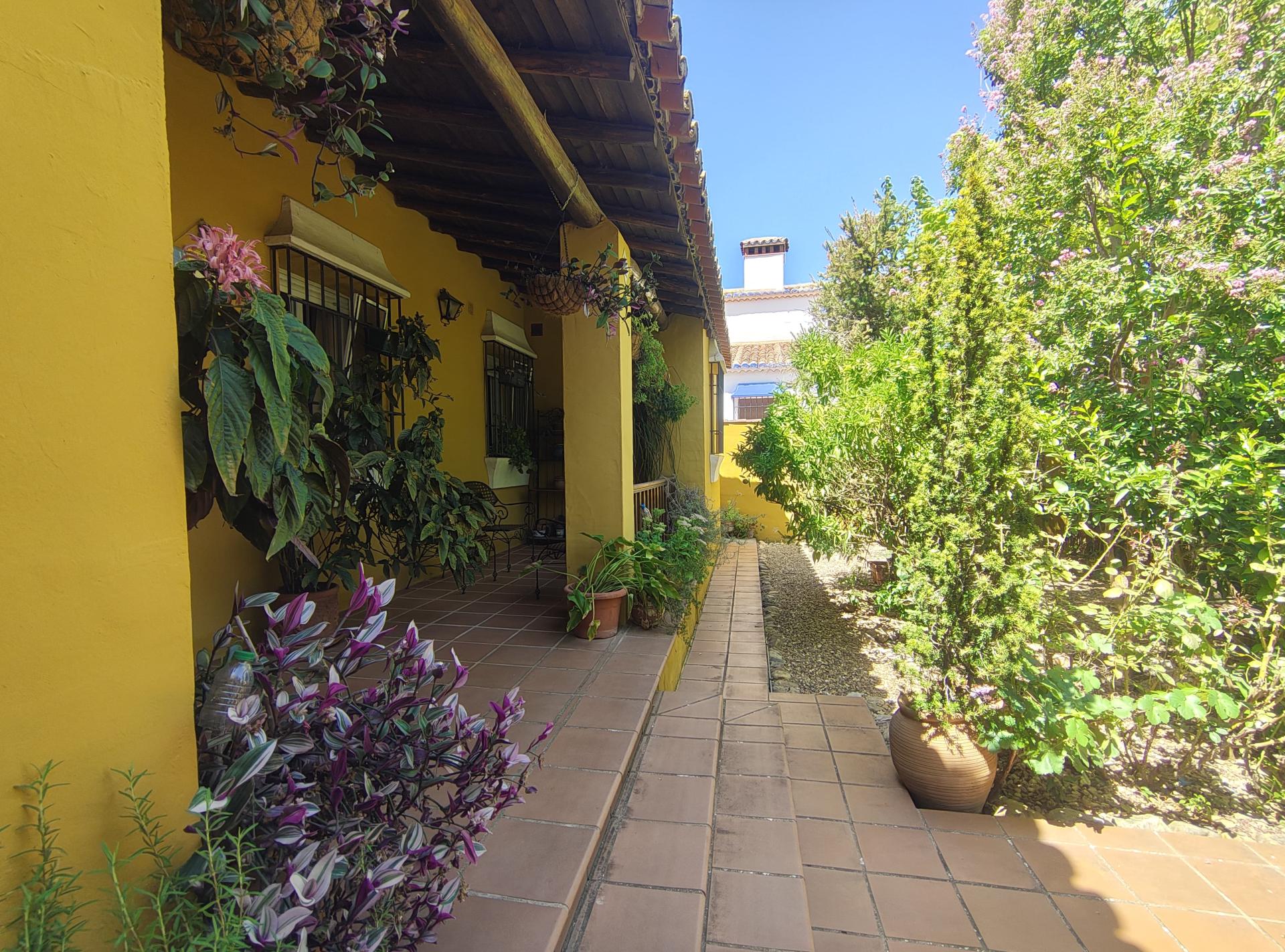El jardín es un verdadero oasis de tranquilidad, con una zona de bar ideal para disfrutar al aire libre, una piscina para refrescarse en los días cálidos y un trastero adicional ubicado en la parte trasera. La entrada a la propiedad cuenta con un magnífico porche cubierto, lleno de plantas que aportan frescura y belleza al entorno, y una zona de aparcamiento para un coche.