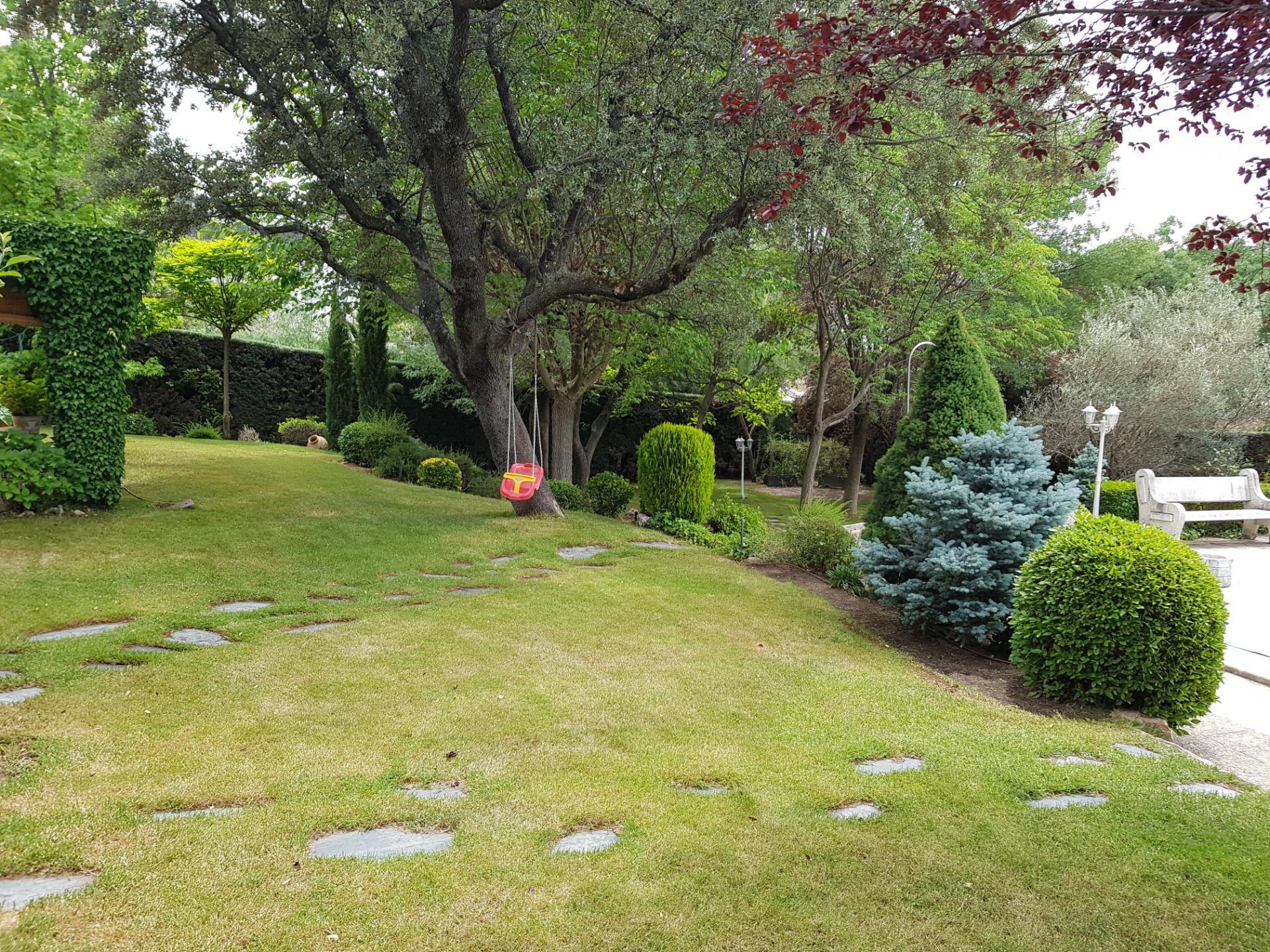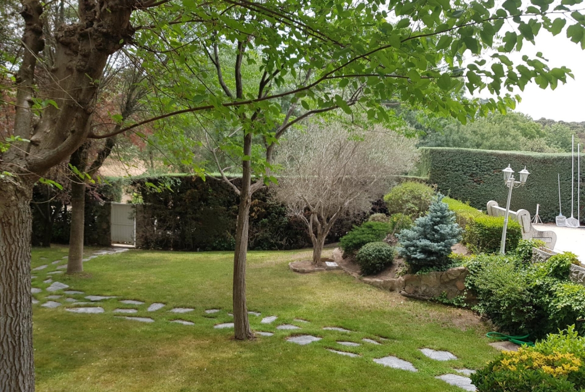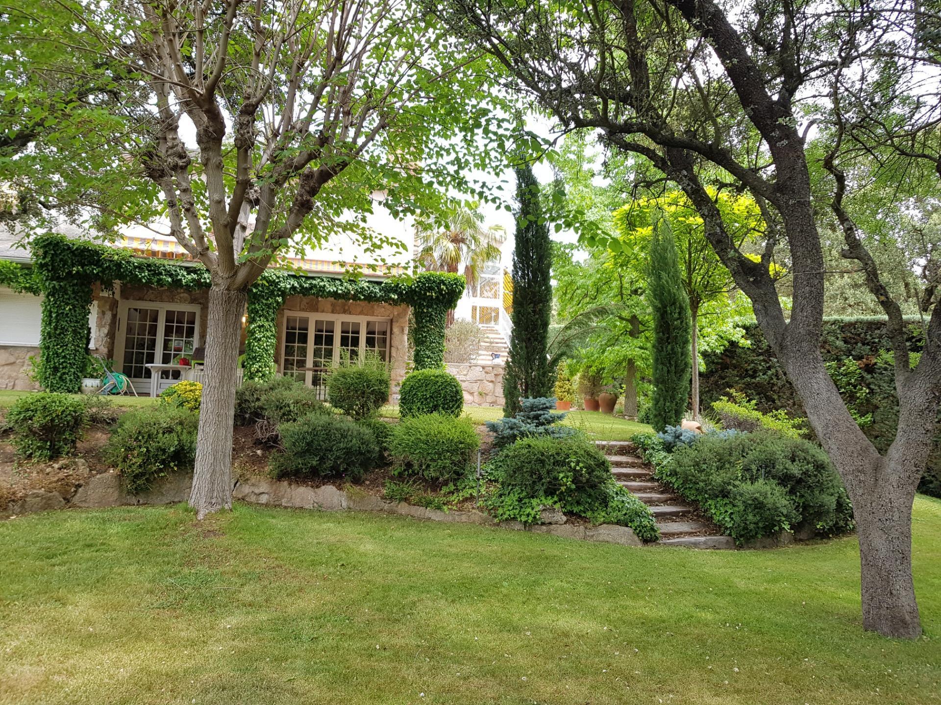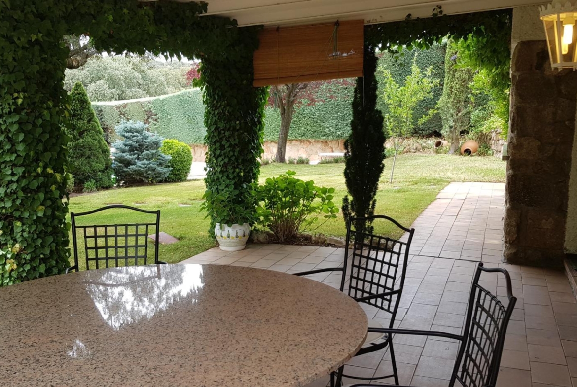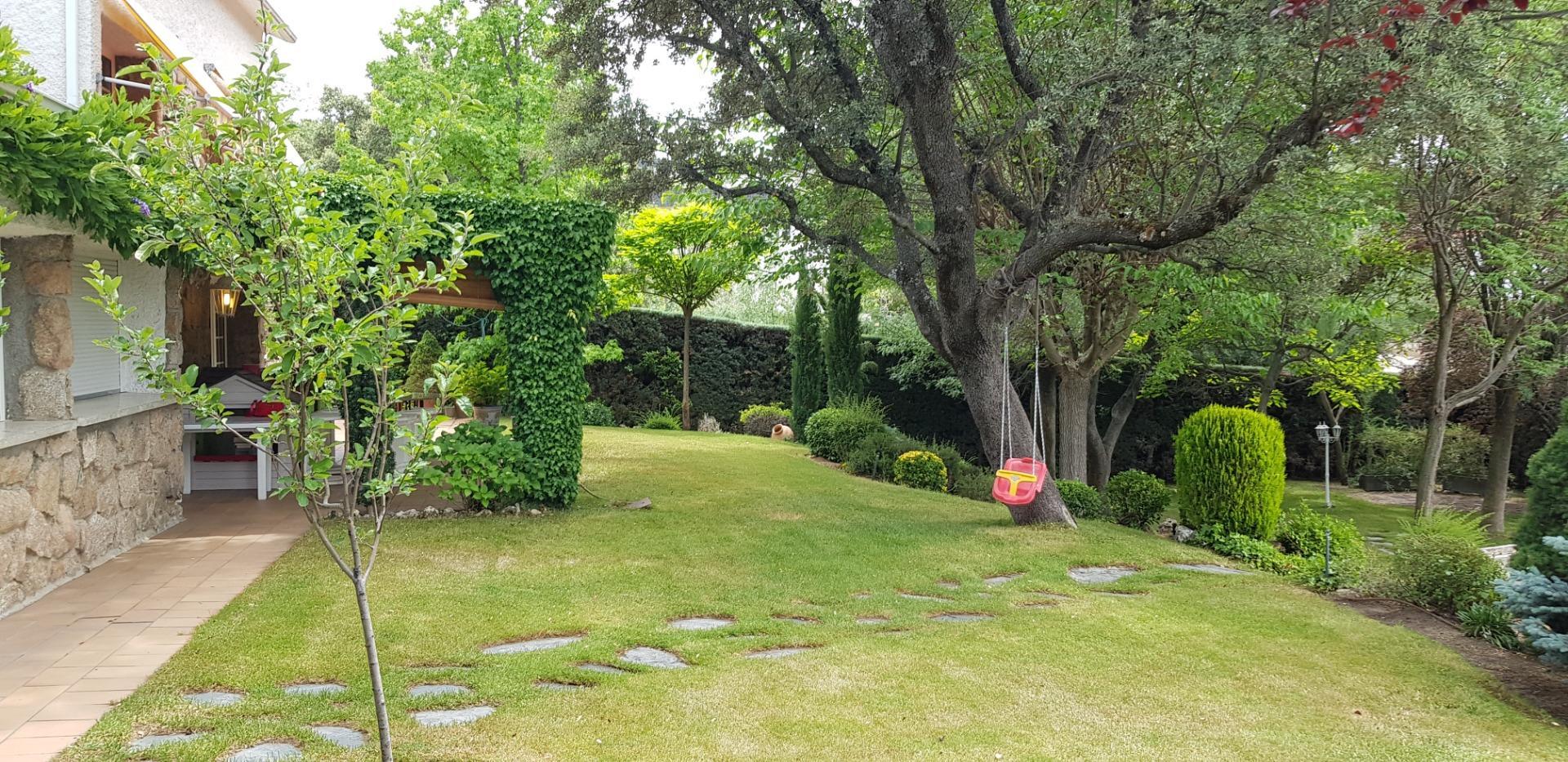 El chalet está rodeado de un amplio y frondoso jardín a dos niveles con setos y variada arboleda, dispuestos en un bonito diseño. Porche acondicionado, riego automático y piscina, donde podrás gozar de una tranquilidad absoluta.