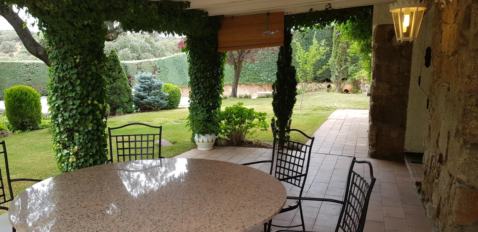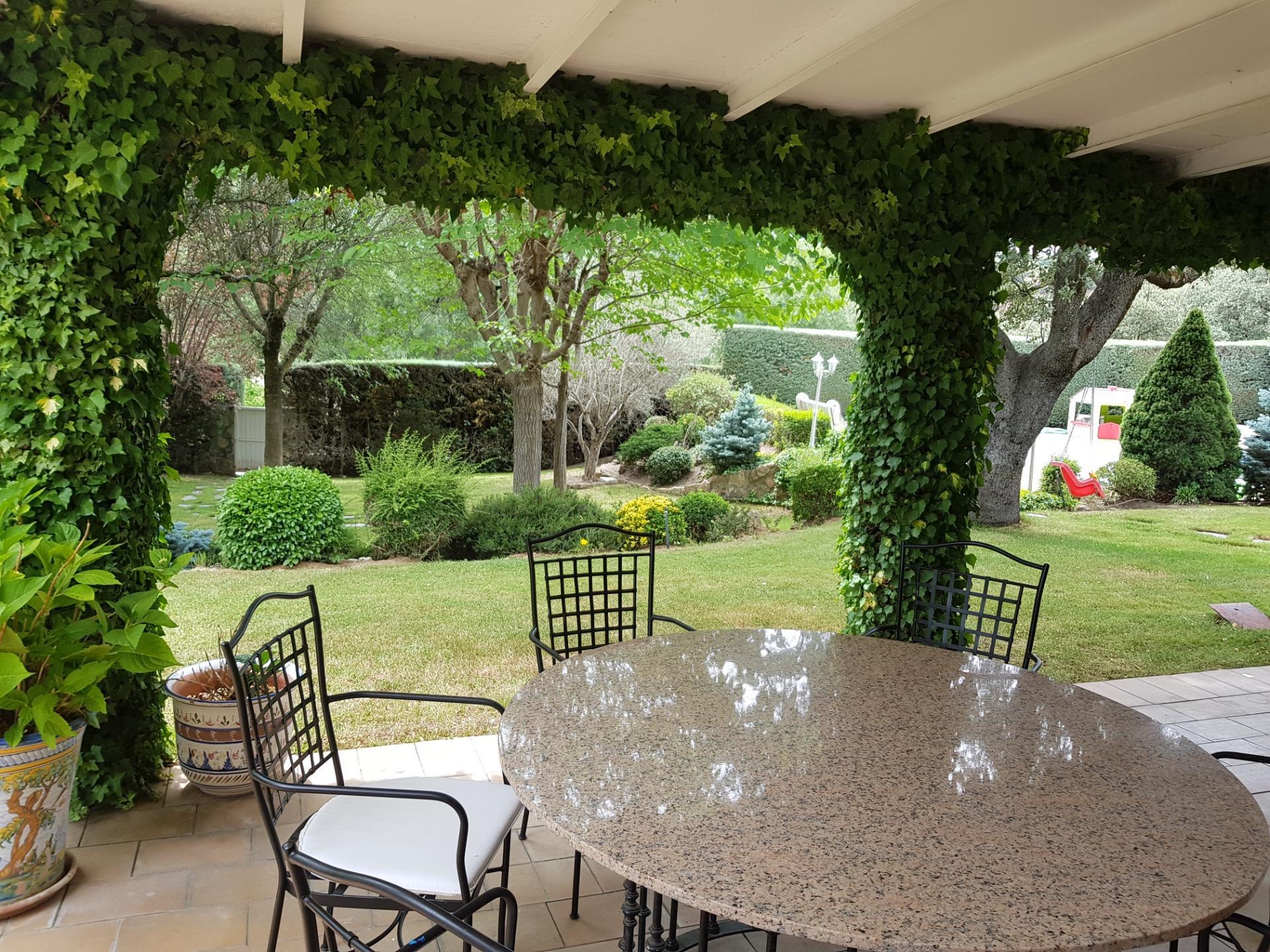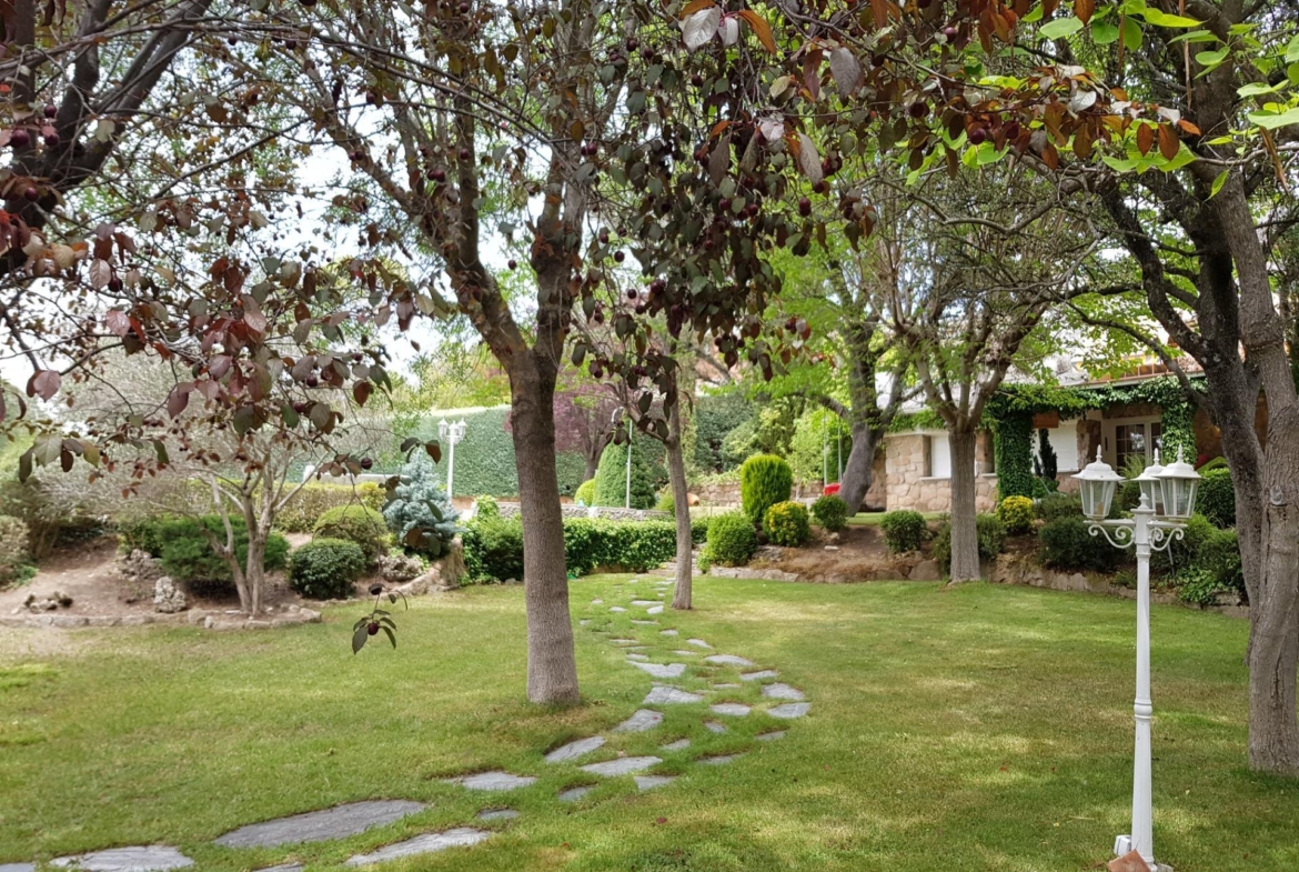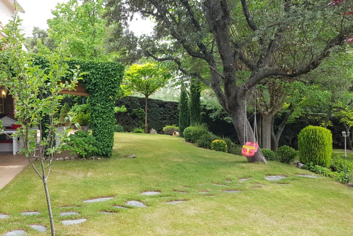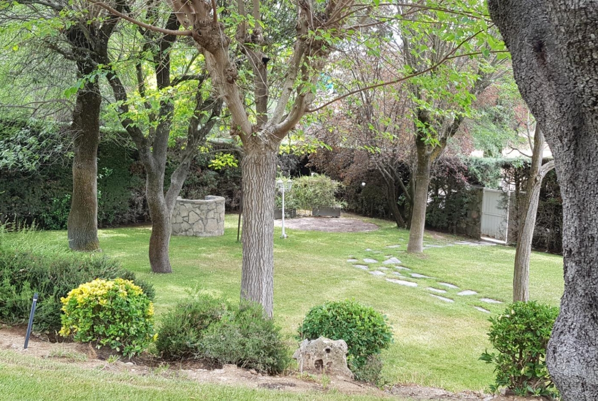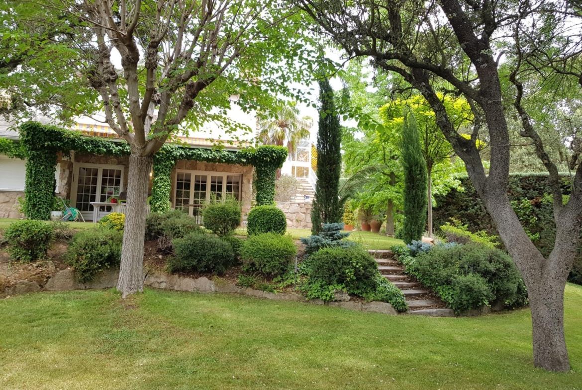 El chalet está rodeado de un amplio y frondoso jardín a dos niveles con setos y variada arboleda, dispuestos en un bonito diseño. Porche acondicionado, riego automático y piscina, donde podrás gozar de una tranquilidad absoluta.