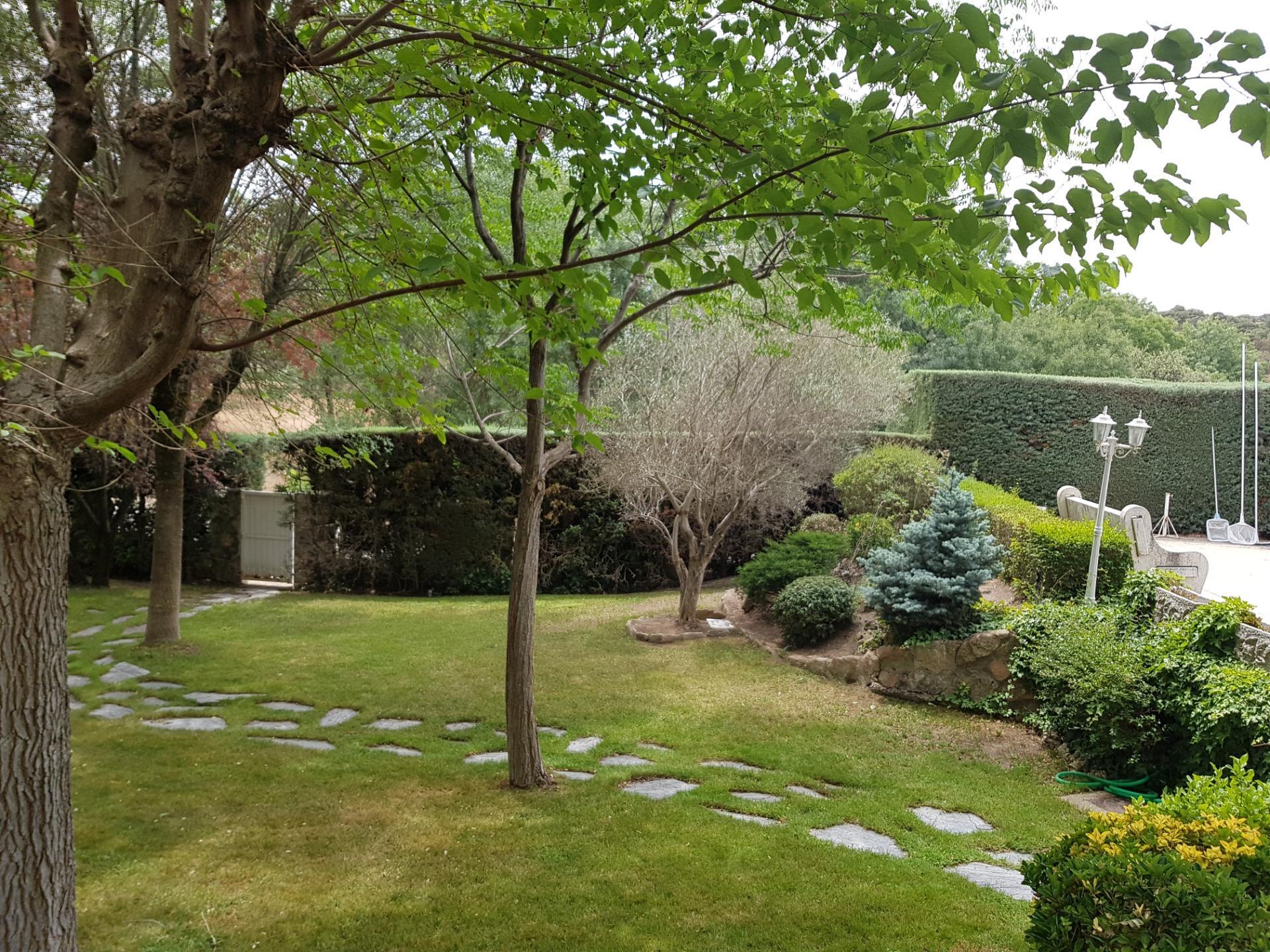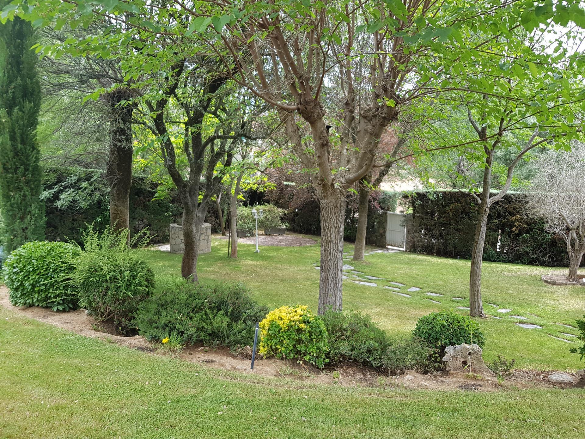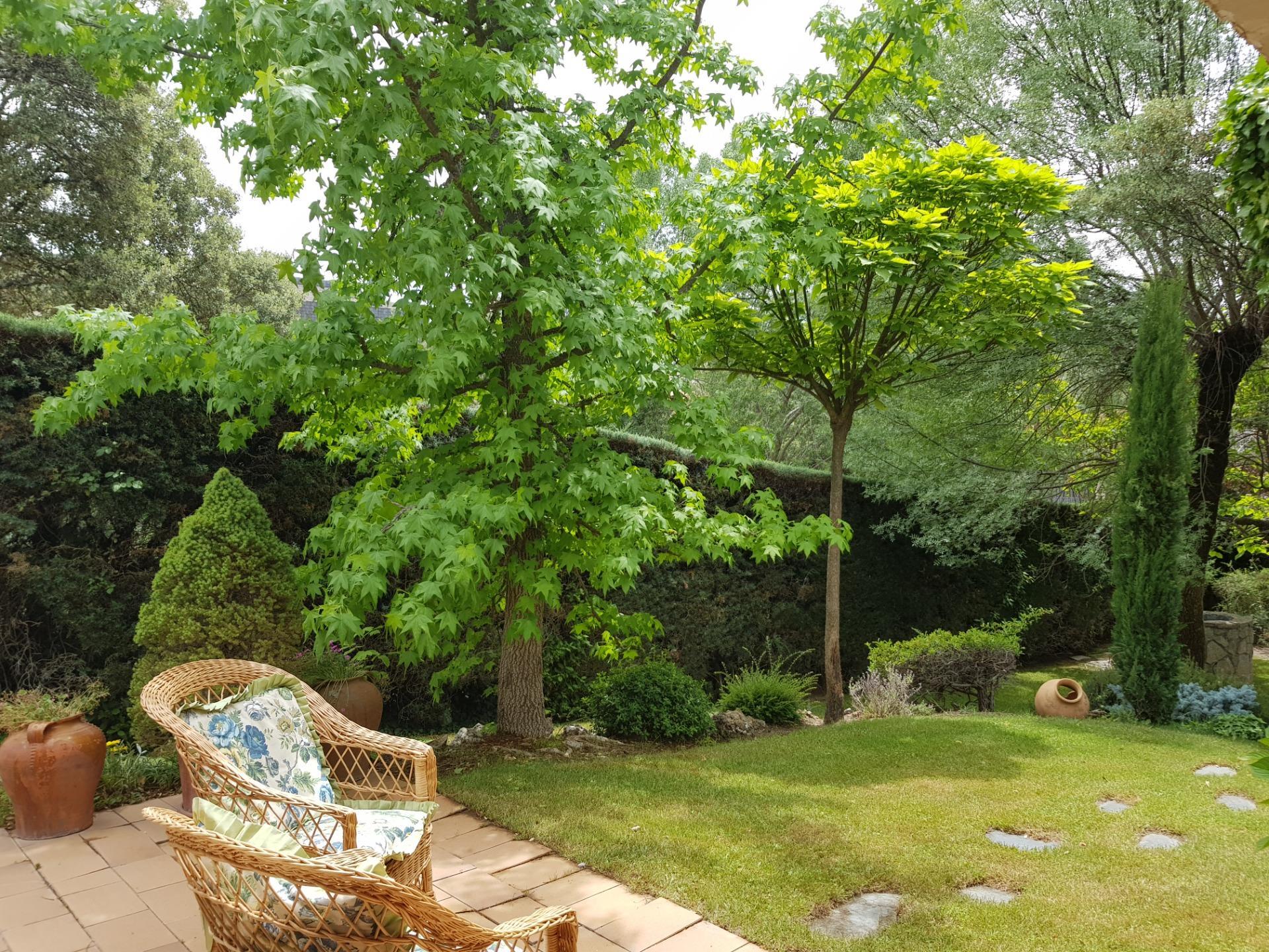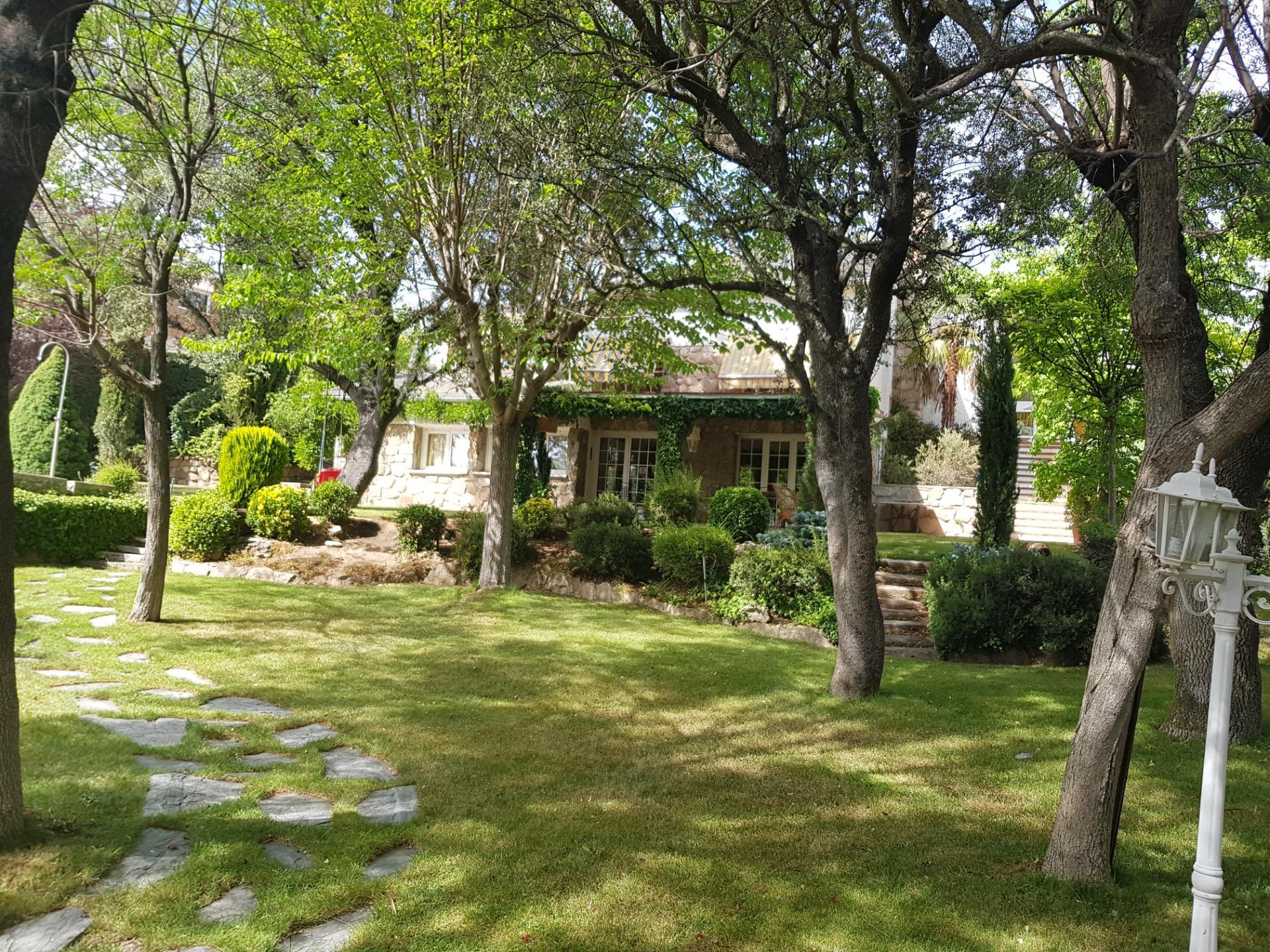 El chalet está rodeado de un amplio y frondoso jardín a dos niveles con setos y variada arboleda, dispuestos en un bonito diseño. Porche acondicionado, riego automático y piscina, donde podrás gozar de una tranquilidad absoluta.