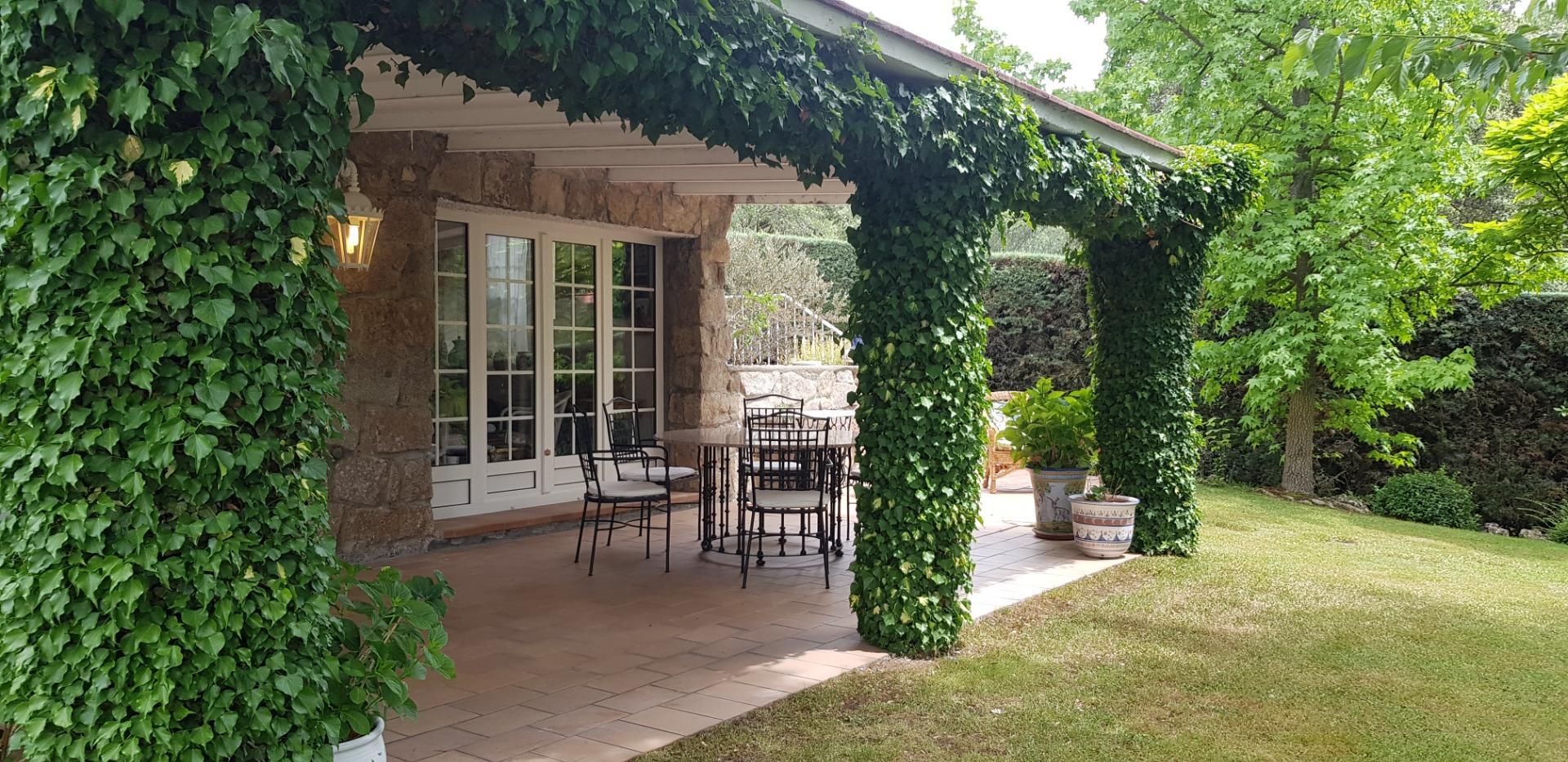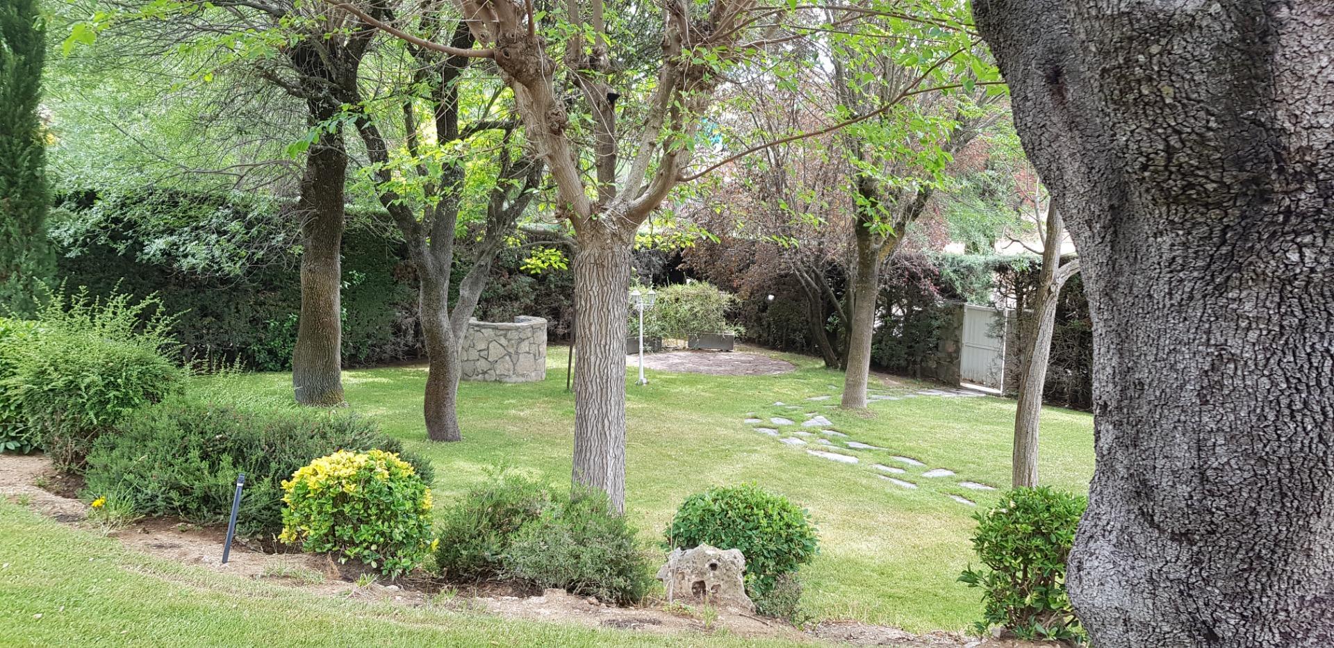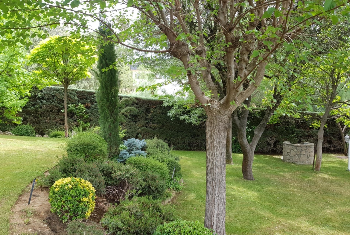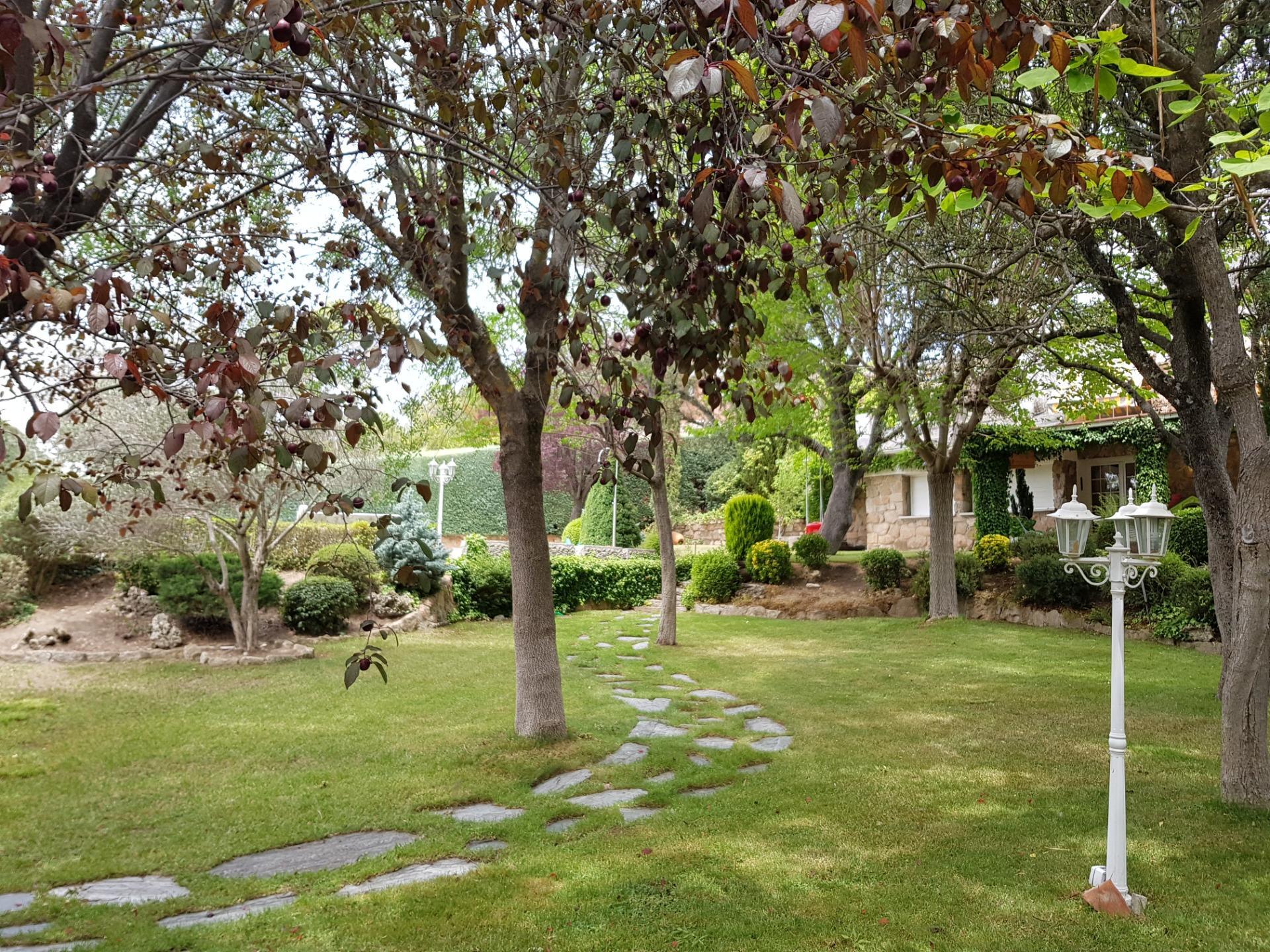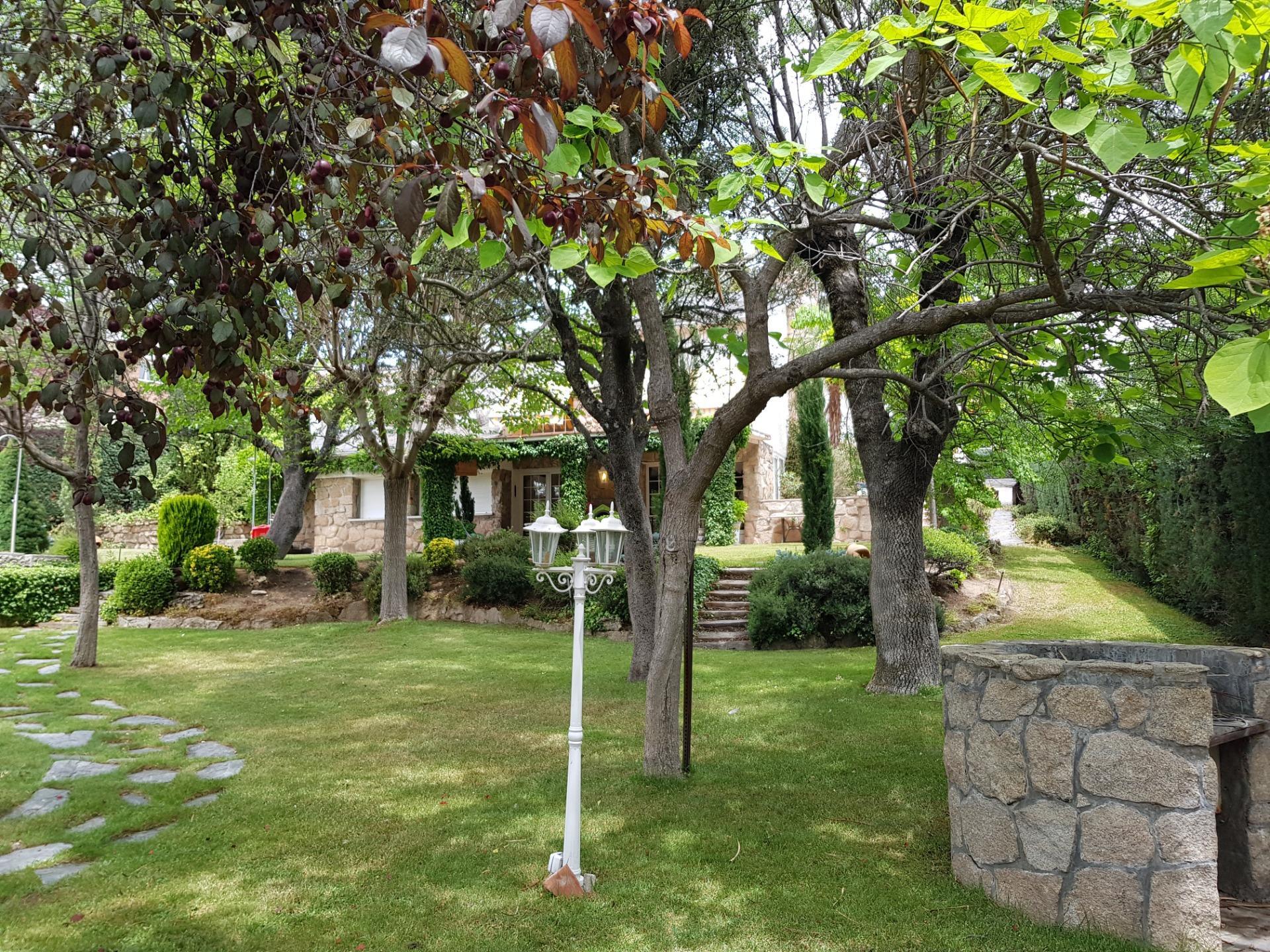 El chalet está rodeado de un amplio y frondoso jardín a dos niveles con setos y variada arboleda, dispuestos en un bonito diseño. Porche acondicionado, riego automático y piscina, donde podrás gozar de una tranquilidad absoluta.