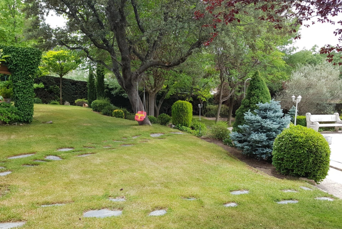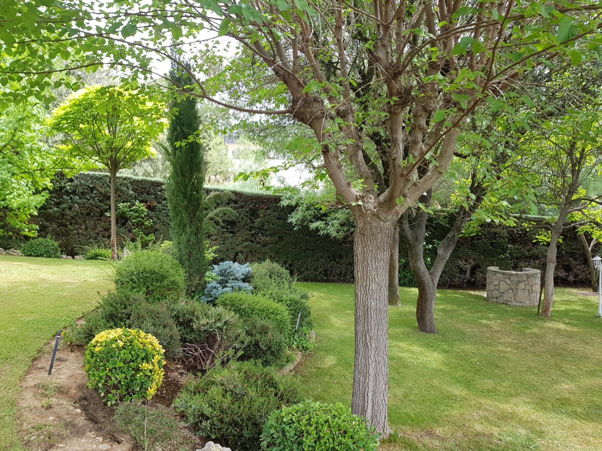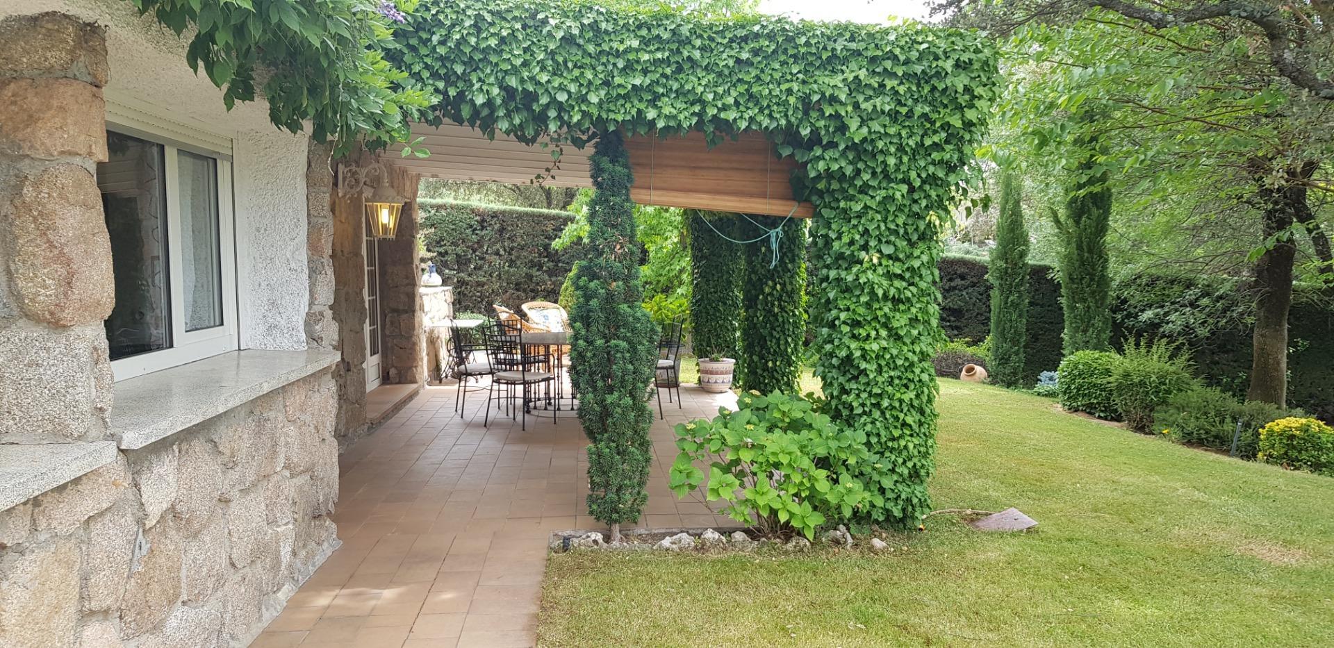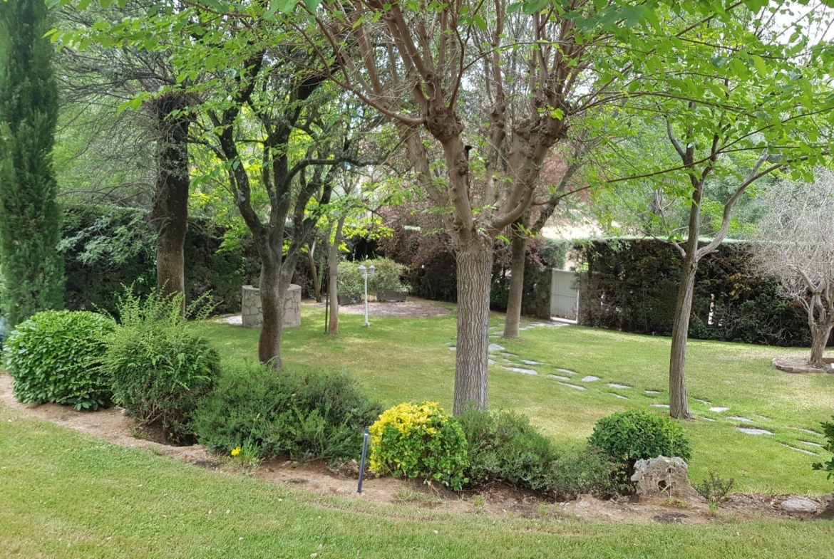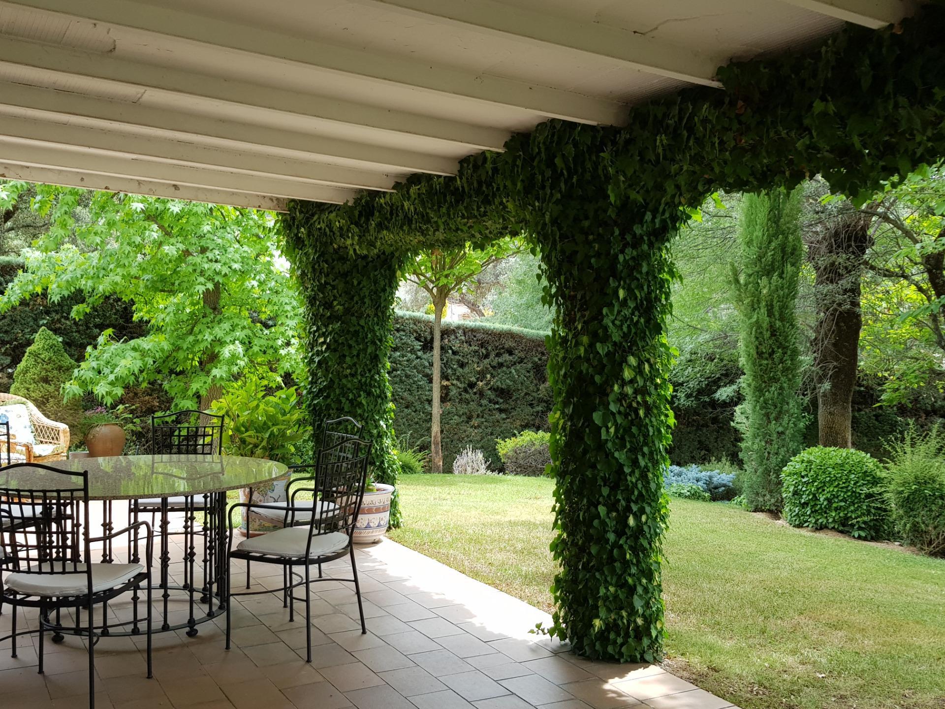 El chalet está rodeado de un amplio y frondoso jardín a dos niveles con setos y variada arboleda, dispuestos en un bonito diseño. Porche acondicionado, riego automático y piscina, donde podrás gozar de una tranquilidad absoluta.