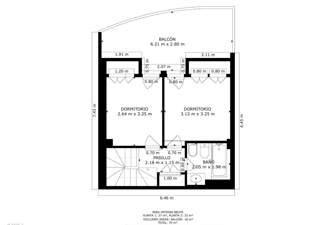 La planta superior alberga la zona de descanso, compuesta por dos dormitorios, ambos con acceso directo a la segunda terraza, lo que aporta privacidad y unas vistas privilegiadas. Un baño completo da servicio a ambos dormitorios, con una distribución cómoda y práctica.