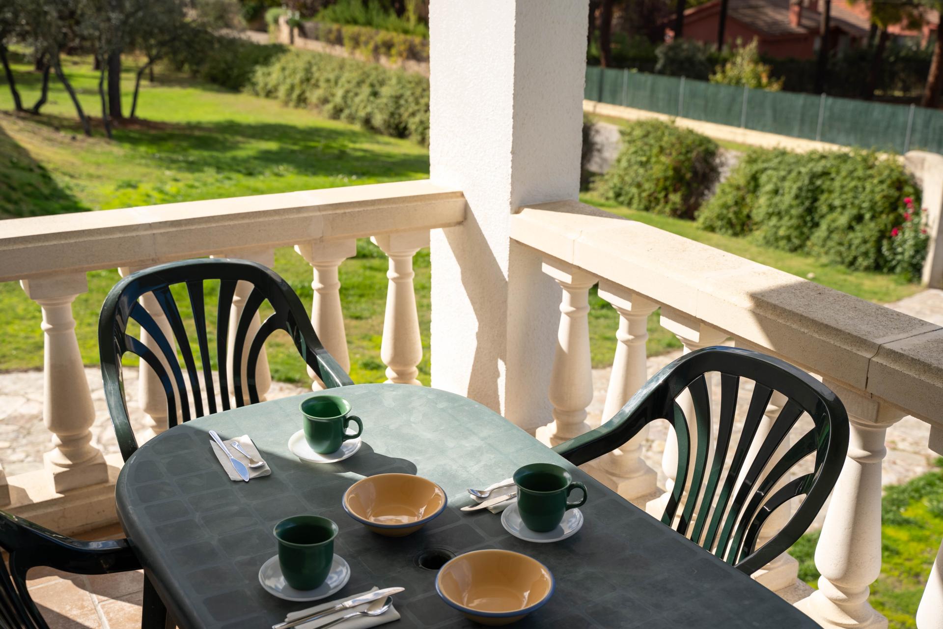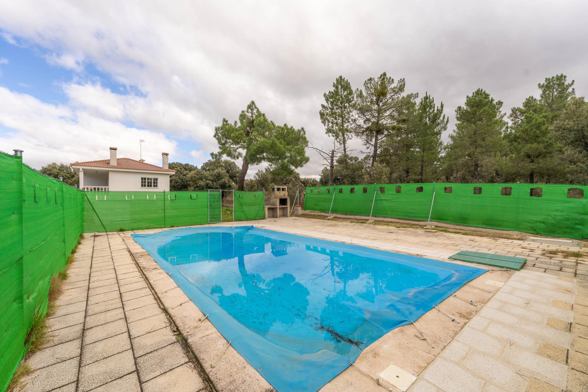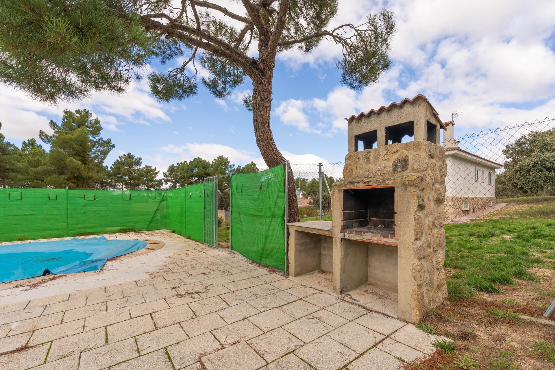 En la zona exterior del chalet, en la amplia zona verde con árboles de considerable tamaño se encuentra la piscina con una superficie aproximada de 35 m2 y zona de barbacoa.