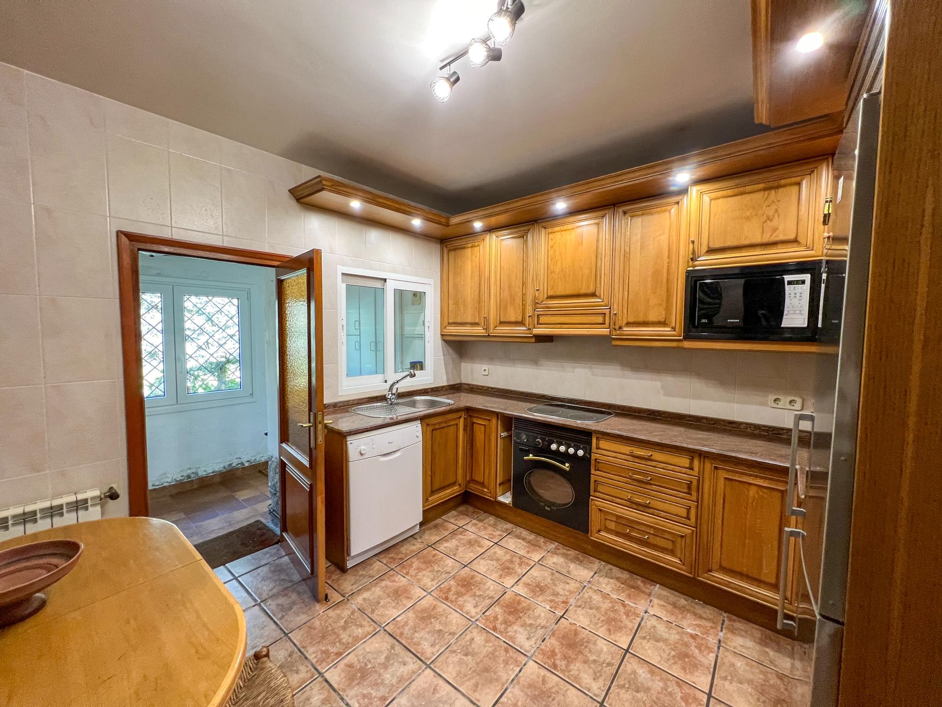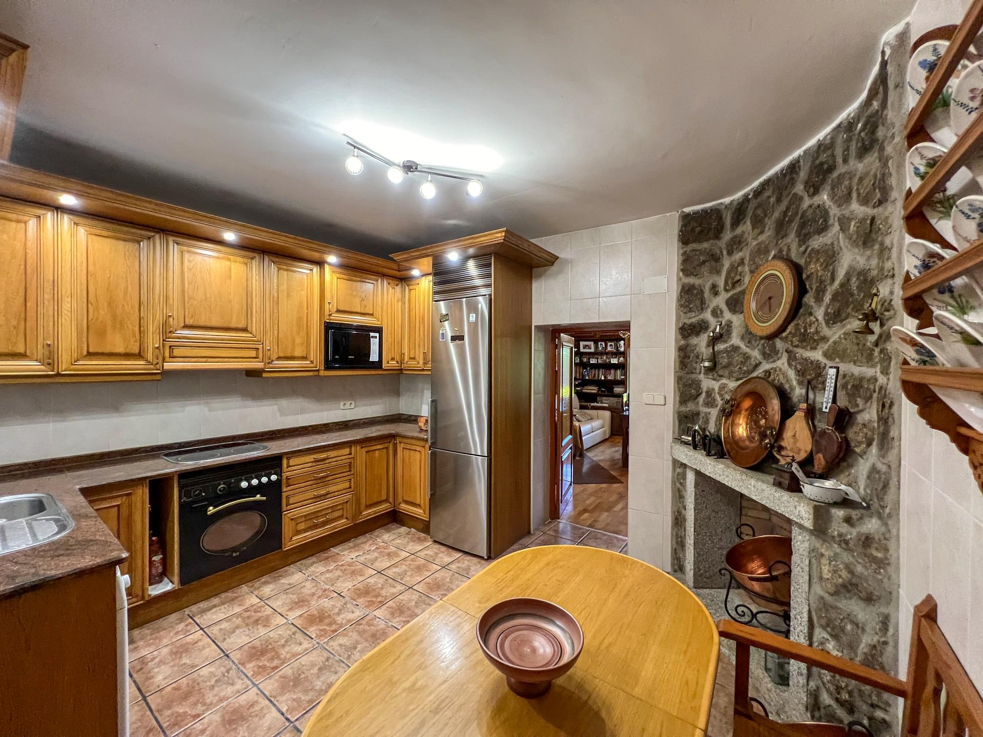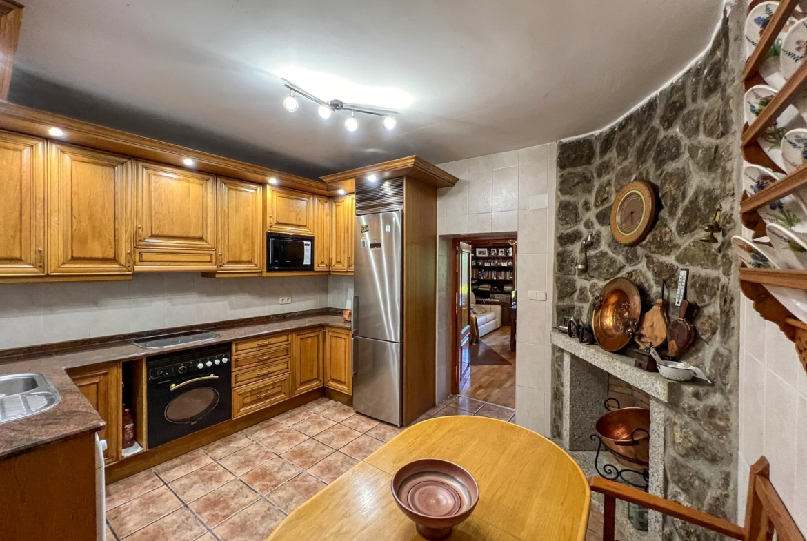 La cocina, moderna y funcional, se abre a uno de los salones con chimenea donde la luz natural fluye a través de grandes ventanas.