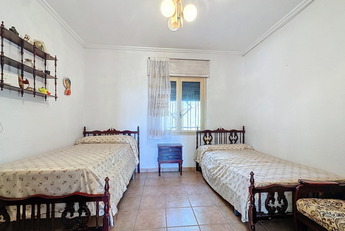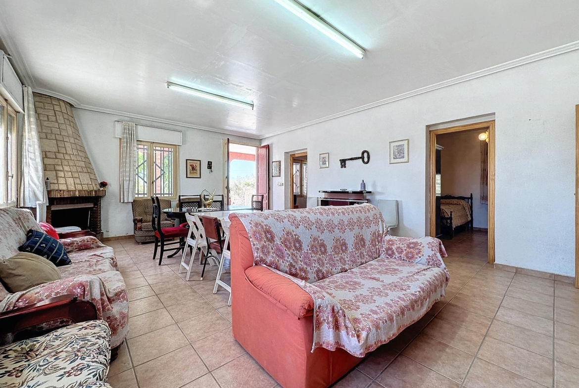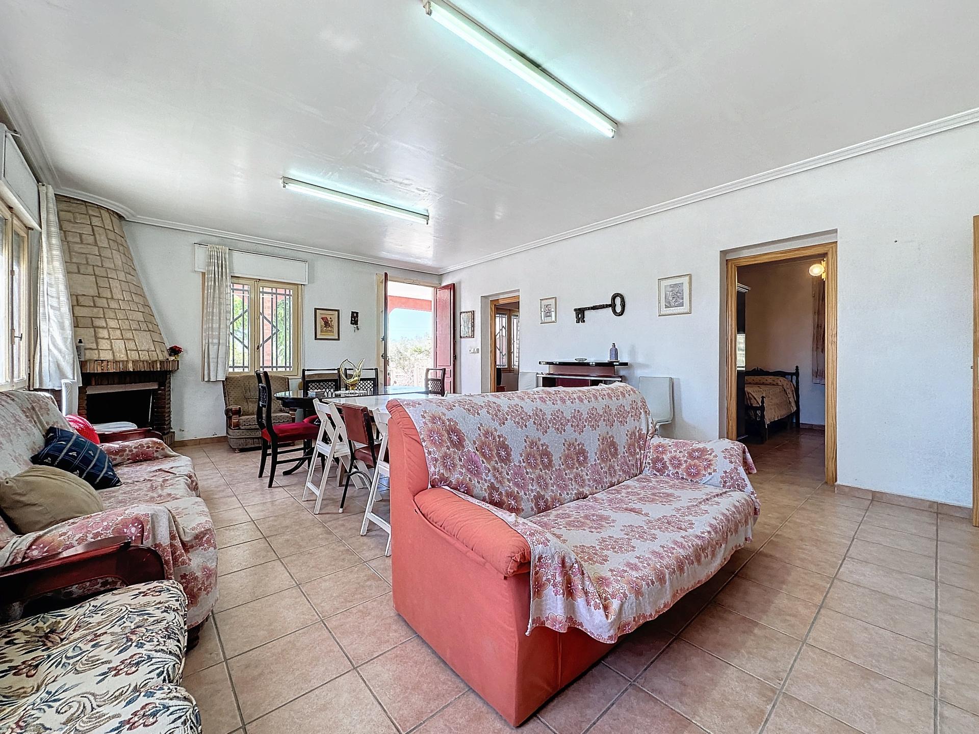 Entrando a la parcela, nos encontramos con el chalet independiente de 104 m2 de planta baja con su gran terraza cubierta. La vivienda se compone de un amplio salón comedor con una chimenea de leña natural, una amplia cocina independiente completamente equipada, 3 dormitorios dobles y 1 cuarto de baño completo con bañera.