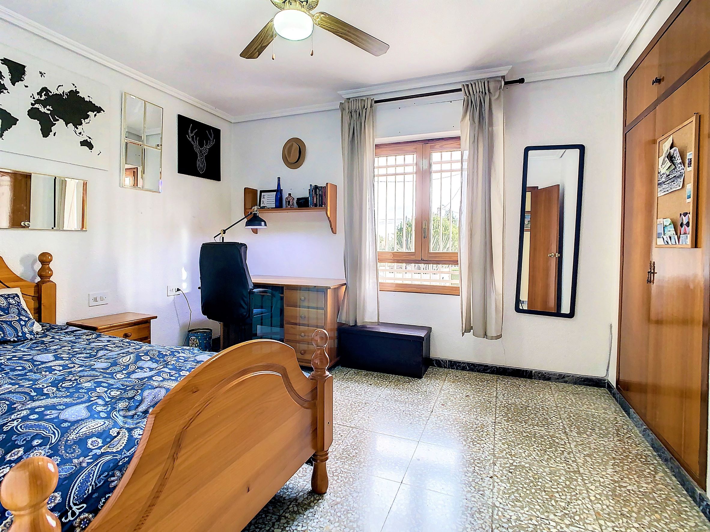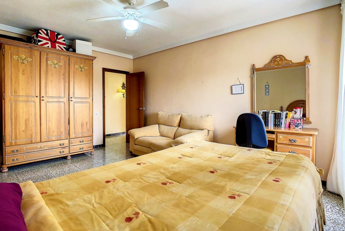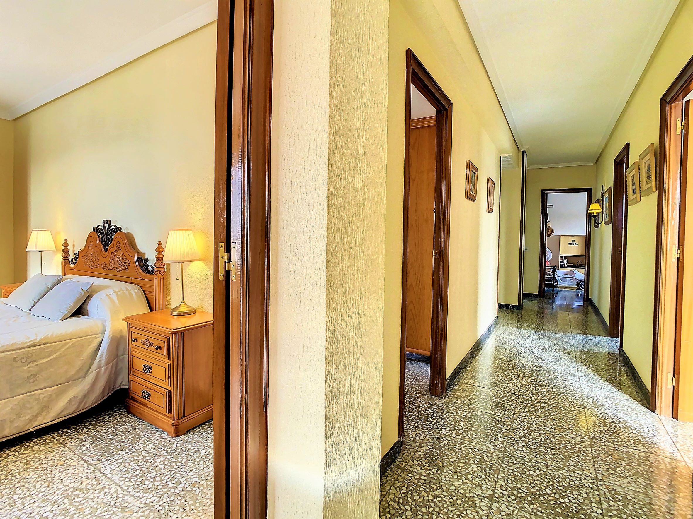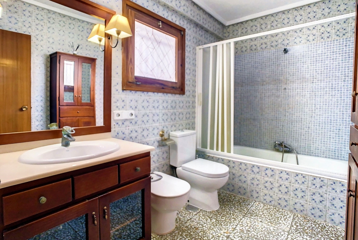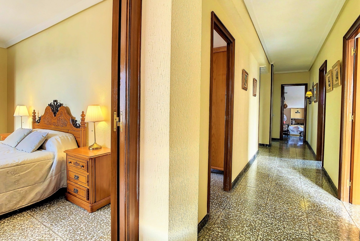 – En la planta alta, tenemos las 5 habitaciones dobles, todas exteriores, amplias y luminosas, 2 cuartos de baño completos con bañera. Además, tienes una segunda terraza descubierta.