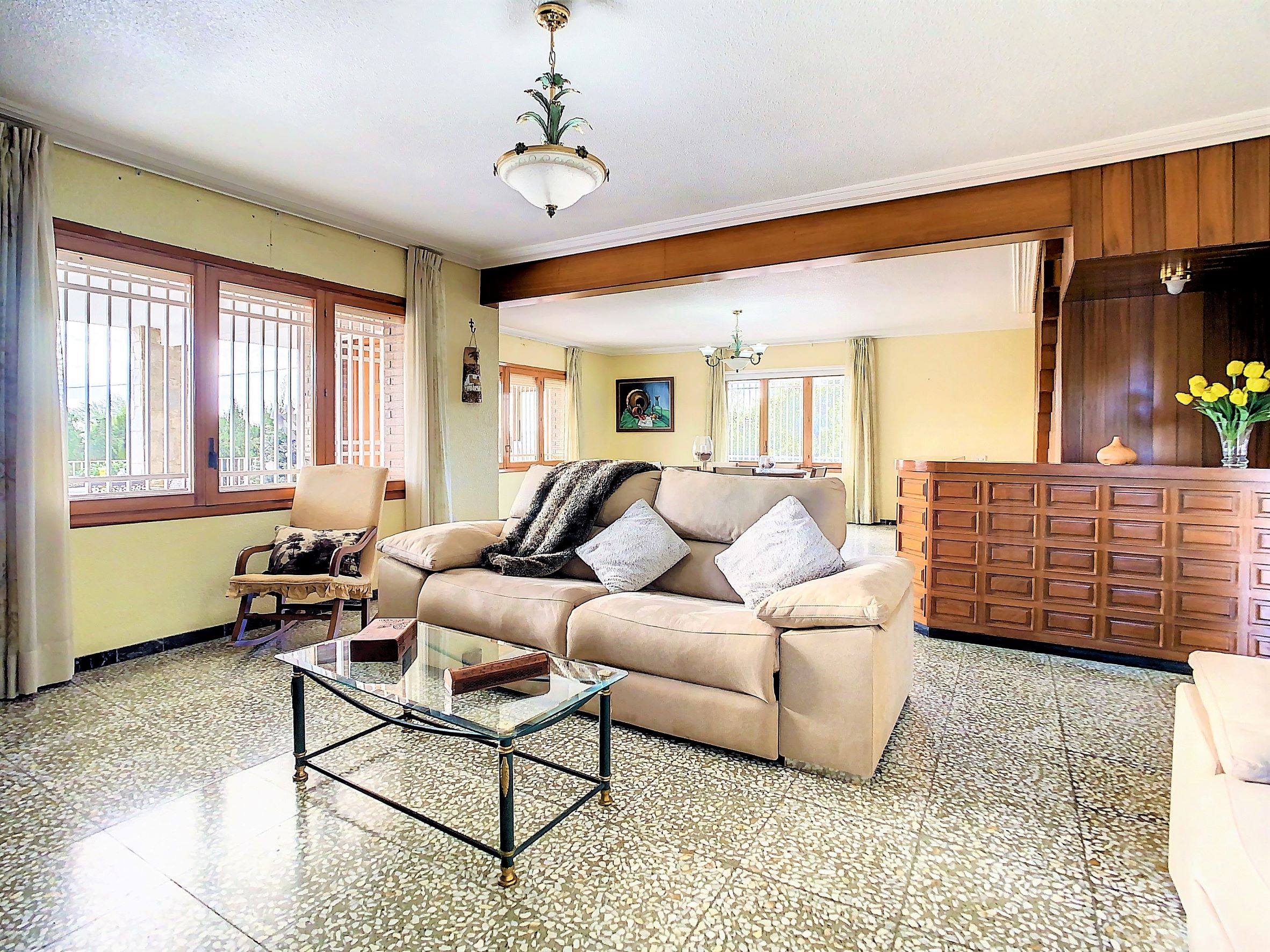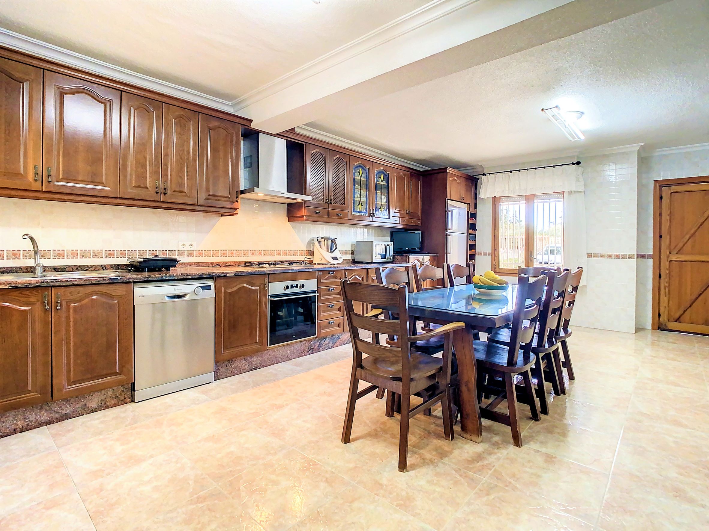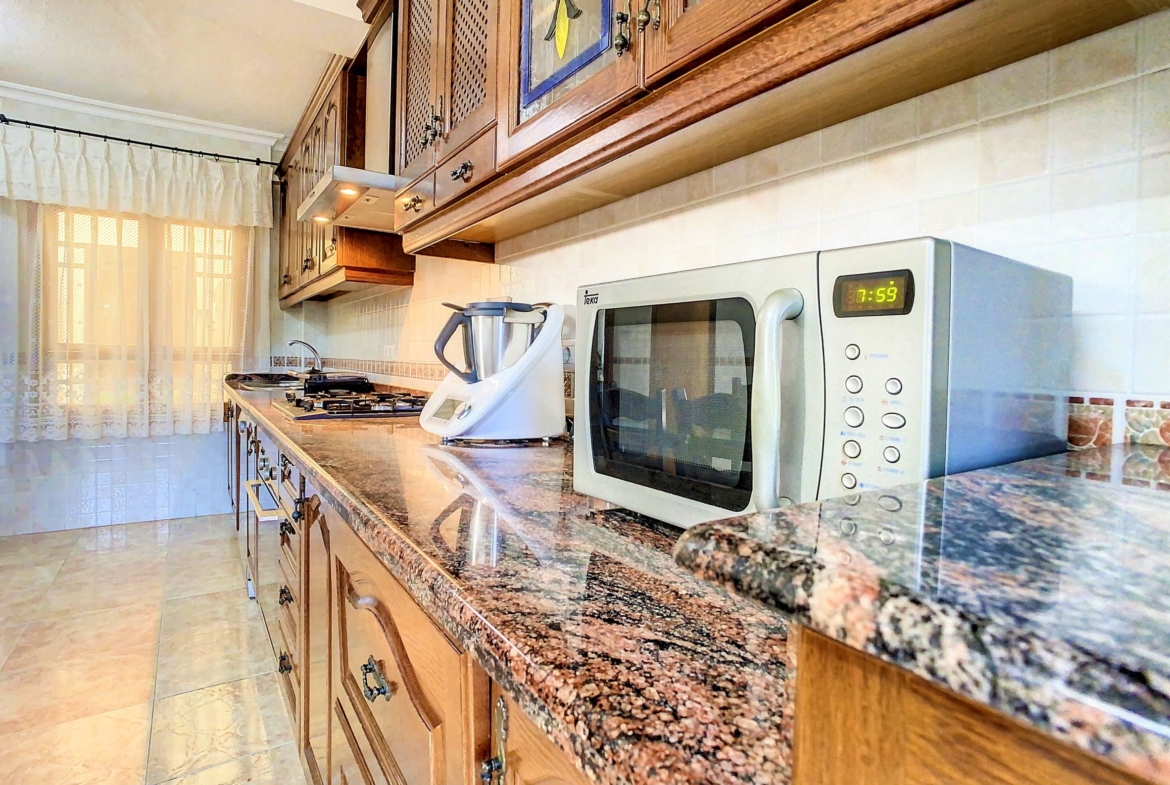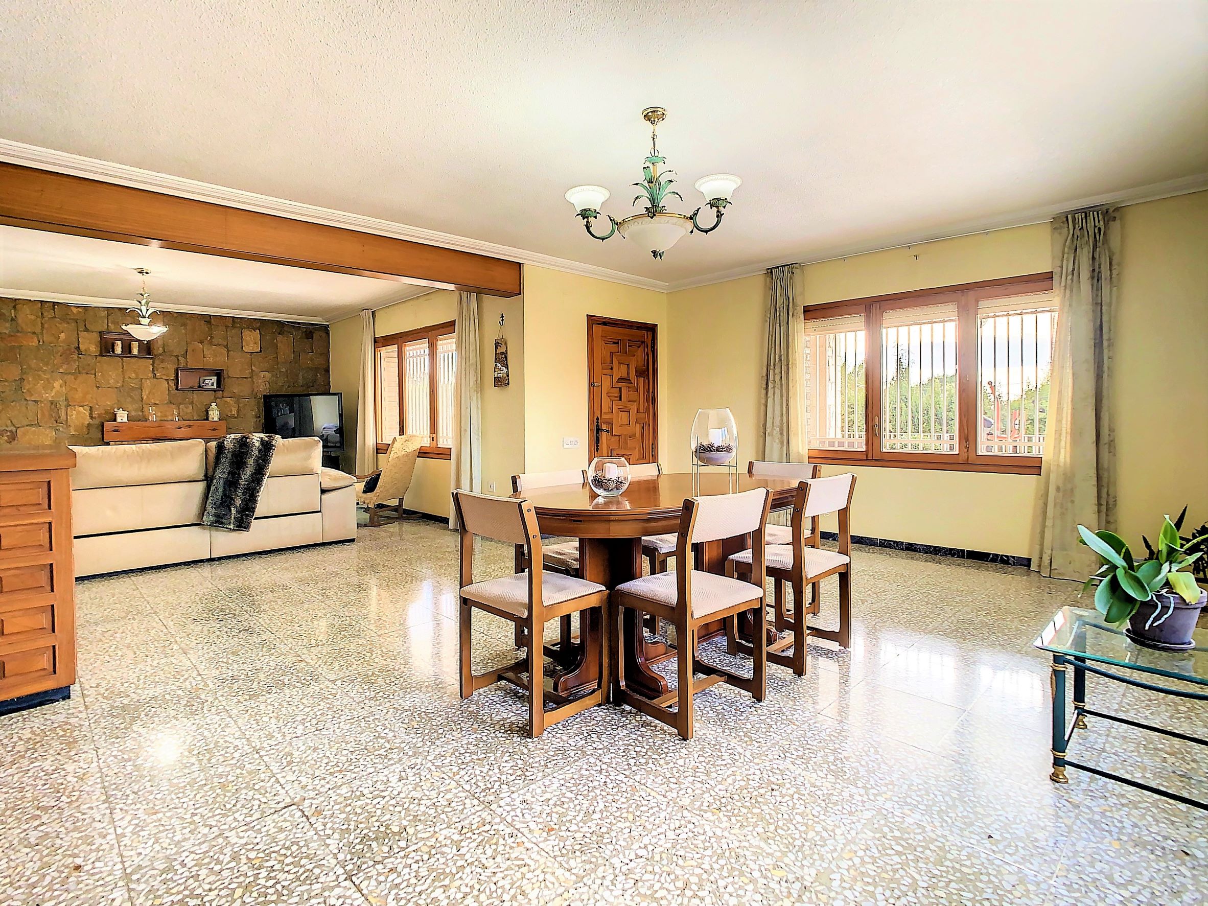 – La planta baja se encuentra una cocina independiente de unos 20 m2 totalmente equipada, un cuarto de baño con ducha y una galería cerrada con barbacoa y la lavandería. Lo más sorprendente de esta planta es el gran salón comedor de unos 80 m2, una estancia ideal para pasar tiempo en familia o entre amigos. Desde el comedor se accede a una amplia terraza cubierta.