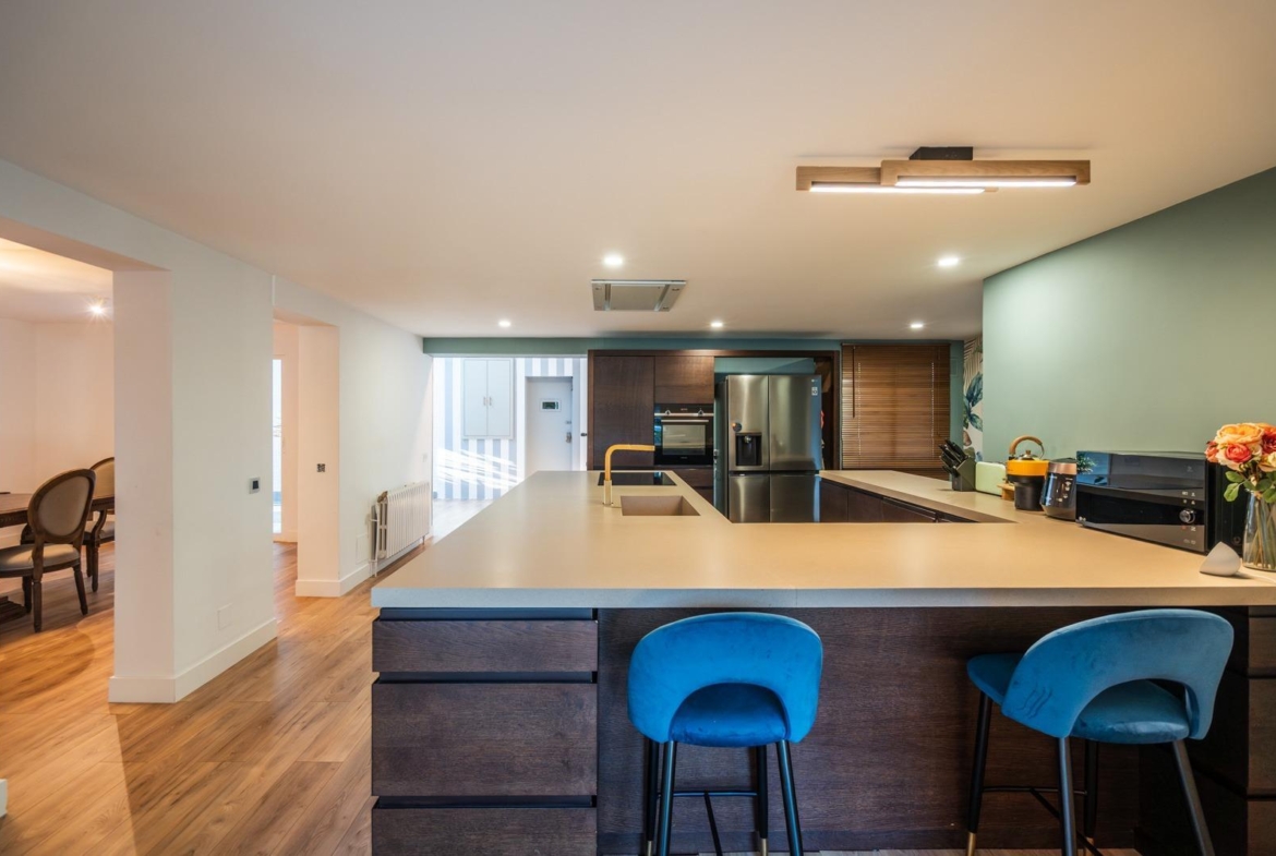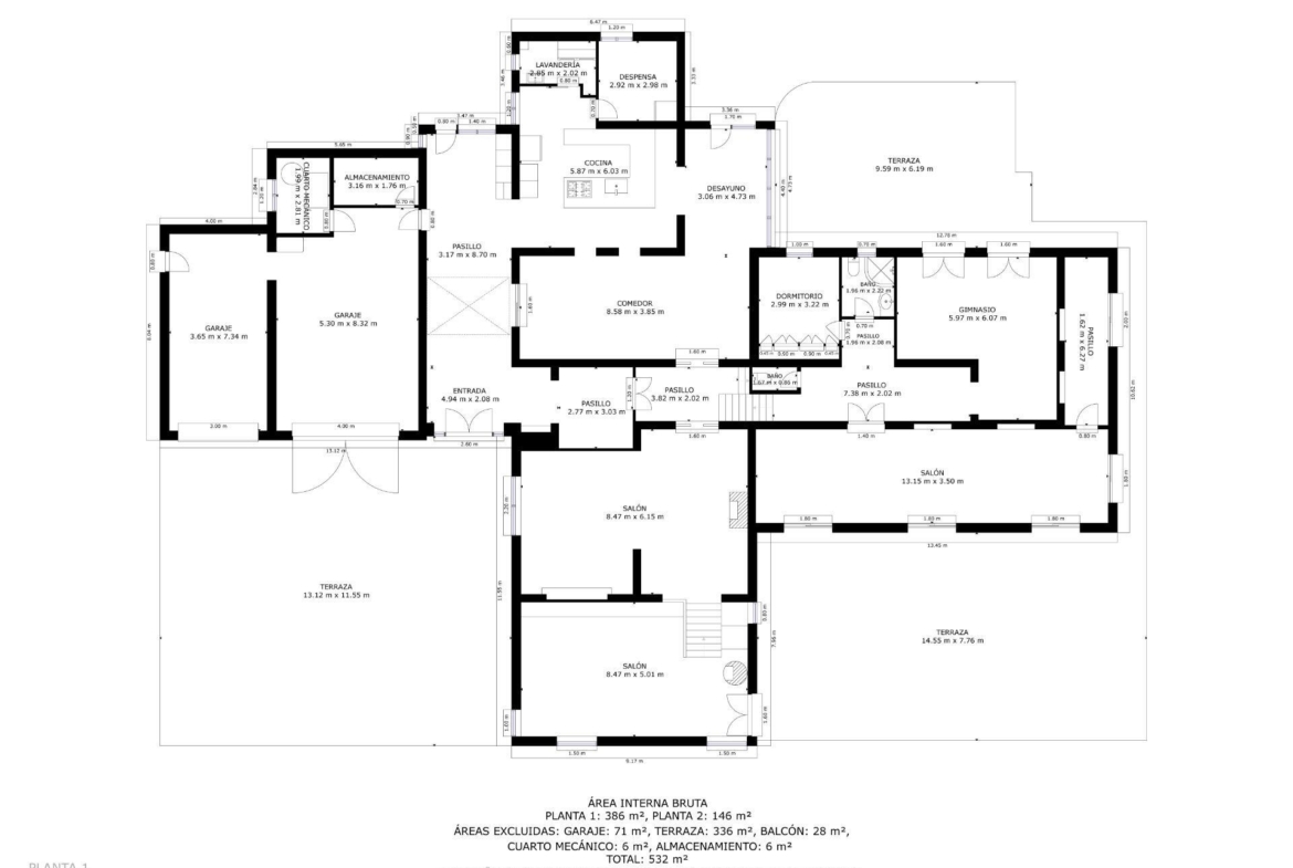 En la planta principal, un elegante vestíbulo distribuidor da acceso a las distintas estancias. La cocina, moderna y completamente equipada, destaca por su gran isla central en forma de U y se comunica con el comedor formal y con una espléndida terraza acristalada, integrada como parte de la vivienda. Desde aquí, los espacios fluyen hacia el salón principal —con doble ambiente y chimenea— y hacia un acogedor estar también con chimenea y salida a otra terraza privada. Esta planta se completa con una amplia despensa, cuarto de lavado, comedor diario, dos garajes cerrados, cuarto de calderas y trastero.
