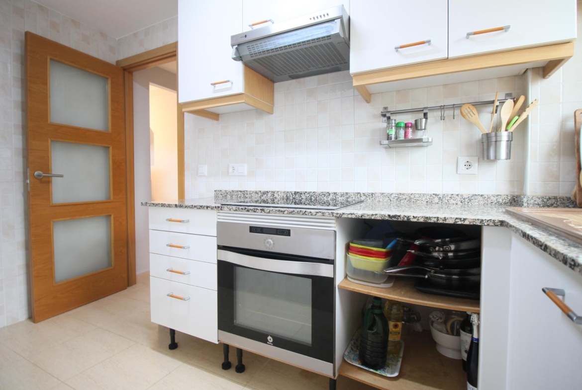Dispone de cocina independiente, con acceso tanto a una terraza cubierta como a otra descubierta, aportando funcionalidad y ventilación natural.