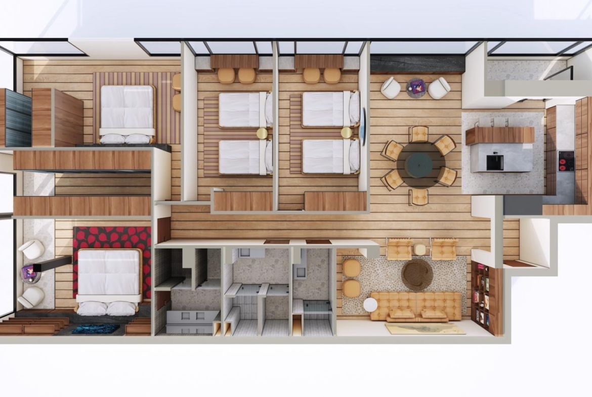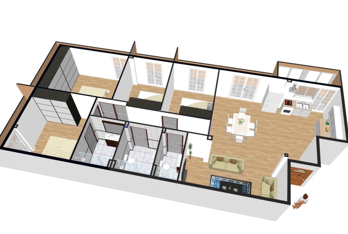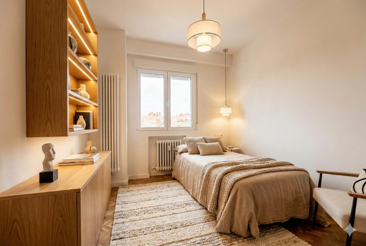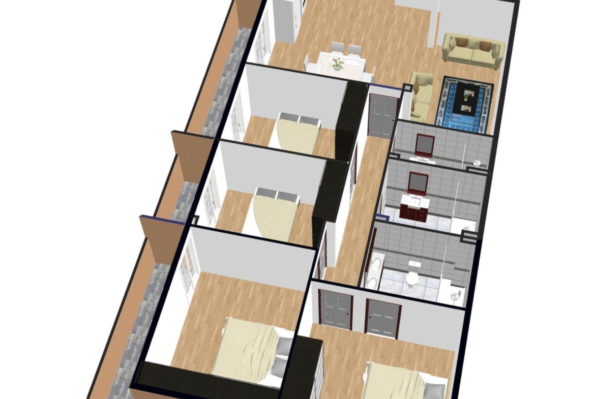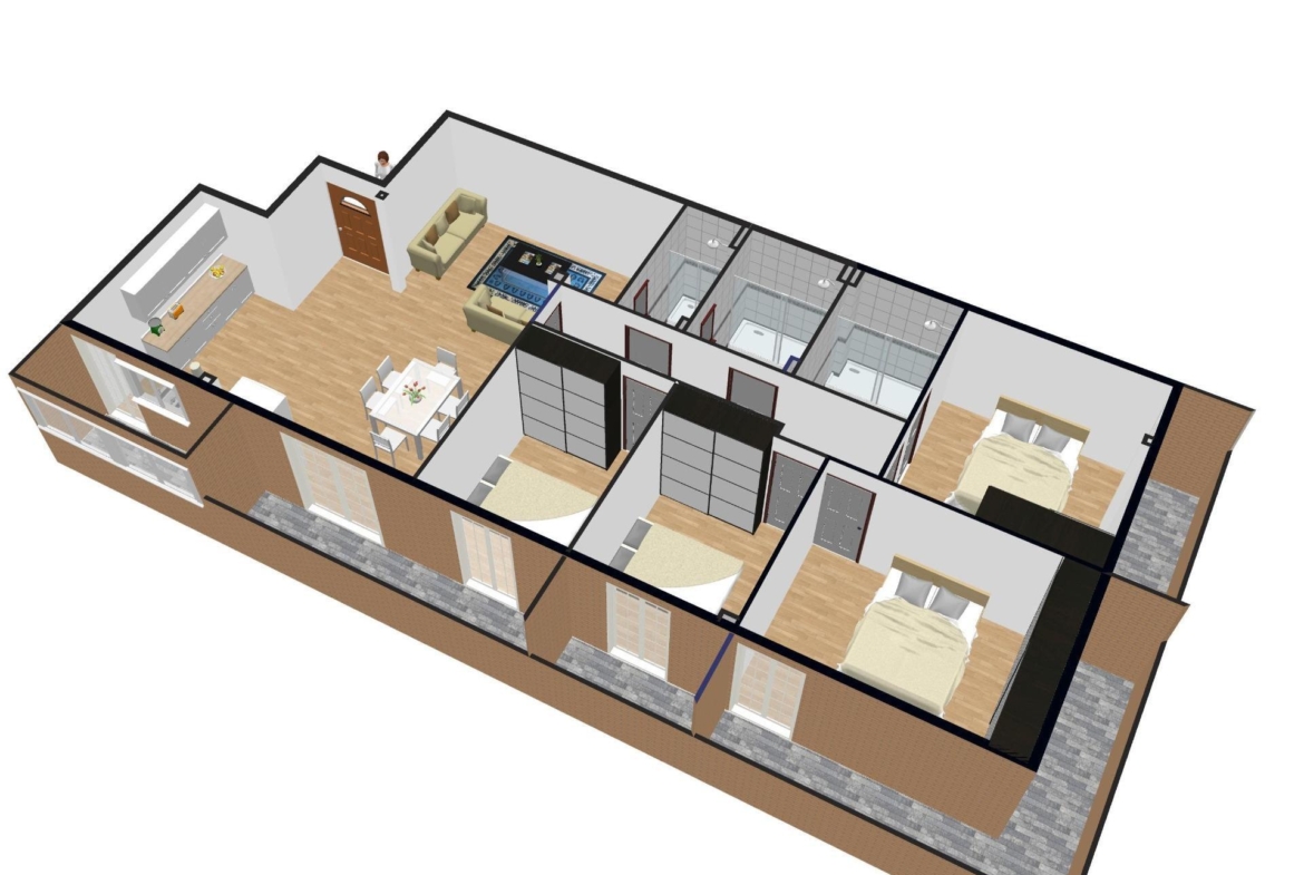Es muy luminoso gracias a su altura en la octava planta, a que es totalmente exterior haciendo esquina, a su doble orientación norte y oeste, y a su terraza perimetral que rodea toda la vivienda. Actualmente se distribuye en cuatro habitaciones, la principal con baño en suite y todas con armarios empotrados, tres cuartos de baño, un amplio salón comedor con salida a la terraza, una buena cocina independiente con terraza tendedero y un hall recibidor. Los planos en tres dimensiones de este anuncio ofrecen la recreación en 3D de una posible reforma. También se han tratado con inteligencia artificial las fotos de algunas estancias para ofrecer la imagen de cómo podrían quedar reformadas.