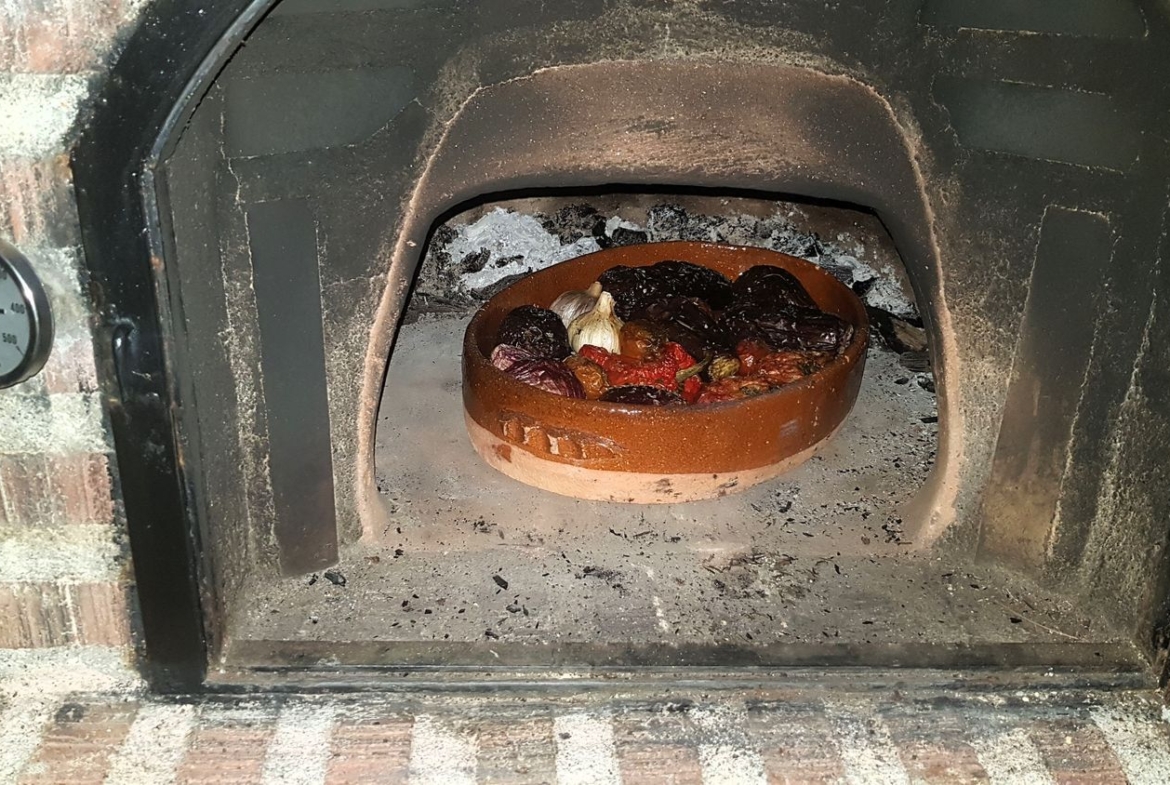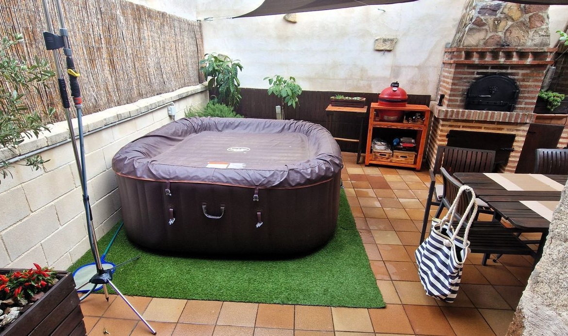 Patio posterior. Está equipado con un horno de leña de barro de Pereruela y una parrilla de tres niveles con plancha, ambas encastradas en una obra de fábrica con chimeneas. Se dispone de una bancada para la realización de paellas, guisos o asados con leña o gas. Está equipado con un SPA desmontable (en invierno) de 2×2 m y capacidad de 6 personas, modelo Lay-Z-Spa (Maldives) marca Bestaway con Airjet y Hidrojet. Se entrega con velas tensadas y fijadas con cables de acero, sillas y mesa de 2×1 m (desmontables). También con maceteros de madera maciza e iluminación led.
