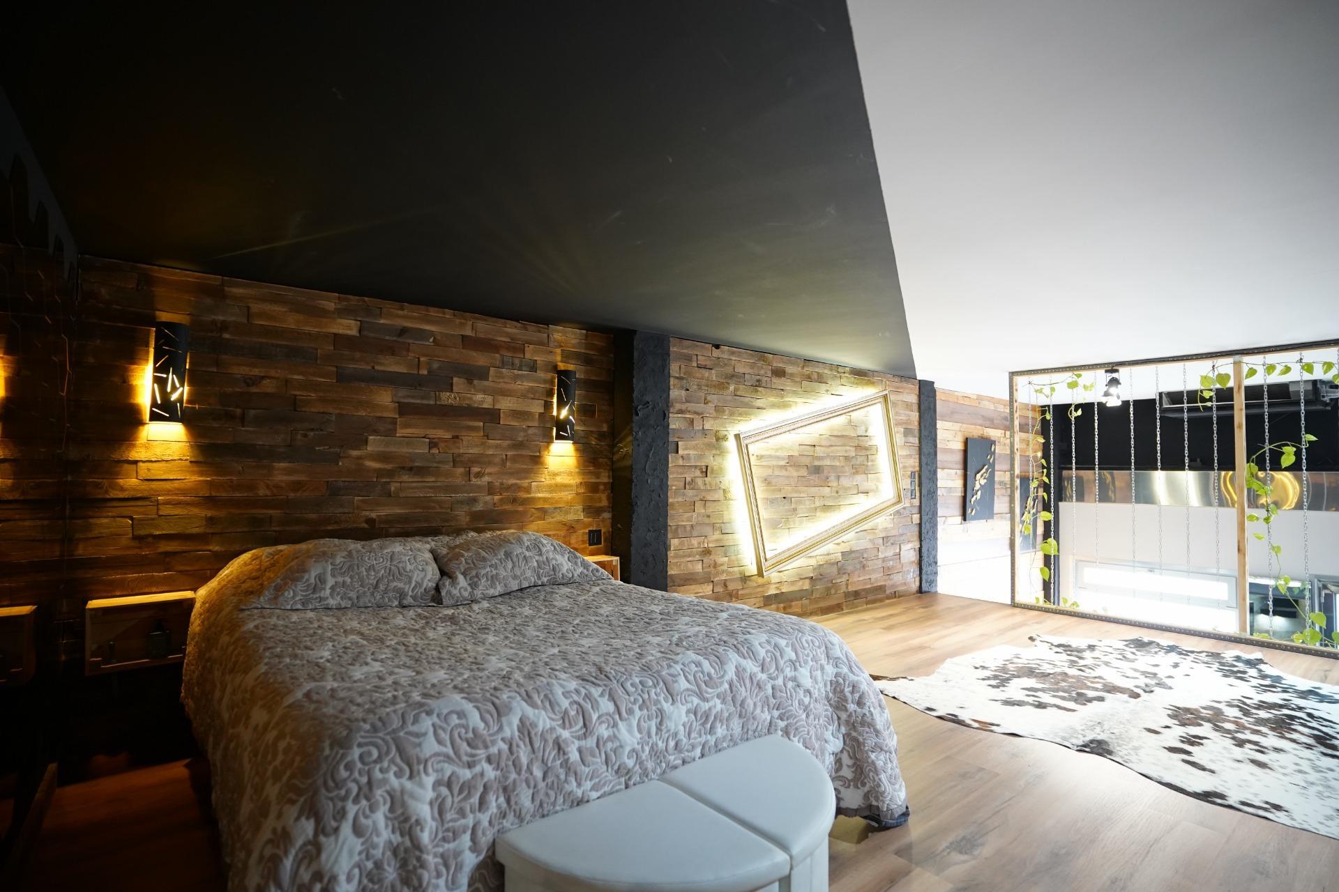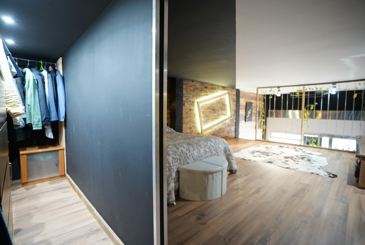 Una elegante escalera de madera comunica con la planta superior, un espacio abierto donde se ubica el dormitorio con un amplio vestidor con ventana. En esta planta, la tarima de madera aporta calidez y confort, creando un ambiente íntimo y acogedor. La iluminación indirecta de todas las estancias le da un plus ambiente muy agradable.