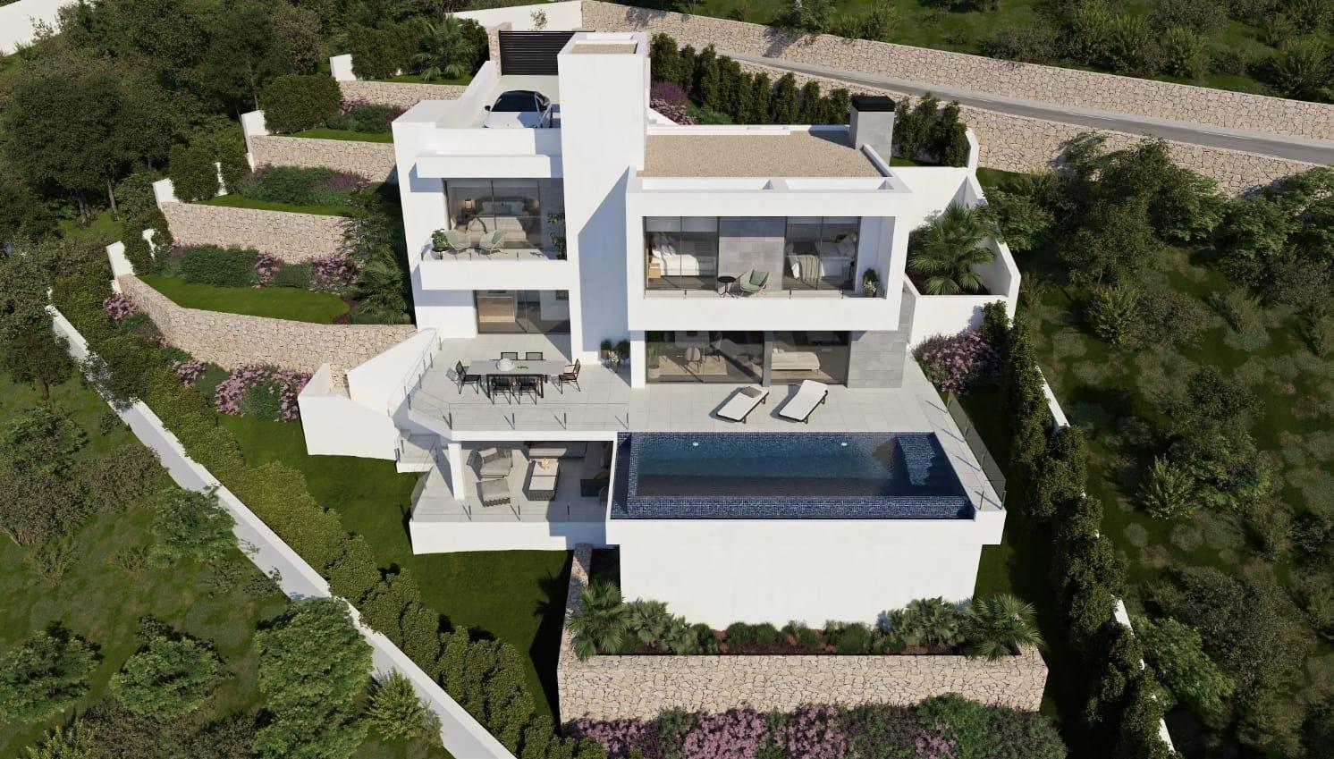 Esta villa de lujo está diseñada en 4 niveles. Accedemos a la vivienda por la planta alta, dónde tenemos el aparcadero, cubierto con una vela y el ascensor que nos comunica con el resto de la vivienda. La siguiente planta está dedicada a los dormitorios, todos con acceso a terrazas privadas que ofrecen impresionantes vistas y garantizan la entrada de luz natural.