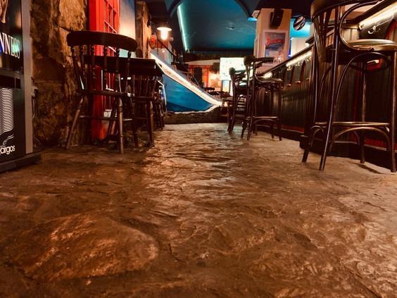 La carpintería interior y exterior es de madera. Dentro del bar hay excelentes estantes de madera. Los suelos del local han sido renovados, siendo de tarima de madera.