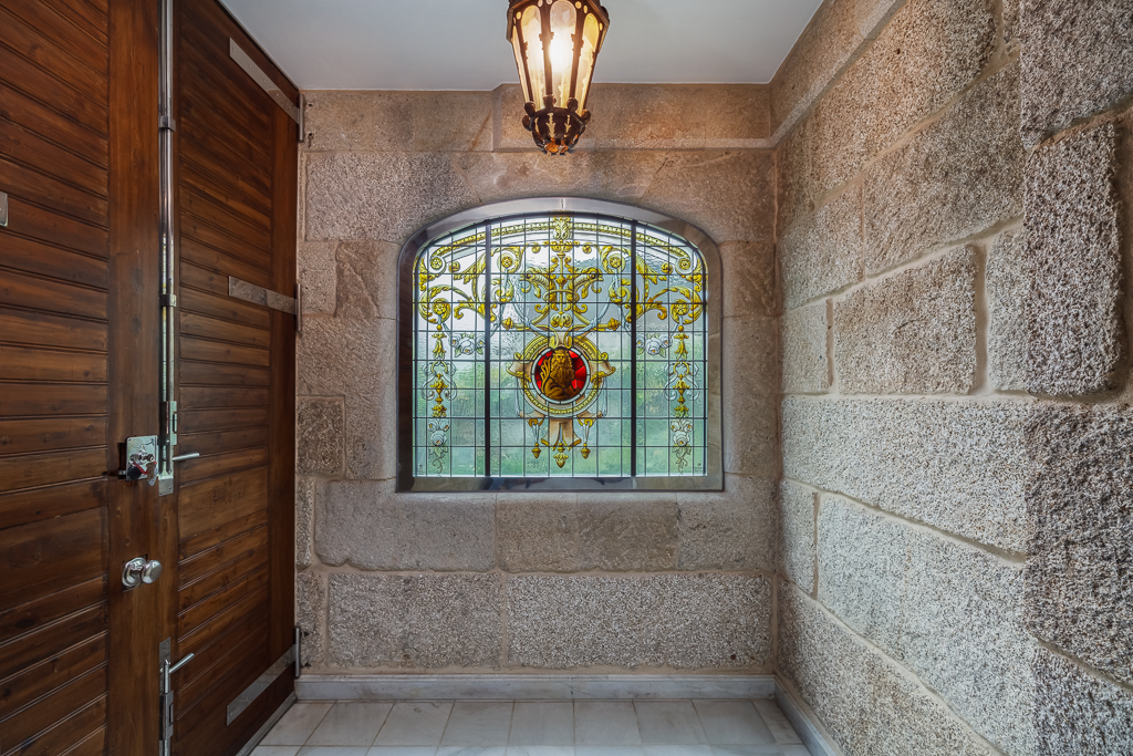Magnífica puerta principal muy bien restaurada y ya en el interior, en el vestíbulo, una preciosa vidriera francesa que deja pasar la luz aportando calidez a la estancia.