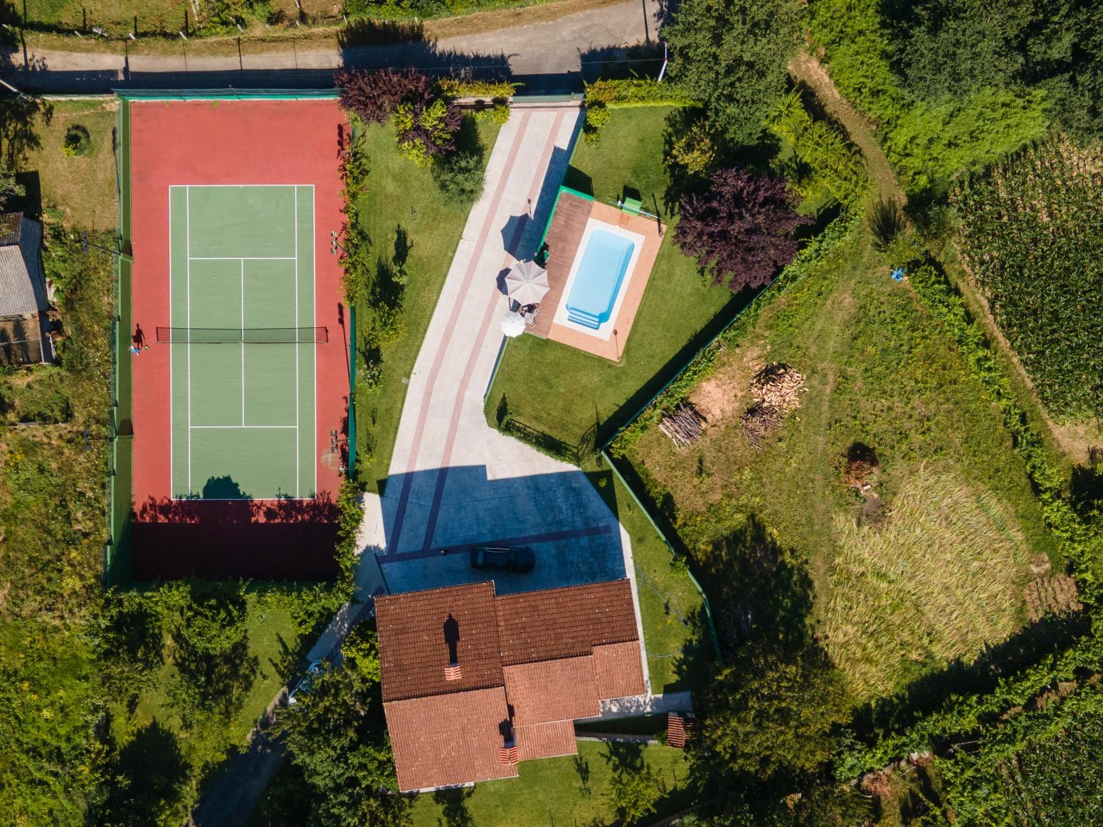 La zona exterior es la mejor de la propiedad. Nada más salir de la casa encontramos el jardín con una piscina de 47m2 con un área de madera perfecta para tomar el sol y un chill out a la sombra de los árboles. En el otro lado, la propiedad cuenta con una pista de tenis reglamentaria.