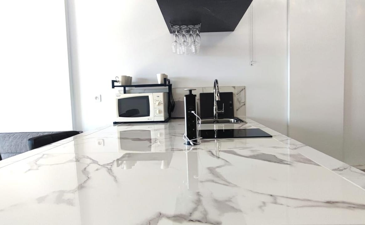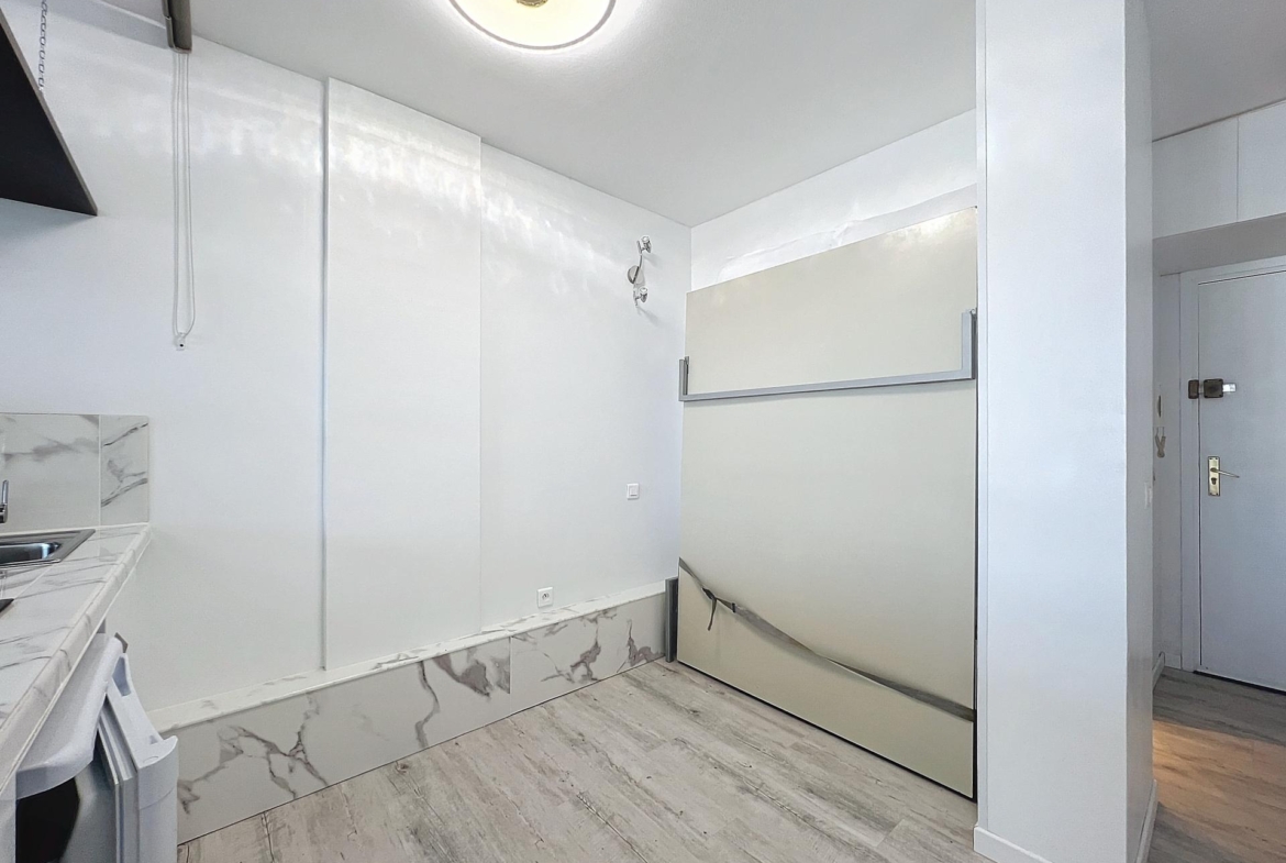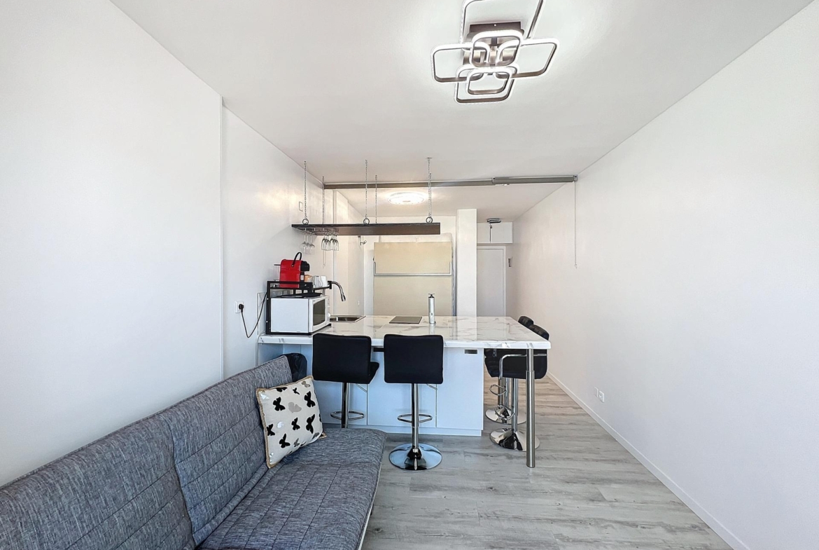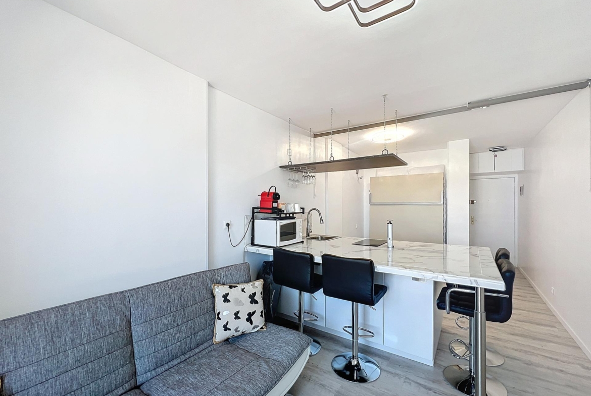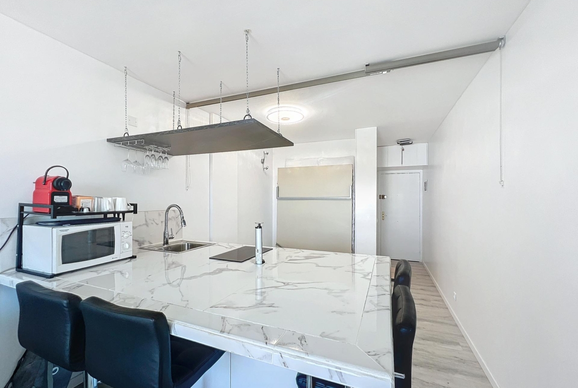 La cocina está totalmente equipada con electrodomésticos de calidad, mientras que el baño es elegante y bien acabado. El gran ventanal ofrece una vista espléndida, asegurando un ambiente relajante y luminoso.