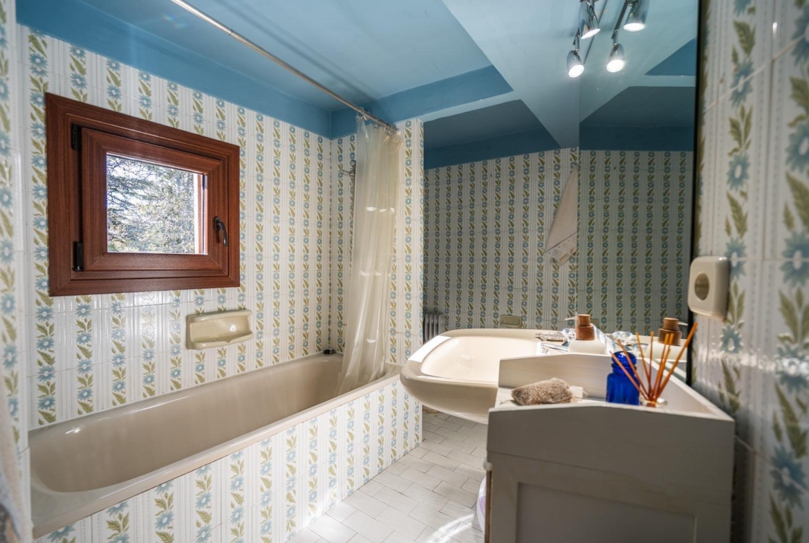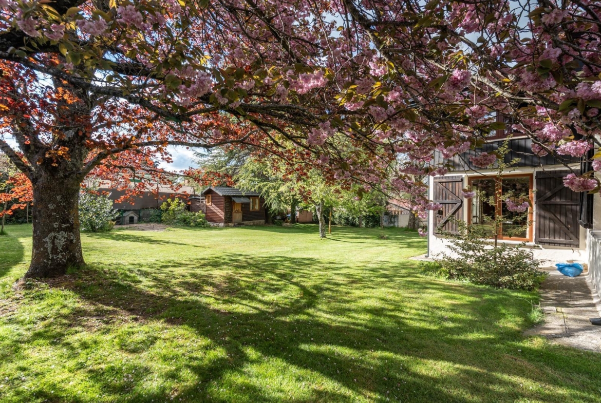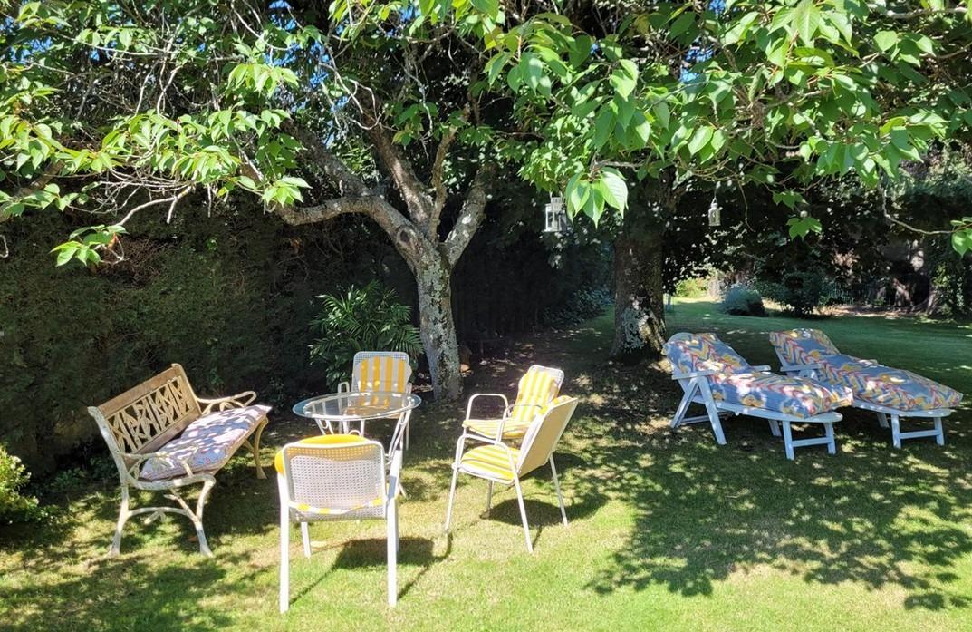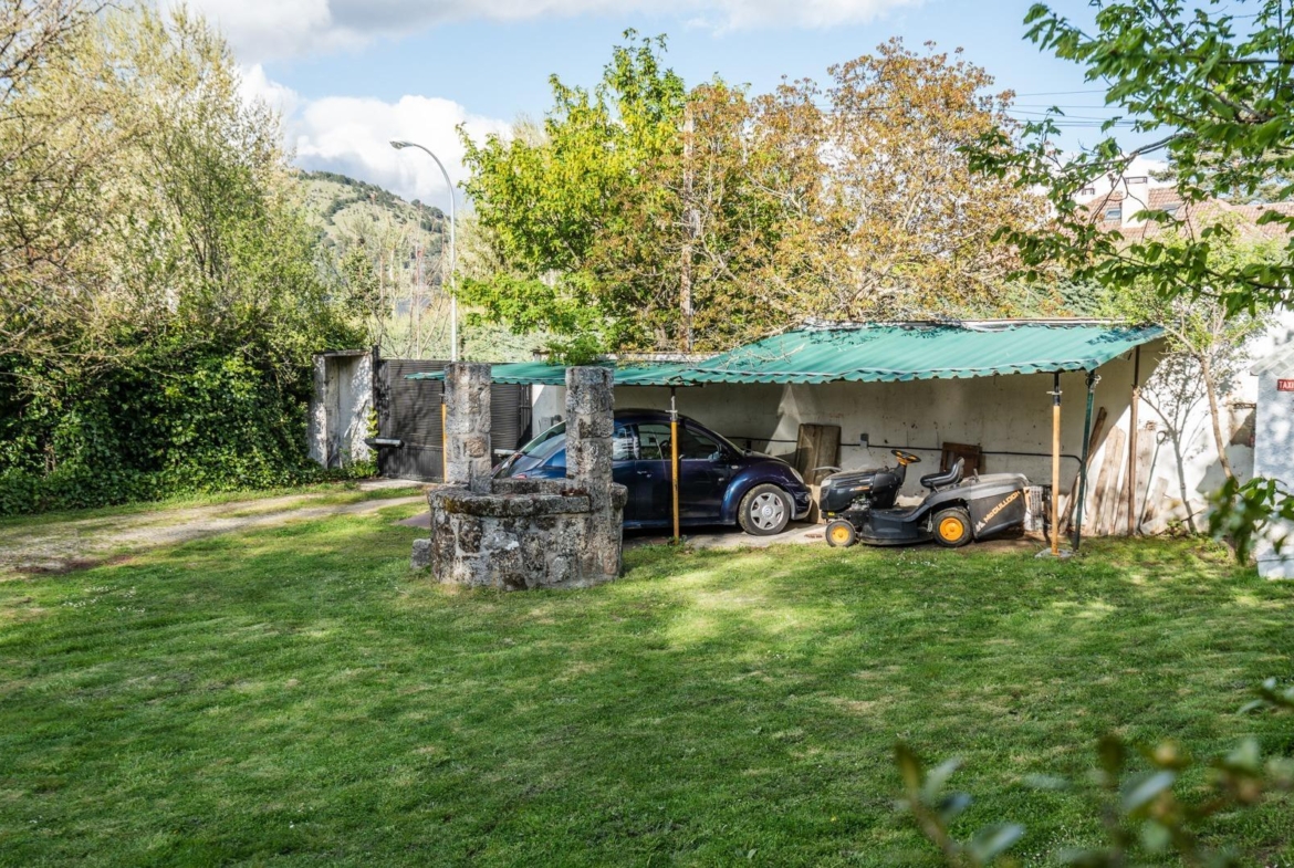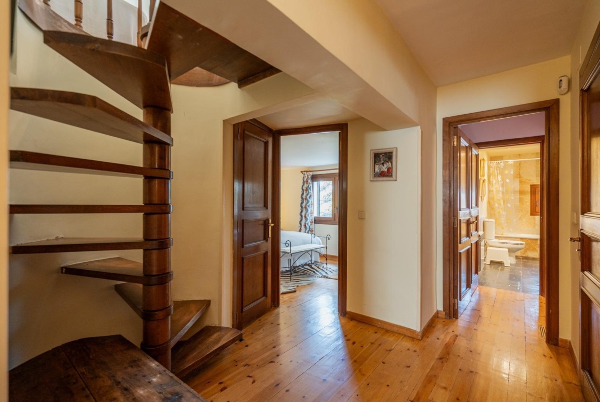 El exterior es, sin duda, uno de los grandes protagonistas. Un jardín perimetral cuidadosamente diseñado, con césped natural y sistema de riego automático, enmarca la propiedad y realza su encanto. Entre su exuberante vegetación destacan un pinsapo centenario, tres cedros, un arce rojo, un árbol del amor, un cerezo japonés, roble, haya, nogal, cinco plátanos de sombra, cuatro avellanos, así como camelias, hortensias y otras especies ornamentales. Todo ello complementado por un pozo propio y una encantadora casita de madera habitable, dotada con todos los servicios, perfecta como espacio independiente.