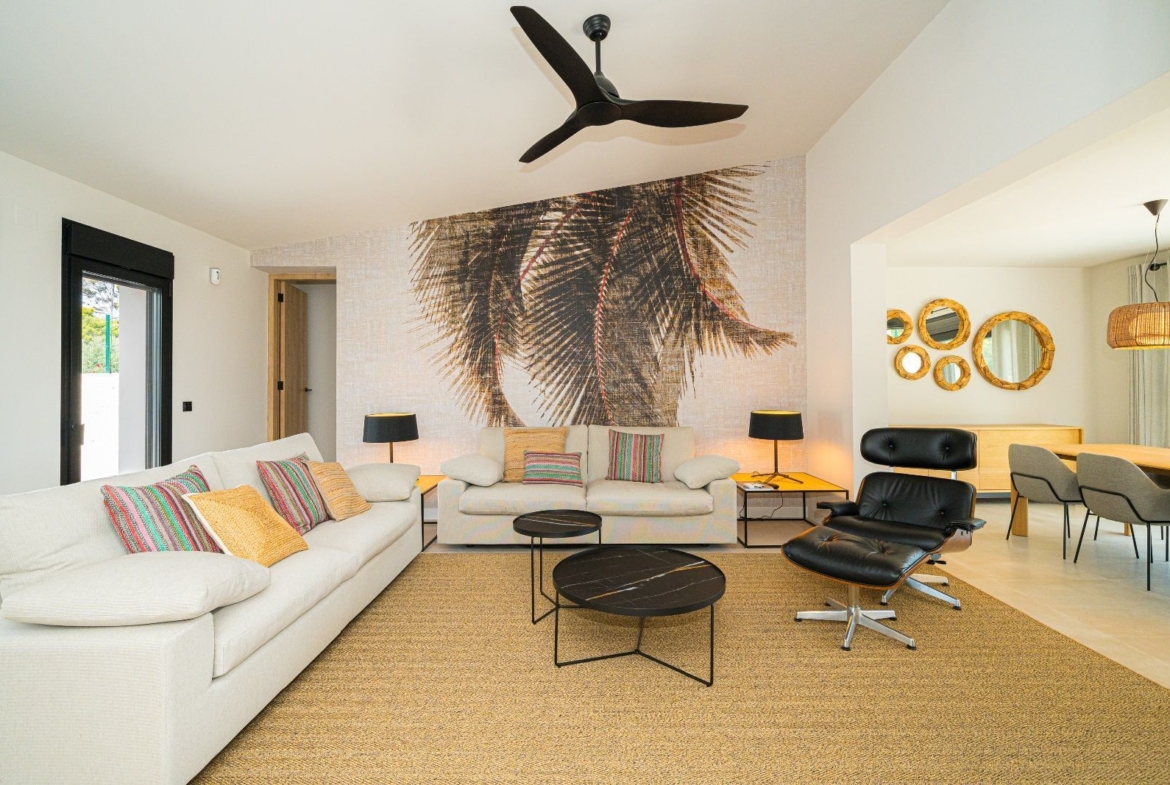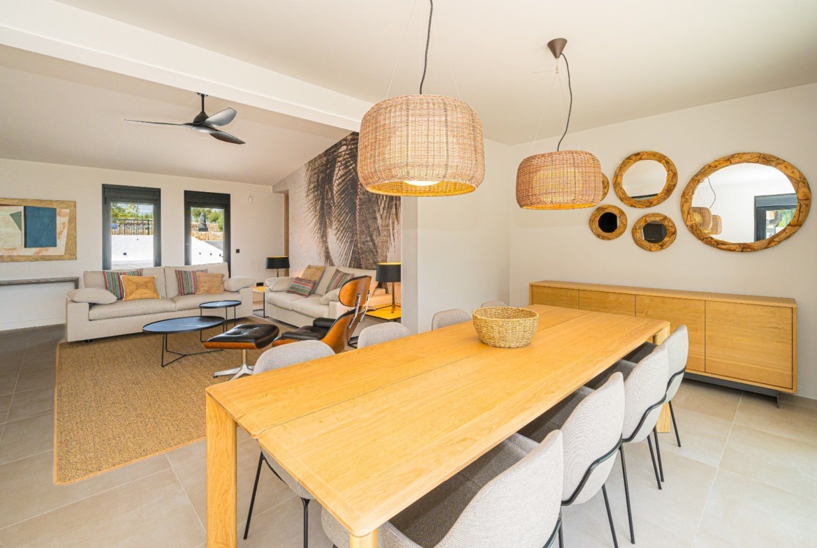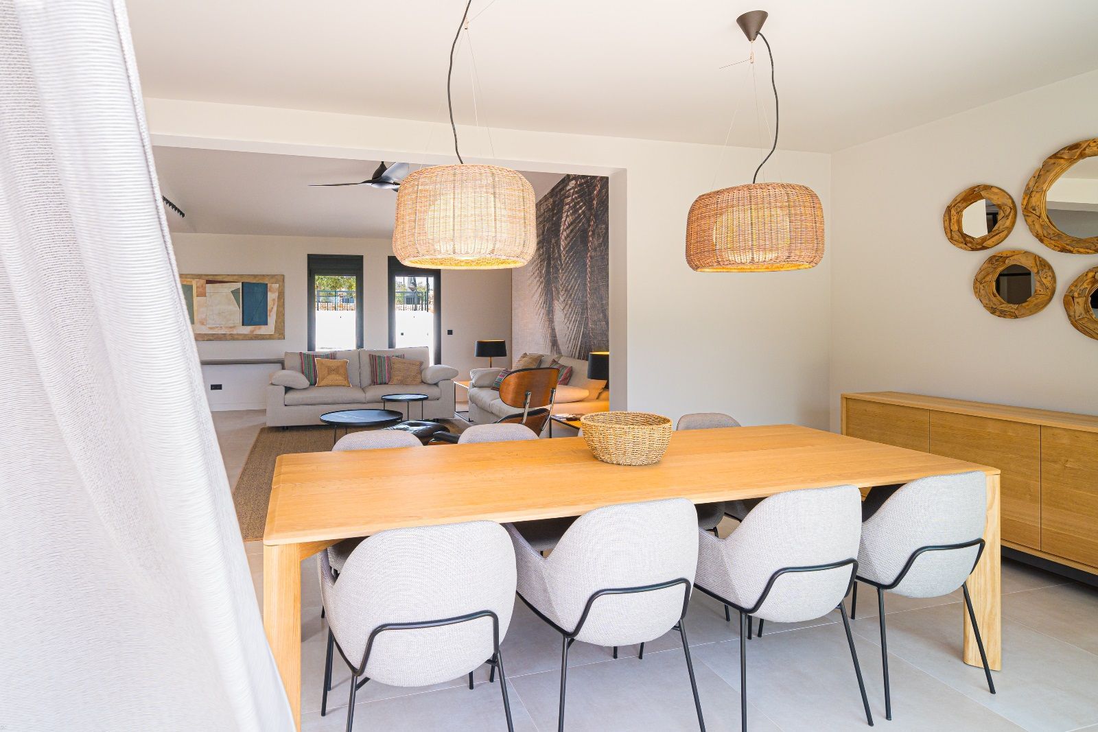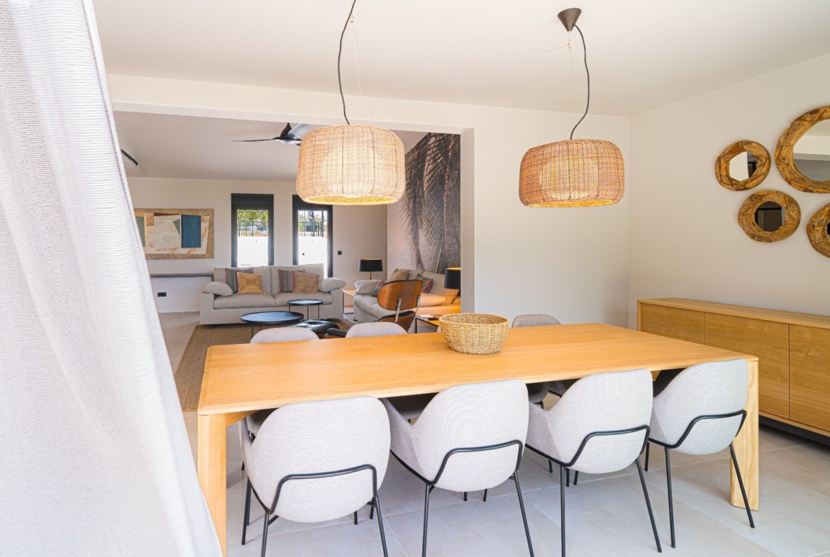 El salón-comedor es una invitación al relax y al disfrute en compañía de tus seres queridos. Los amplios ventanales permiten que la luz natural inunde el espacio, creando una atmósfera luminosa y relajante. Desde aquí, podrás acceder directamente a la zona de la piscina privada, donde podrás darte un chapuzón y disfrutar de las vistas al mar y las montañas.