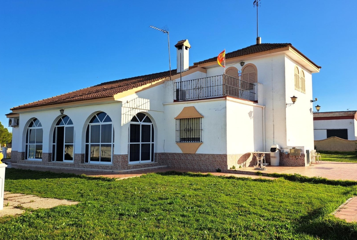 El complejo, de 223.440 m² registrales, cuenta con una vivienda muy cuidada de 220 m², según datos catastrales, que cuenta con 6 dormitorios, dos baños completos (uno de ellos adaptado), un gran salón comedor con chimenea, amplia cocina, bodega y porche acristalado. La vivienda se encuentra rodeada de un gran jardín, dispone de una gran piscina, una pista deportiva y un espectacular mirador hacia Sevilla,.