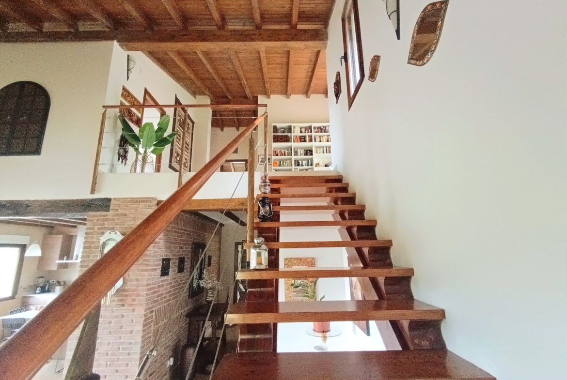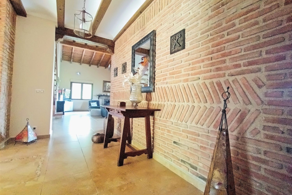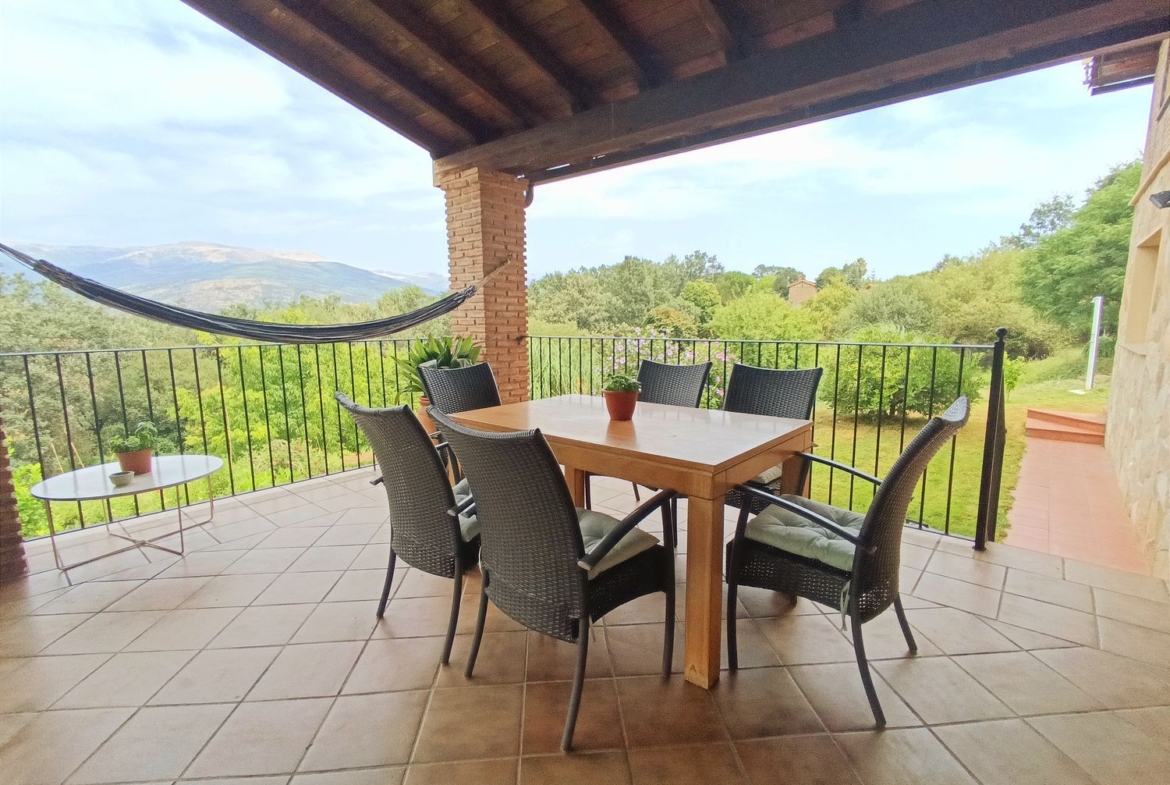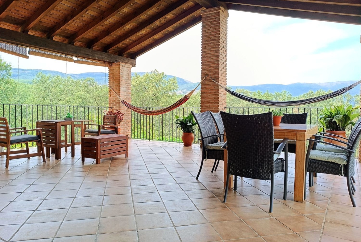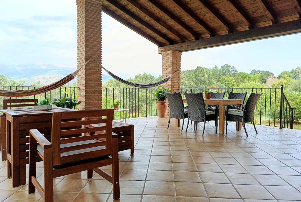 – Ambientes Cálidos, modernos y Acogedores: Techos interiores de madera con vigas vistas, chimenea de hierro fundido, y un porche con vistas a la Sierra de Gredos y al Monasterio de Yuste.