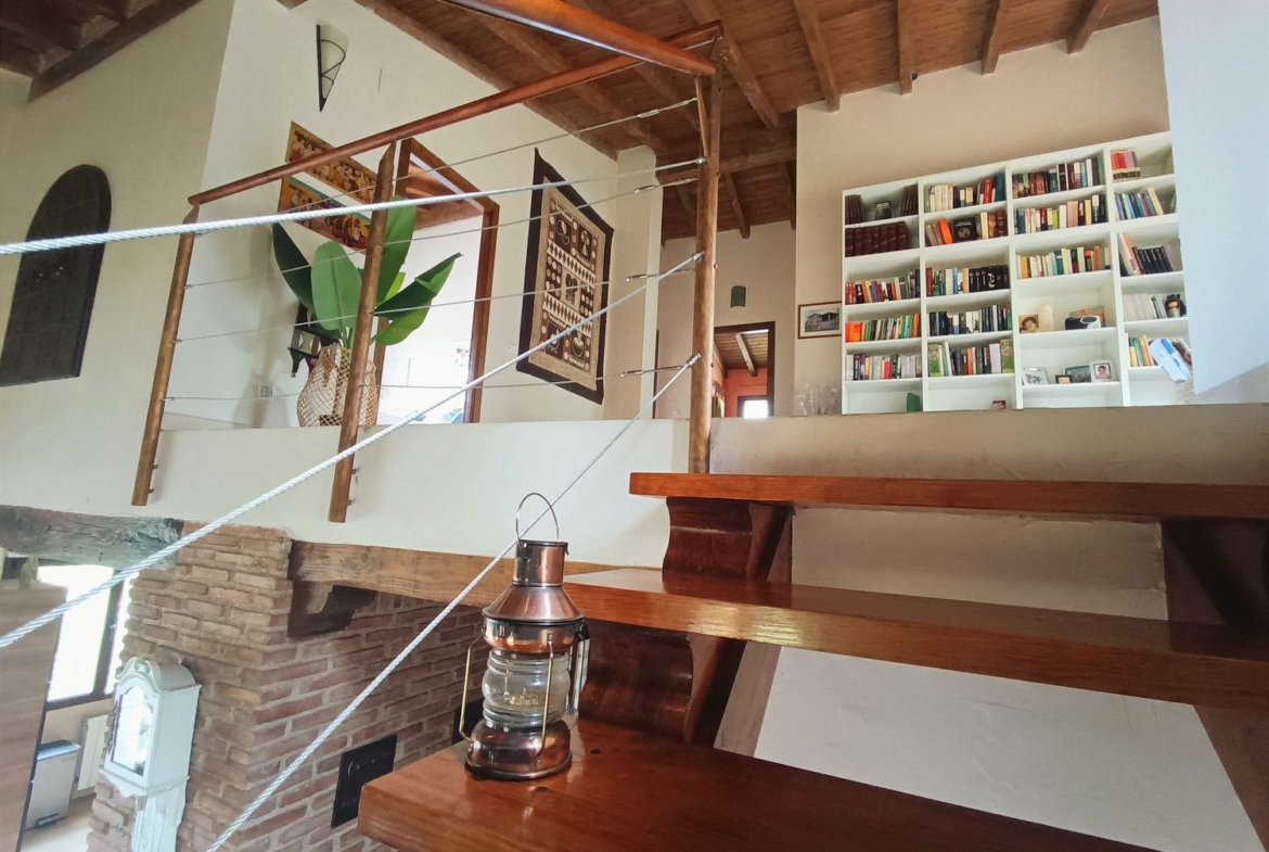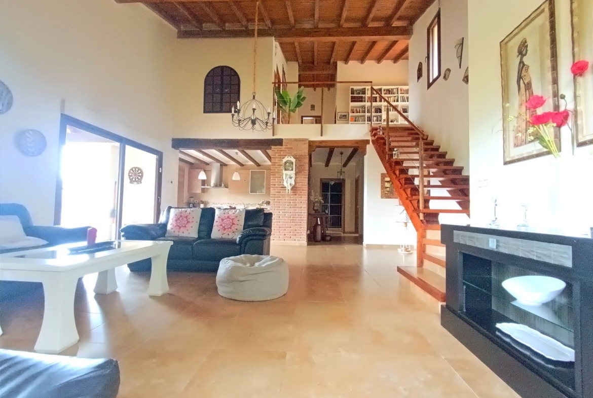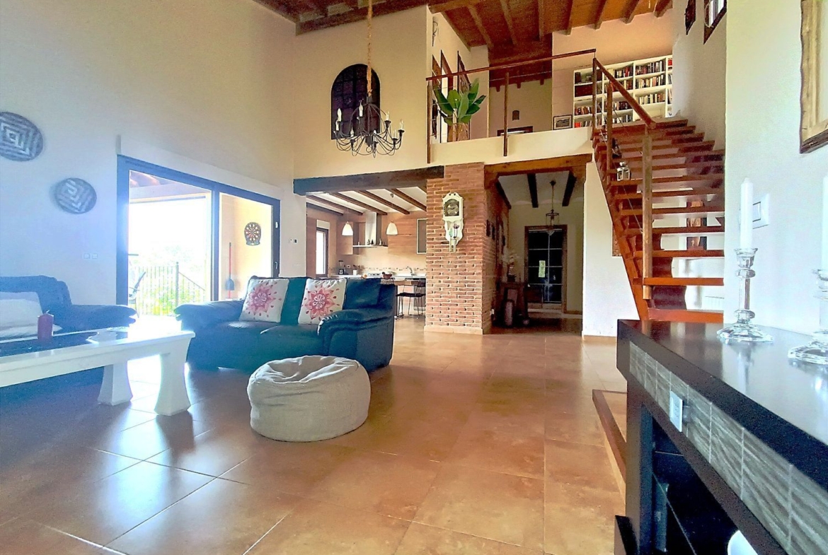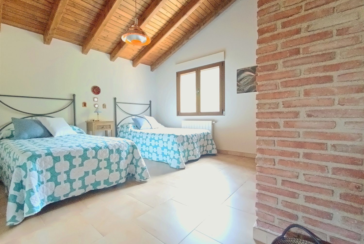 – Ambientes Cálidos, modernos y Acogedores: Techos interiores de madera con vigas vistas, chimenea de hierro fundido, y un porche con vistas a la Sierra de Gredos y al Monasterio de Yuste.