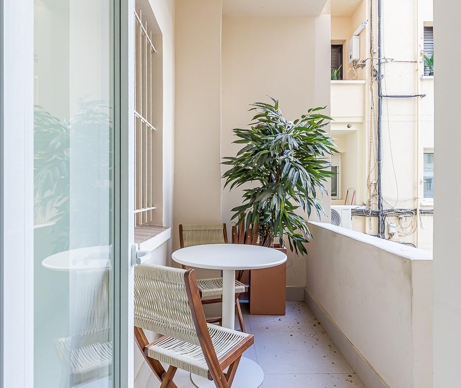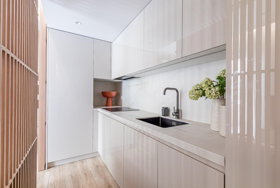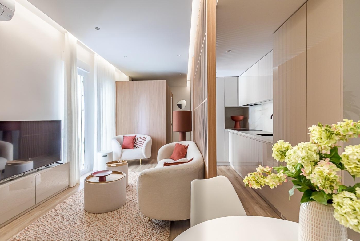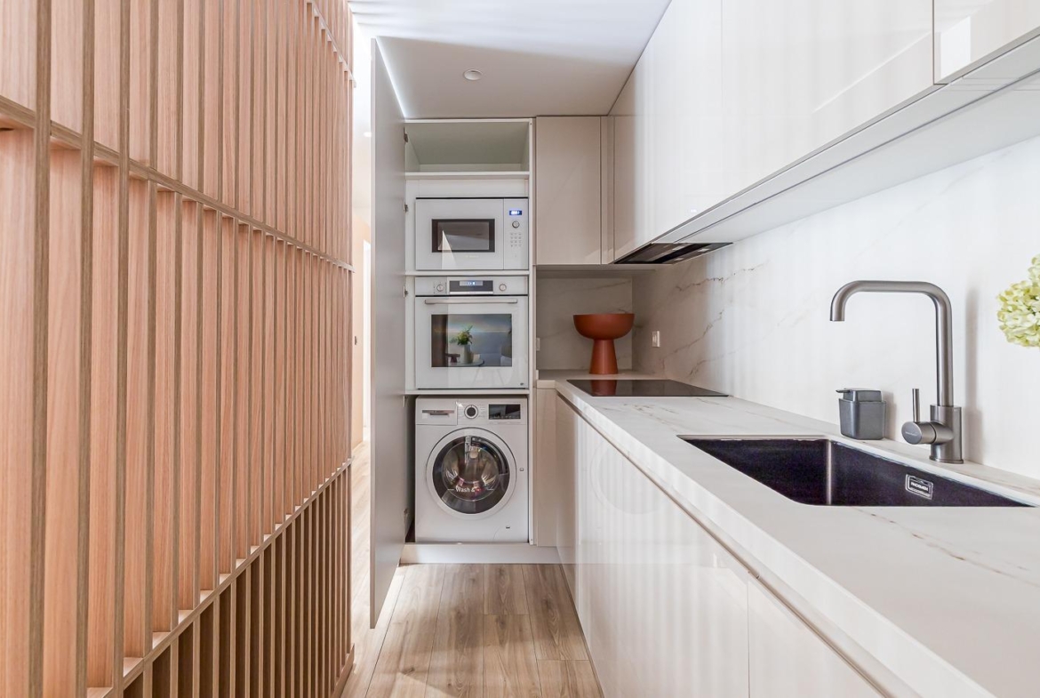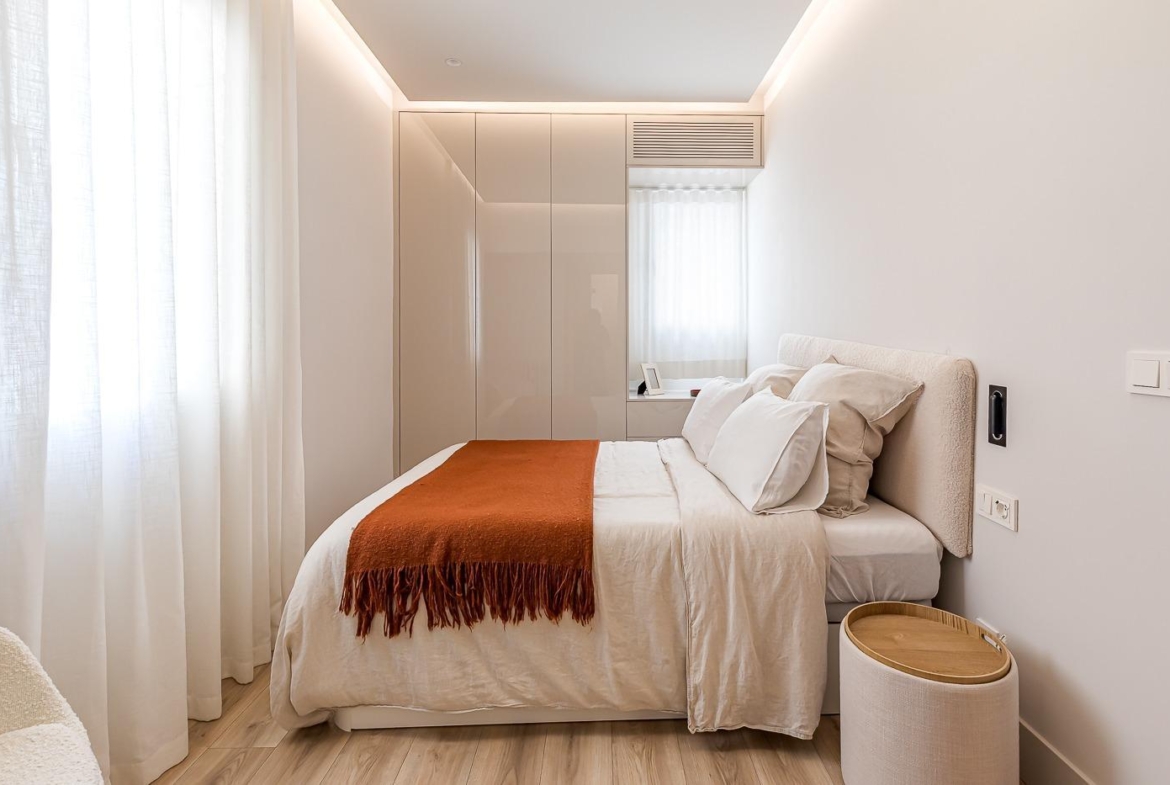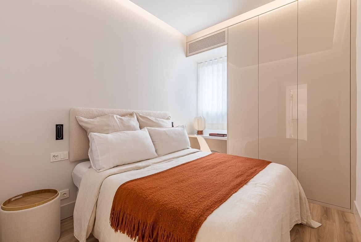 La vivienda, de 77 metros cuadrados, ha sido reformada con un diseño contemporáneo y materiales de altísima calidad. La distribución es inteligente y funcional, con espacios luminosos y perfectamente aprovechados. Al entrar tenemos un salón comedor y una cocina totalmente equipada y separada con una estética celosía. El salón cuenta con una agradable terraza. De frente discurre un pasillo que nos lleva a los dos dormitorios en suite que cuentan con su baño privado ofreciendo el máximo confort y privacidad. Los acabados de lujo, los suelos de madera natural, la cocina de diseño y la cuidada iluminación hacen de esta propiedad un auténtico oasis urbano para quienes buscan estilo, calidad y bienestar.