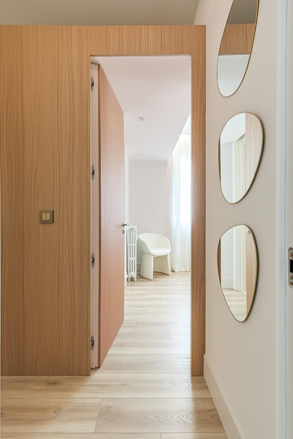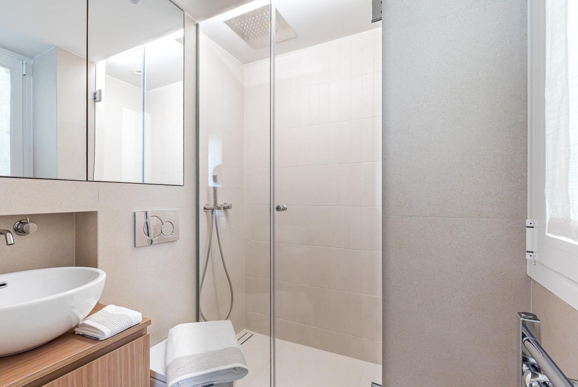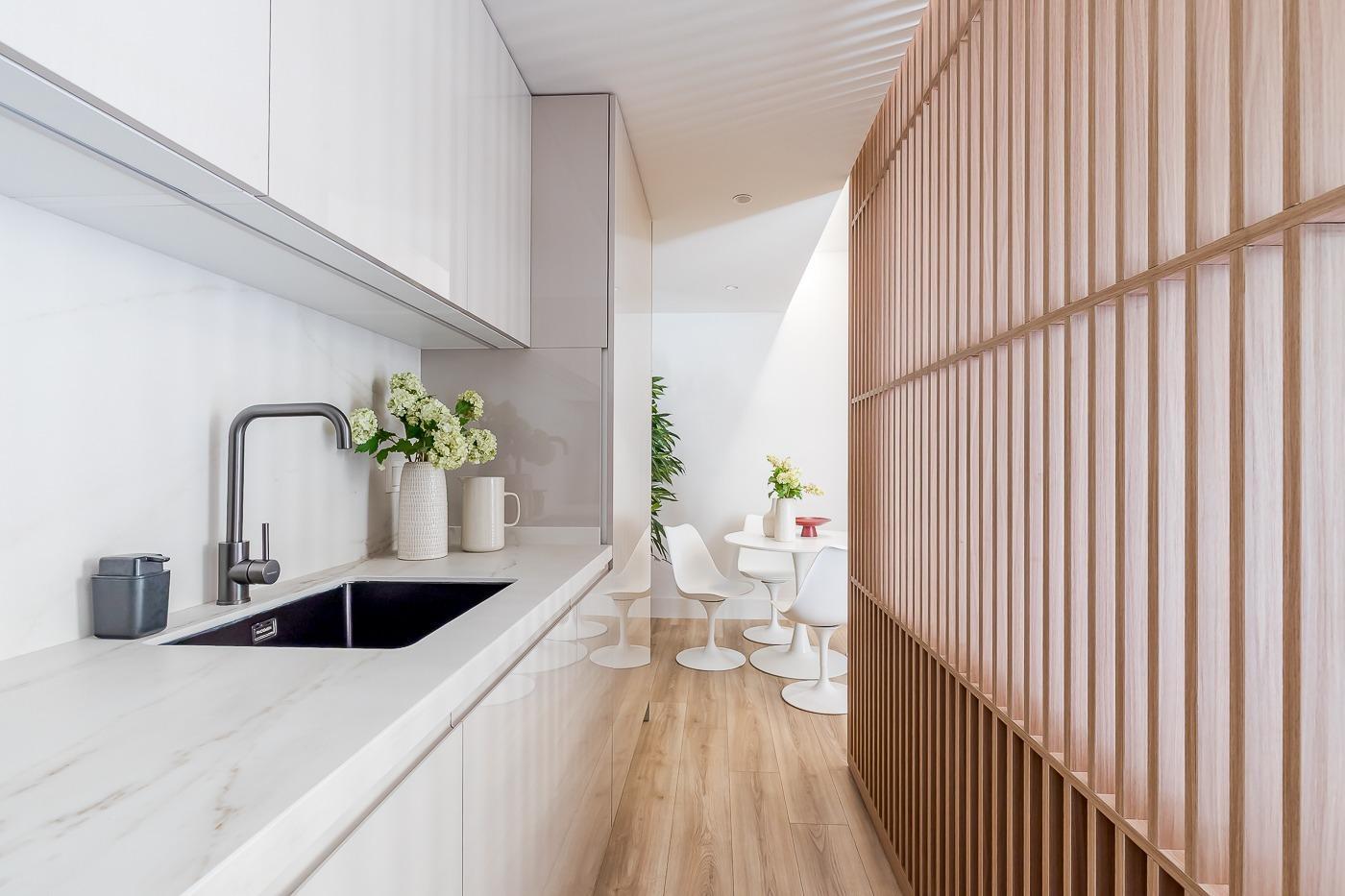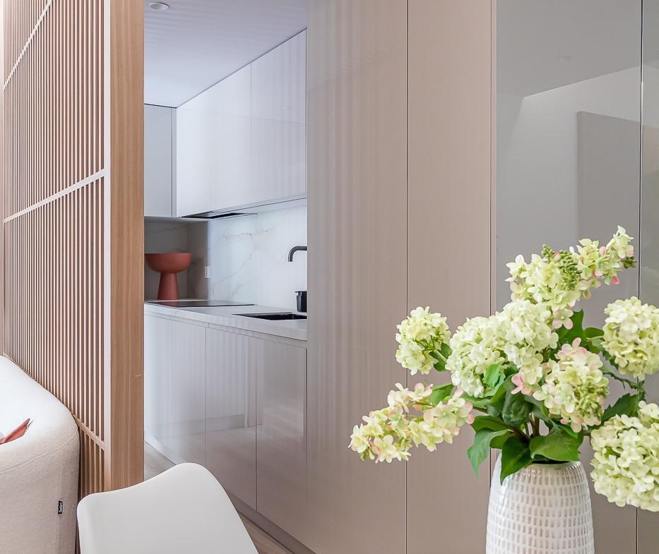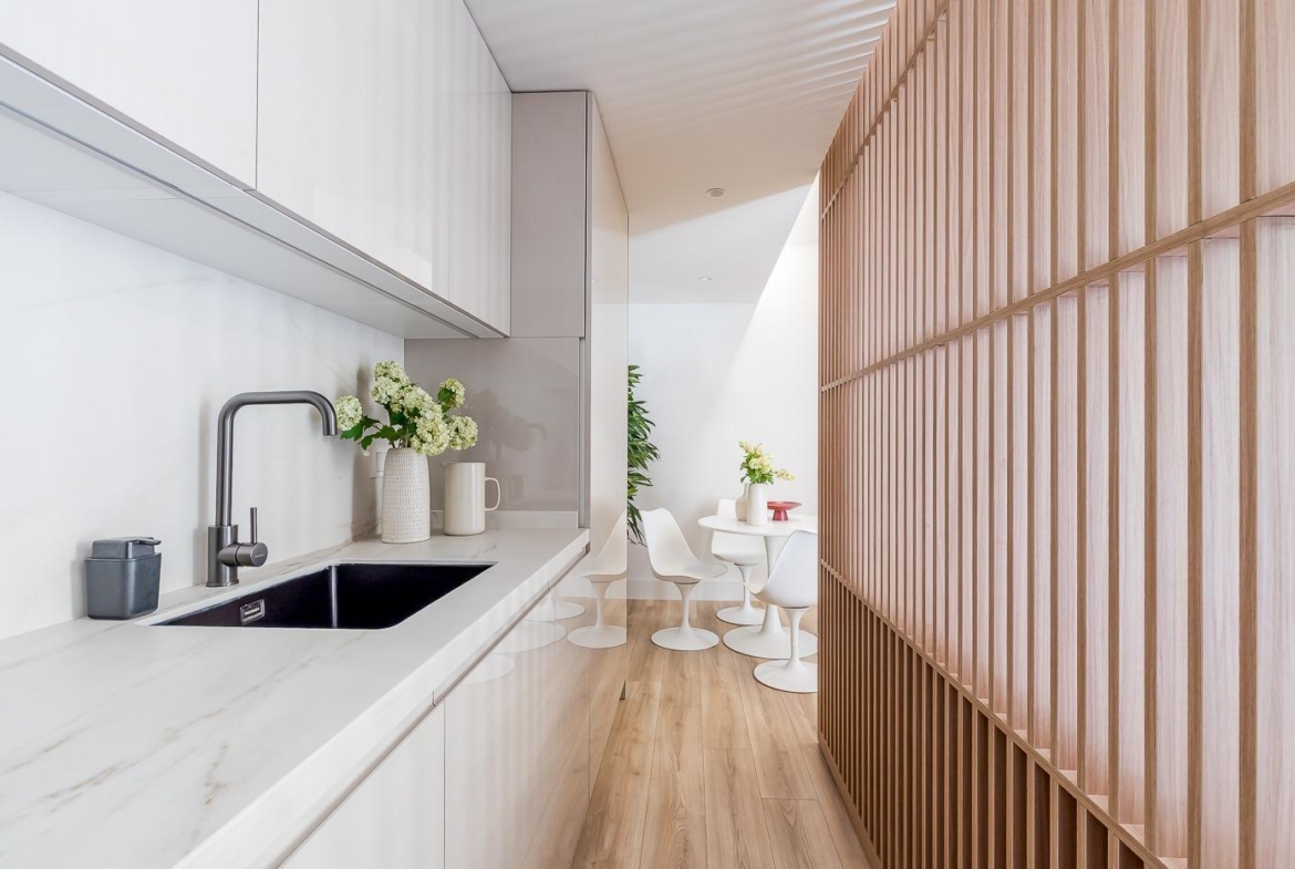 La vivienda, de 77 metros cuadrados, ha sido reformada con un diseño contemporáneo y materiales de altísima calidad. La distribución es inteligente y funcional, con espacios luminosos y perfectamente aprovechados. Al entrar tenemos un salón comedor y una cocina totalmente equipada y separada con una estética celosía. El salón cuenta con una agradable terraza. De frente discurre un pasillo que nos lleva a los dos dormitorios en suite que cuentan con su baño privado ofreciendo el máximo confort y privacidad. Los acabados de lujo, los suelos de madera natural, la cocina de diseño y la cuidada iluminación hacen de esta propiedad un auténtico oasis urbano para quienes buscan estilo, calidad y bienestar.