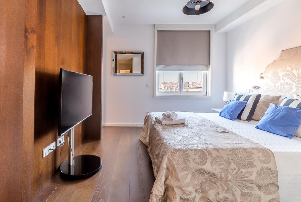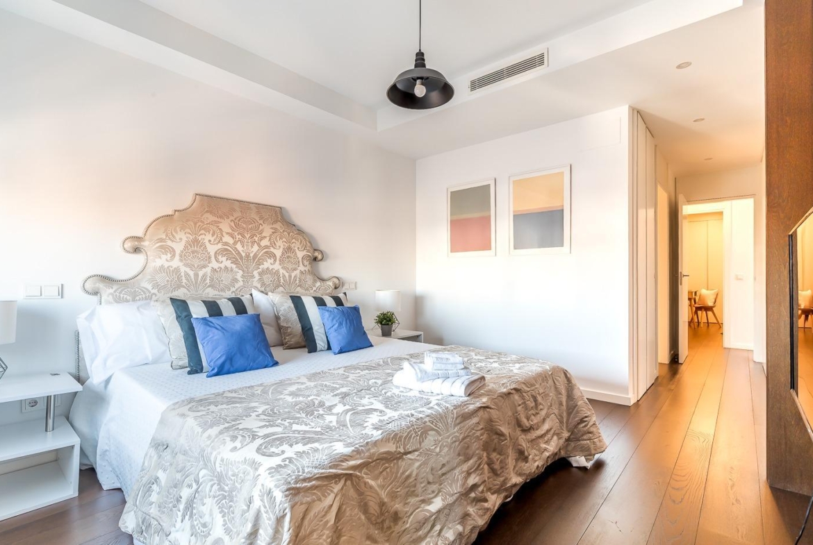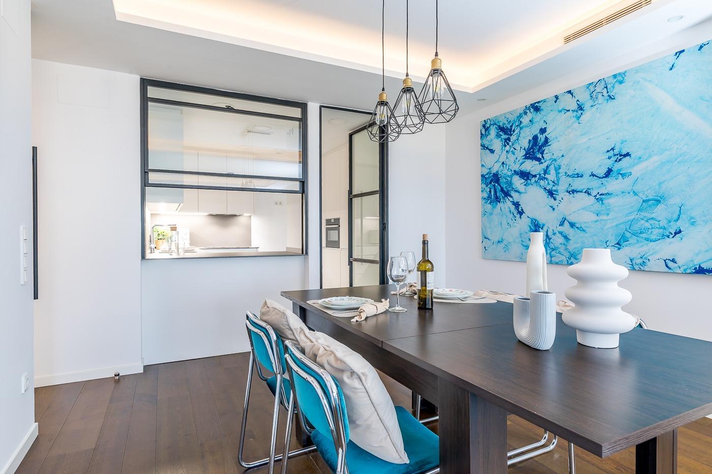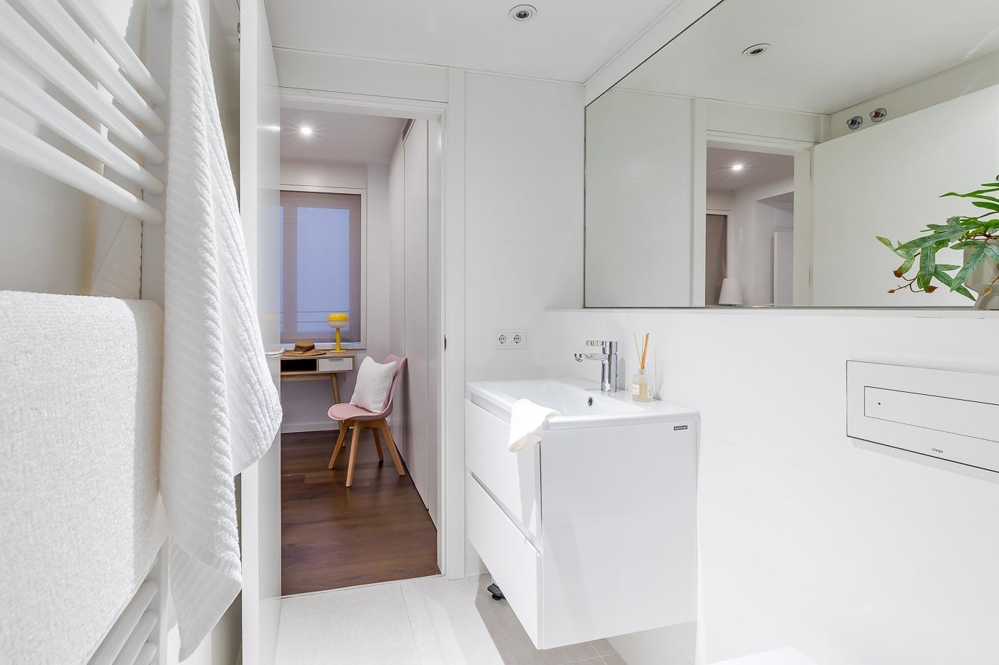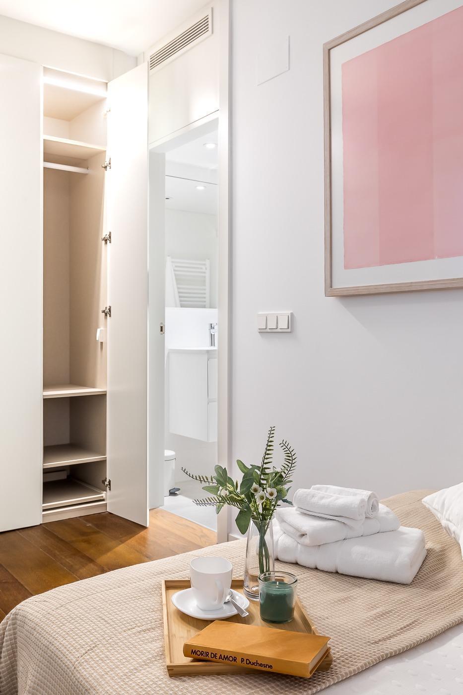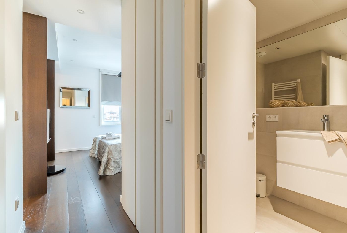 Este piso de dos habitaciones en la octava planta de un edificio en las cercanías de Plaza España se distribuye: al entrar con un amplio hall alargado en el que tenemos un armario empotrado de gran capacidad, a la izquierda una puerta nos lleva al dormitorio secundario con baño incorporado en suite, a la derecha el dormitorio principal también con baño incluido y zona de vestidor, desde el hall de frente accedemos al salón-comedor con cocina totalmente equipada con electrodomésticos marca premium separada con una cristalera. El piso es exterior y esta a una buena altura lo que le confiere gran luminosidad.