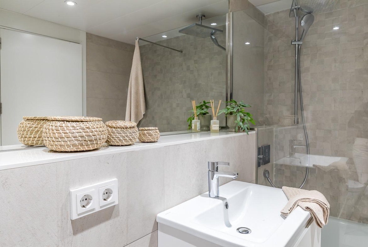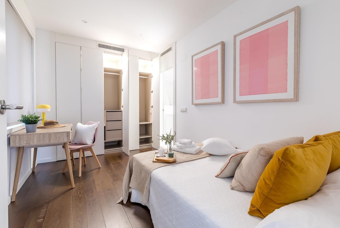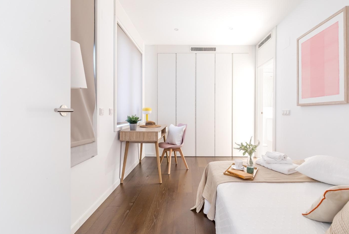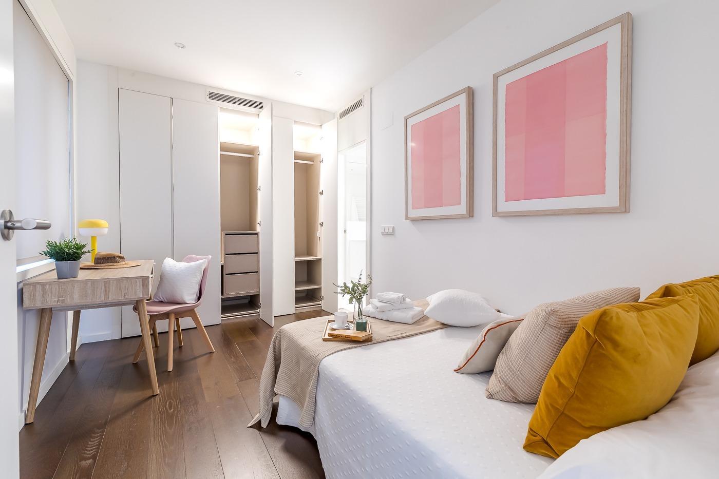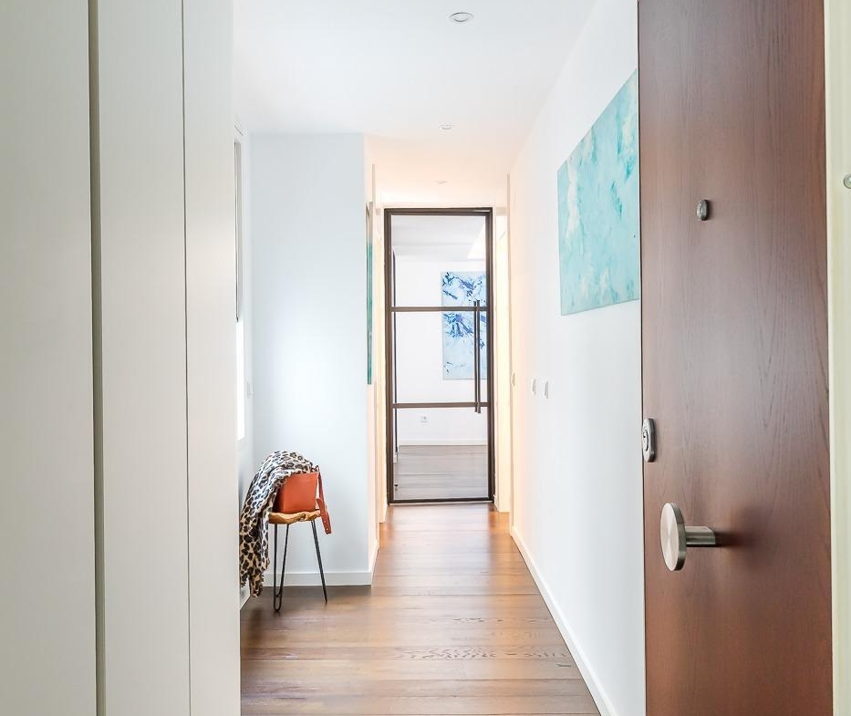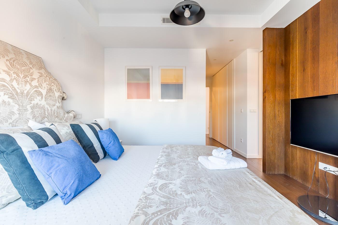 Este piso de dos habitaciones en la octava planta de un edificio en las cercanías de Plaza España se distribuye: al entrar con un amplio hall alargado en el que tenemos un armario empotrado de gran capacidad, a la izquierda una puerta nos lleva al dormitorio secundario con baño incorporado en suite, a la derecha el dormitorio principal también con baño incluido y zona de vestidor, desde el hall de frente accedemos al salón-comedor con cocina totalmente equipada con electrodomésticos marca premium separada con una cristalera. El piso es exterior y esta a una buena altura lo que le confiere gran luminosidad.
