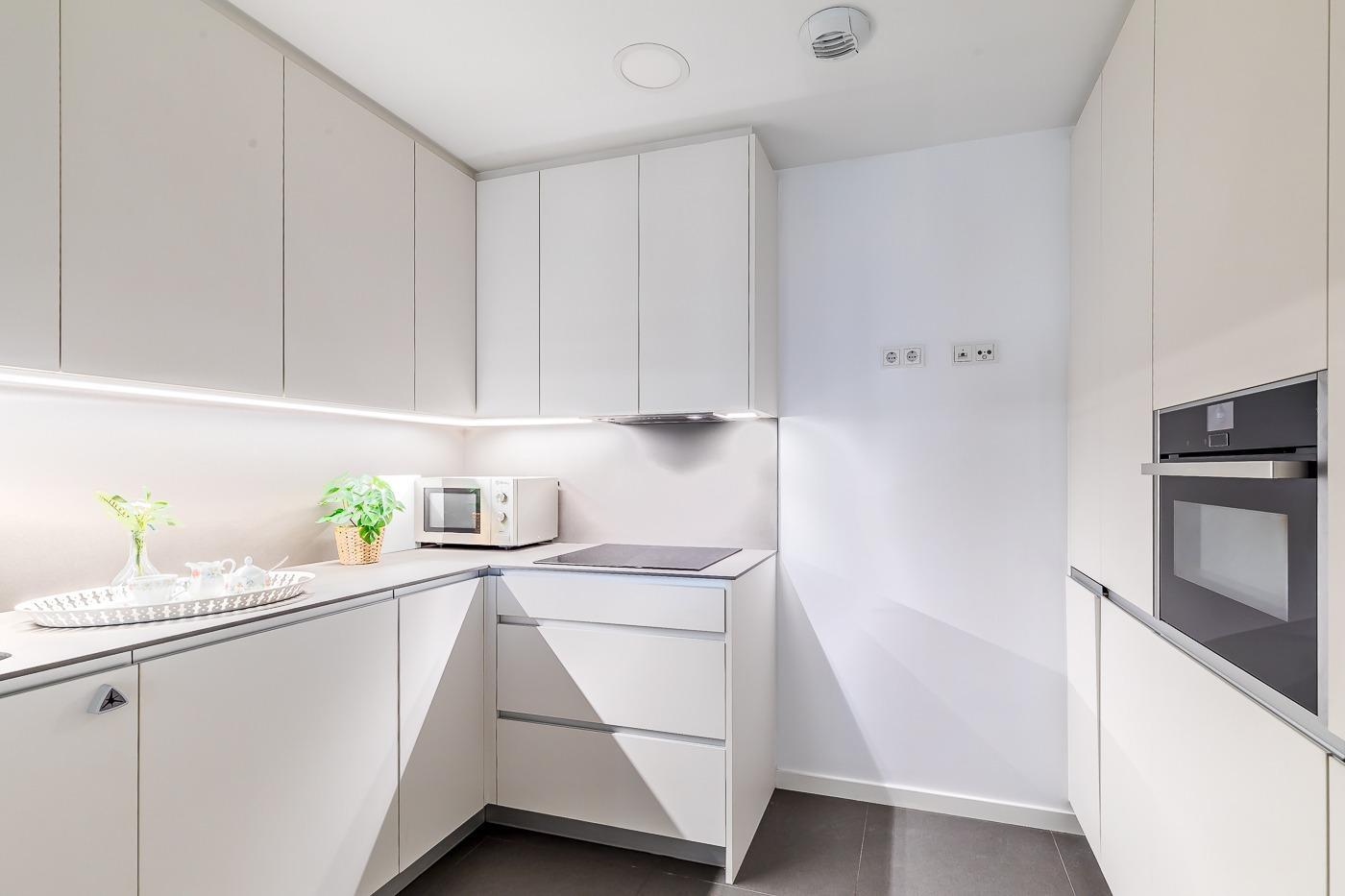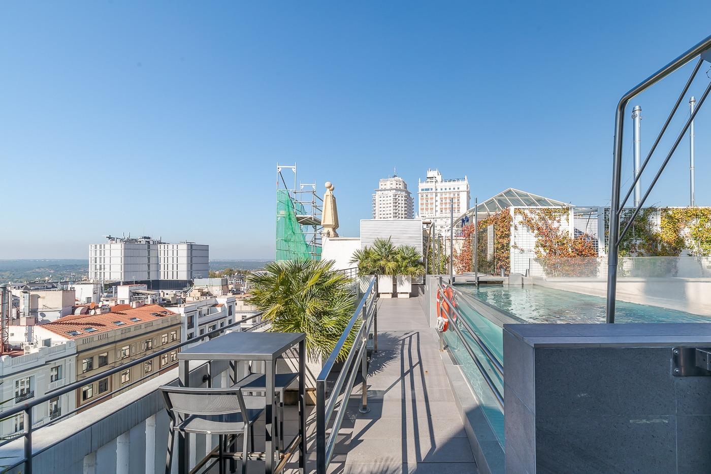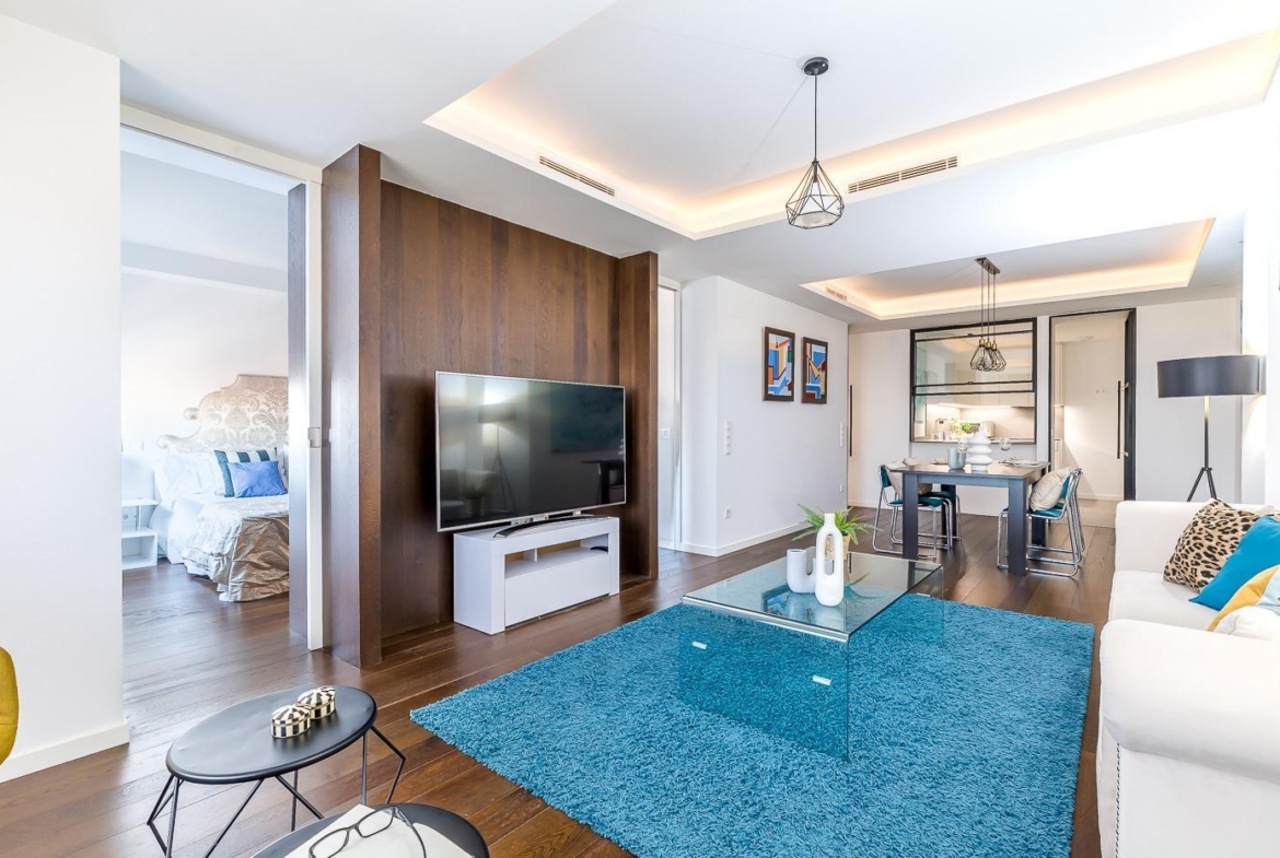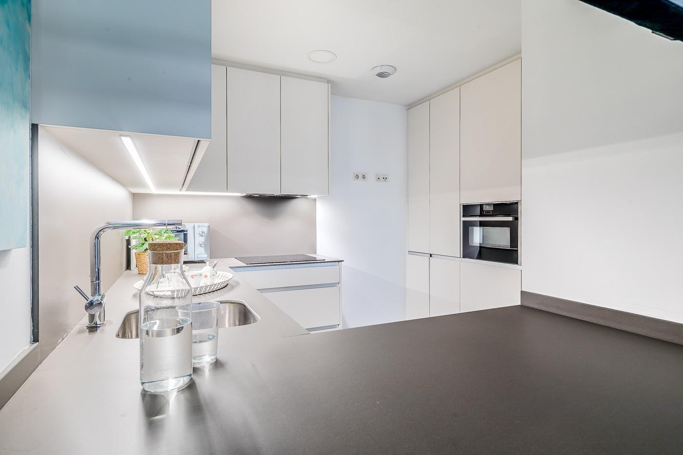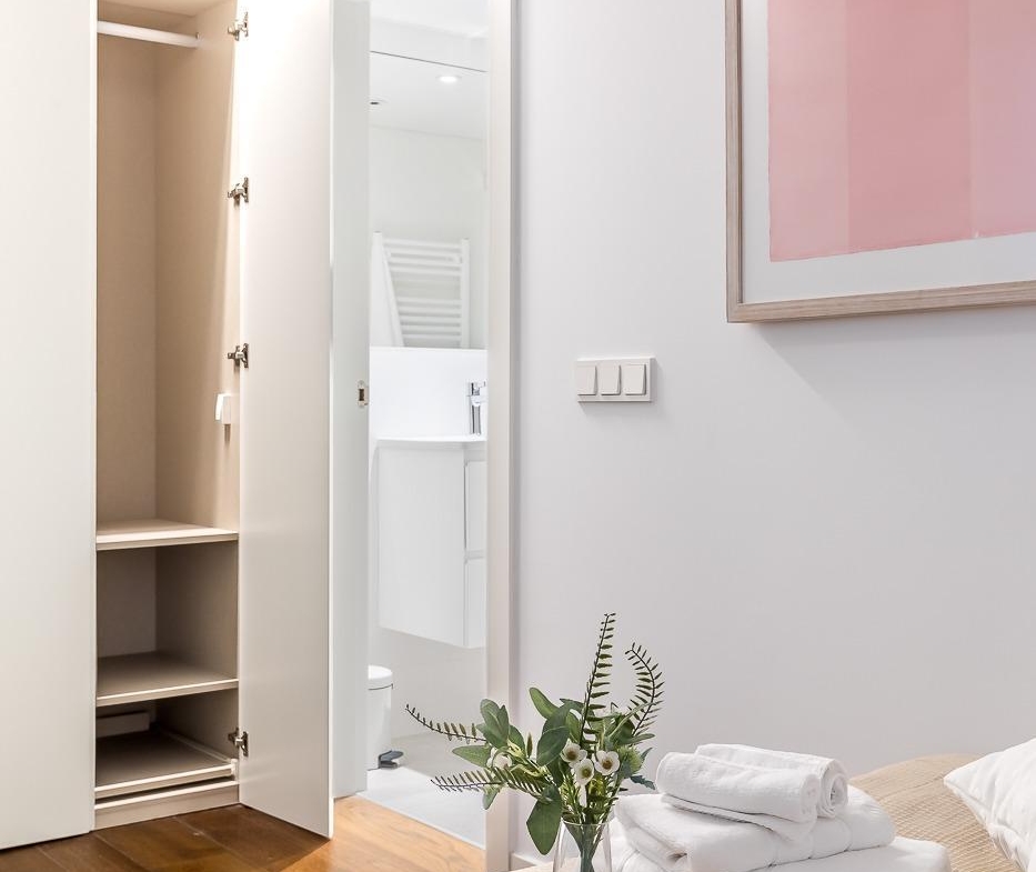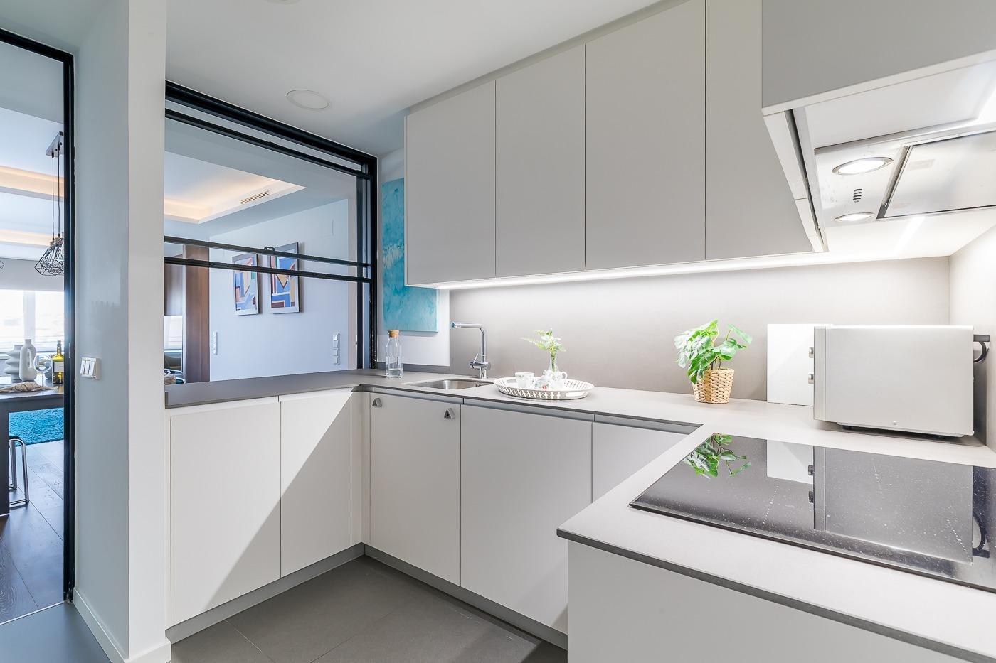 Este piso de dos habitaciones en la octava planta de un edificio en las cercanías de Plaza España se distribuye: al entrar con un amplio hall alargado en el que tenemos un armario empotrado de gran capacidad, a la izquierda una puerta nos lleva al dormitorio secundario con baño incorporado en suite, a la derecha el dormitorio principal también con baño incluido y zona de vestidor, desde el hall de frente accedemos al salón-comedor con cocina totalmente equipada con electrodomésticos marca premium separada con una cristalera. El piso es exterior y esta a una buena altura lo que le confiere gran luminosidad.