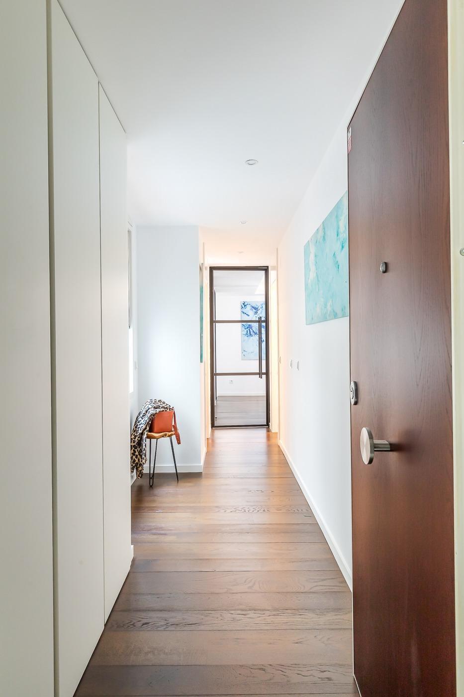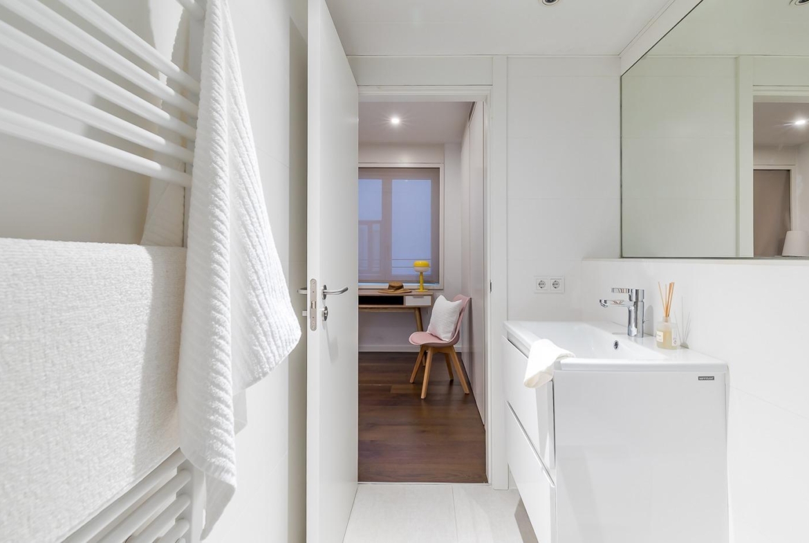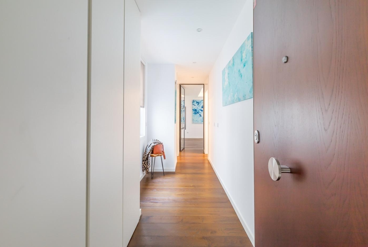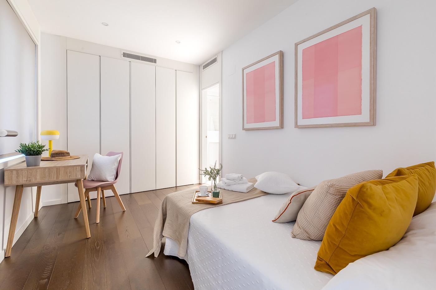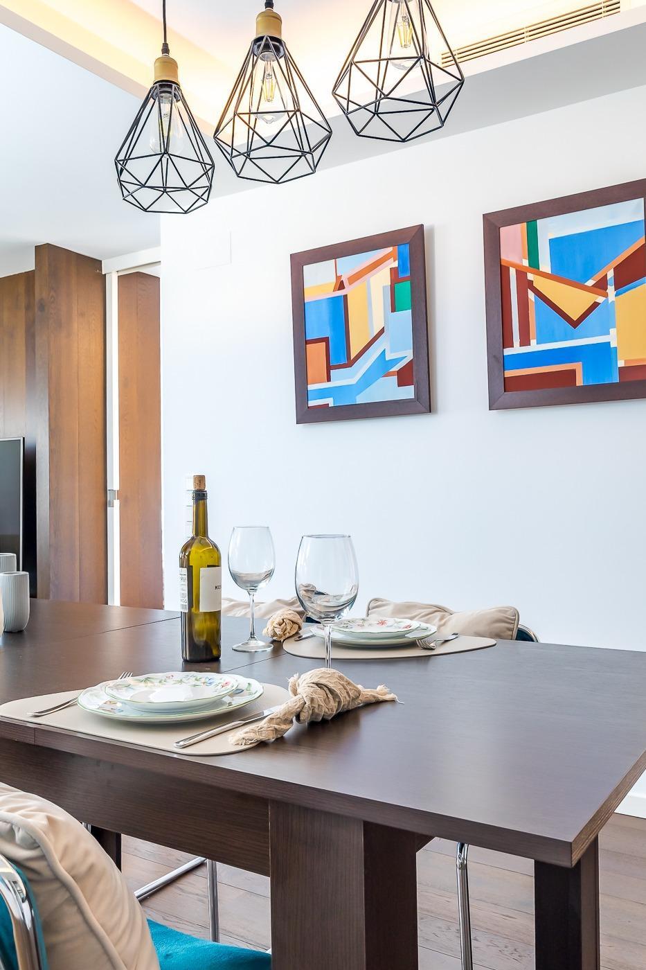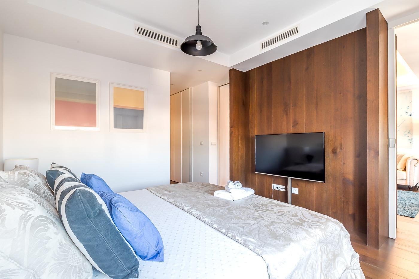 Este piso de dos habitaciones en la octava planta de un edificio en las cercanías de Plaza España se distribuye: al entrar con un amplio hall alargado en el que tenemos un armario empotrado de gran capacidad, a la izquierda una puerta nos lleva al dormitorio secundario con baño incorporado en suite, a la derecha el dormitorio principal también con baño incluido y zona de vestidor, desde el hall de frente accedemos al salón-comedor con cocina totalmente equipada con electrodomésticos marca premium separada con una cristalera. El piso es exterior y esta a una buena altura lo que le confiere gran luminosidad.