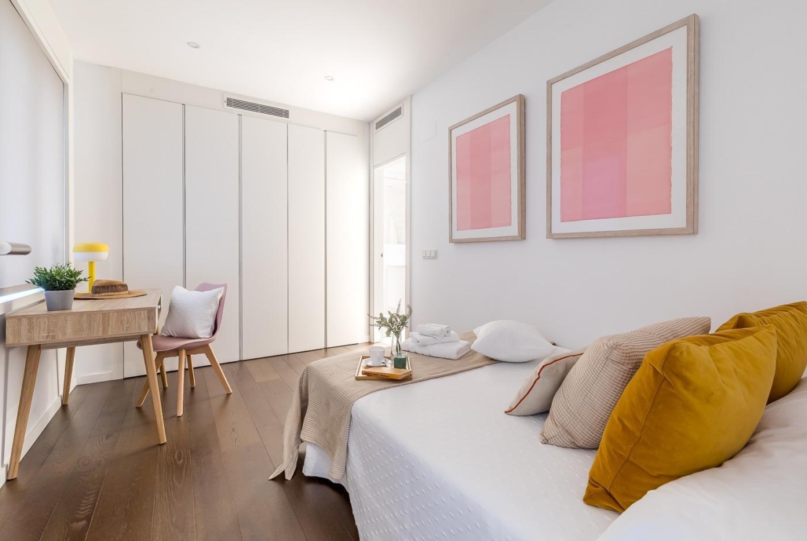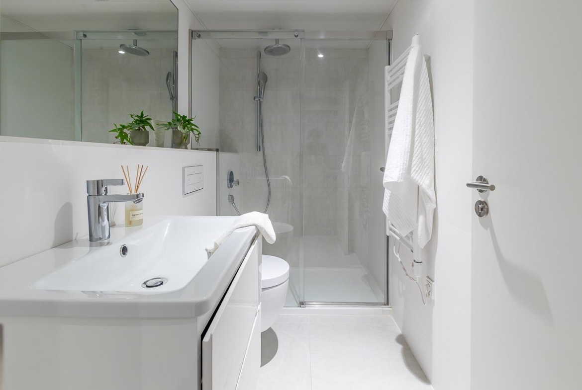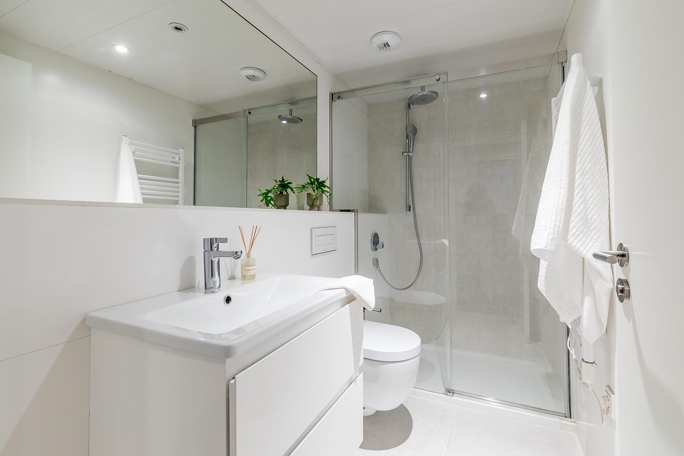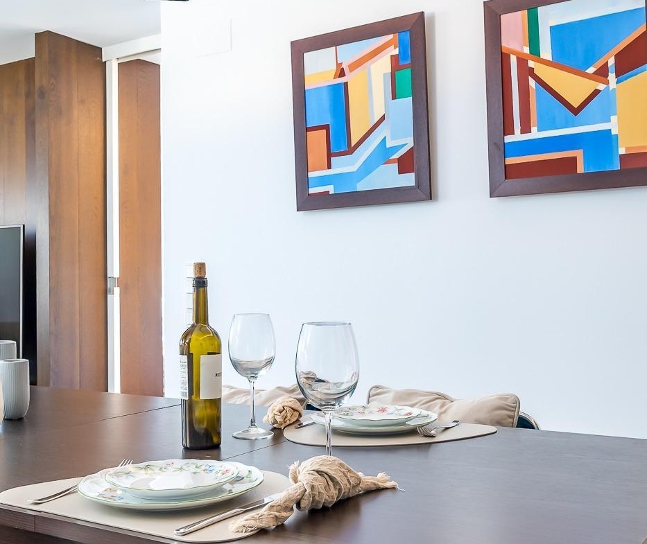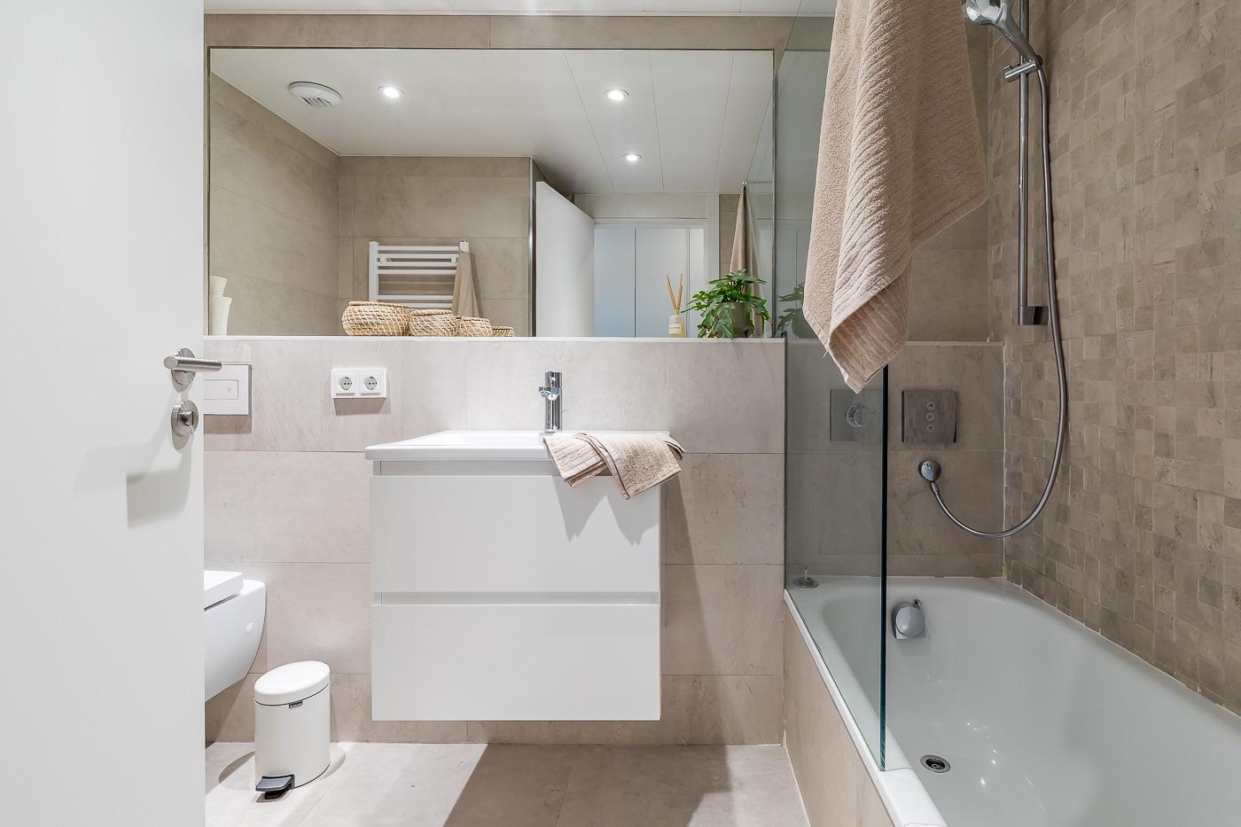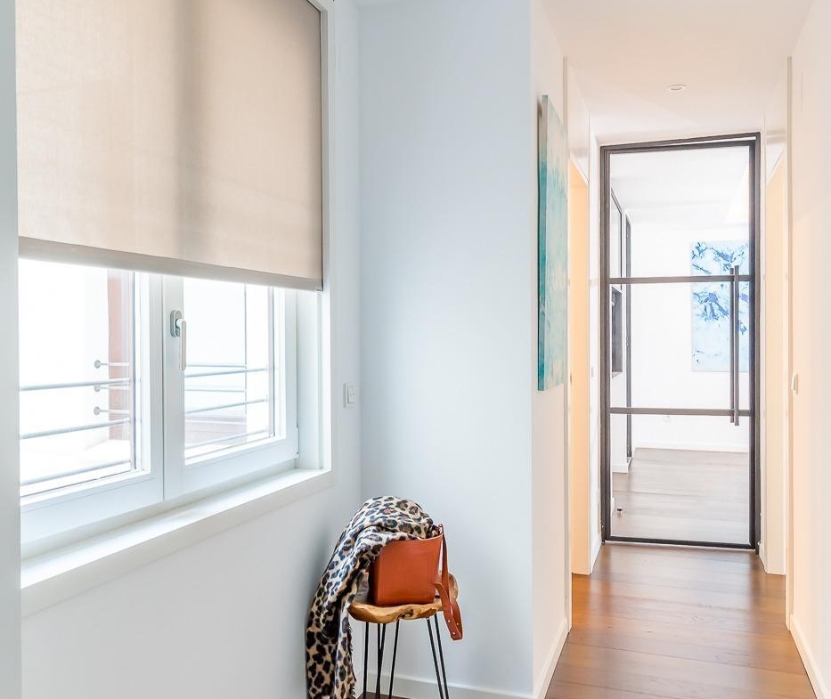 Este piso de dos habitaciones en la octava planta de un edificio en las cercanías de Plaza España se distribuye: al entrar con un amplio hall alargado en el que tenemos un armario empotrado de gran capacidad, a la izquierda una puerta nos lleva al dormitorio secundario con baño incorporado en suite, a la derecha el dormitorio principal también con baño incluido y zona de vestidor, desde el hall de frente accedemos al salón-comedor con cocina totalmente equipada con electrodomésticos marca premium separada con una cristalera. El piso es exterior y esta a una buena altura lo que le confiere gran luminosidad.