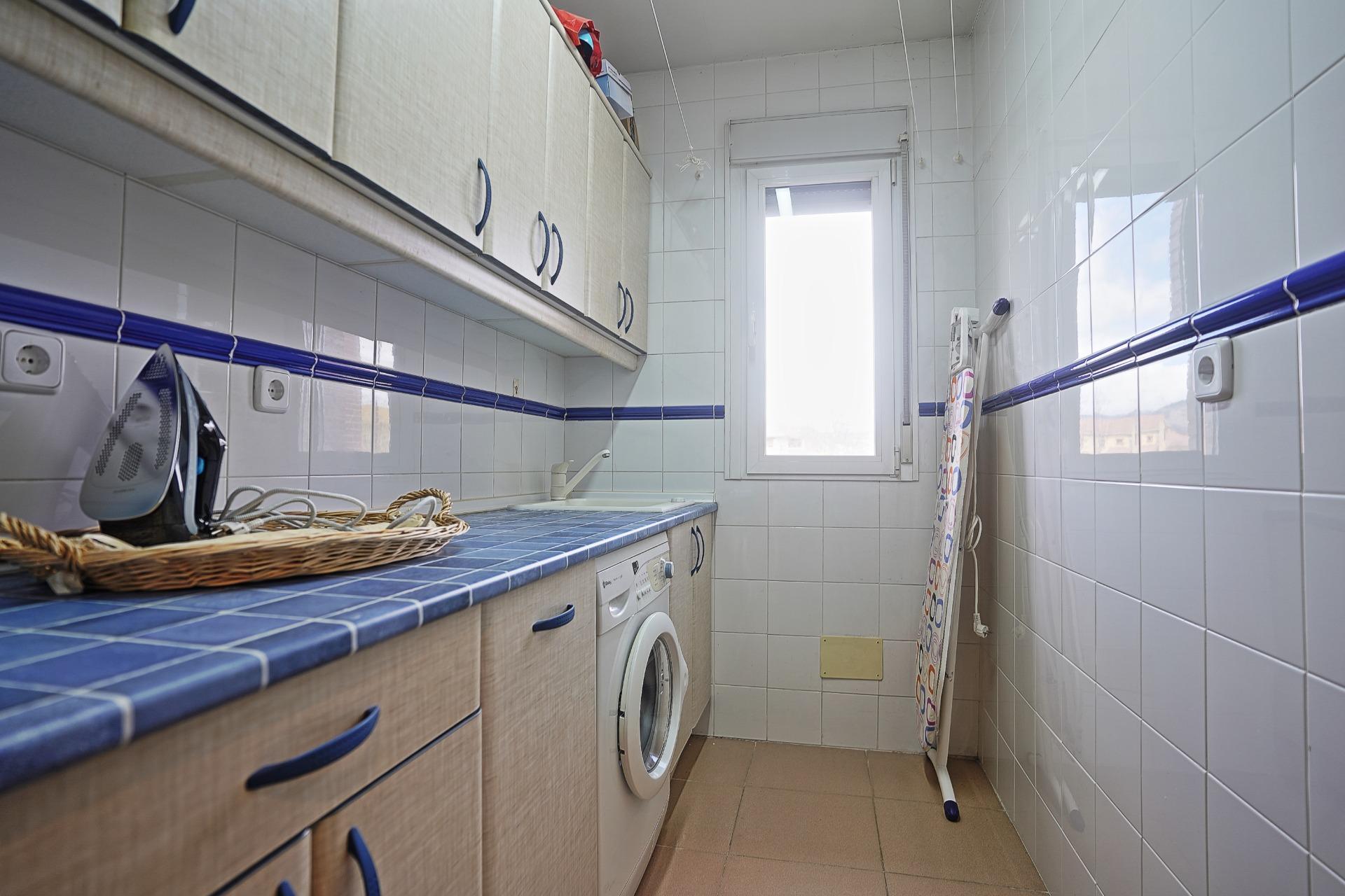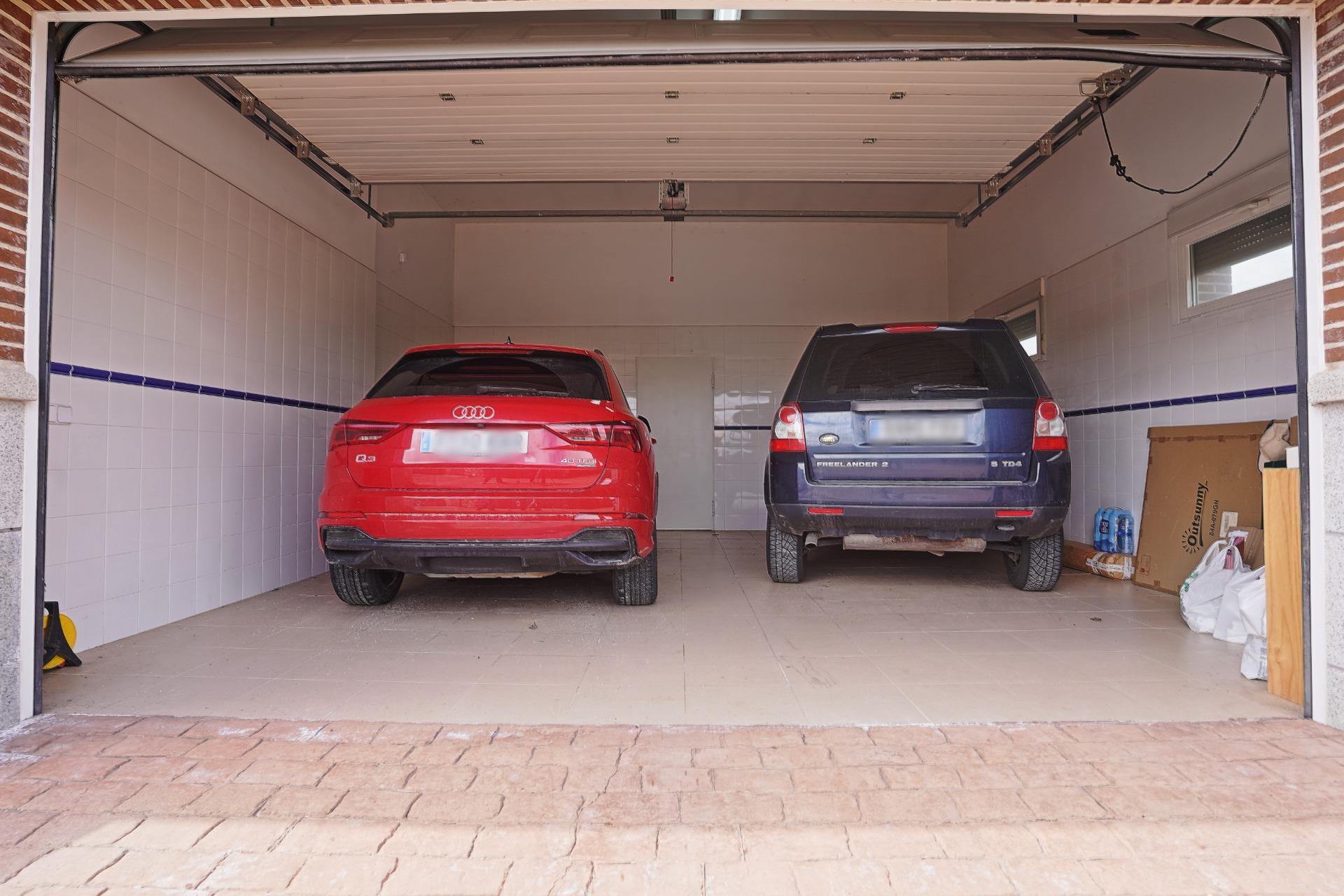 Frente a la puerta de entrada al salón-comedor, se sitúa el acceso a la zona de servicio de la vivienda, constituida por el garaje de doble altura y puerta de 5 mts mecanizada, abierto al alzado frontal de la construcción, un almacén( cuarto de caldera y maquina aspiración centralizada) y una zona de lavado y plancha. Estos dos últimas dependencias abiertas al lateral izquierdo.