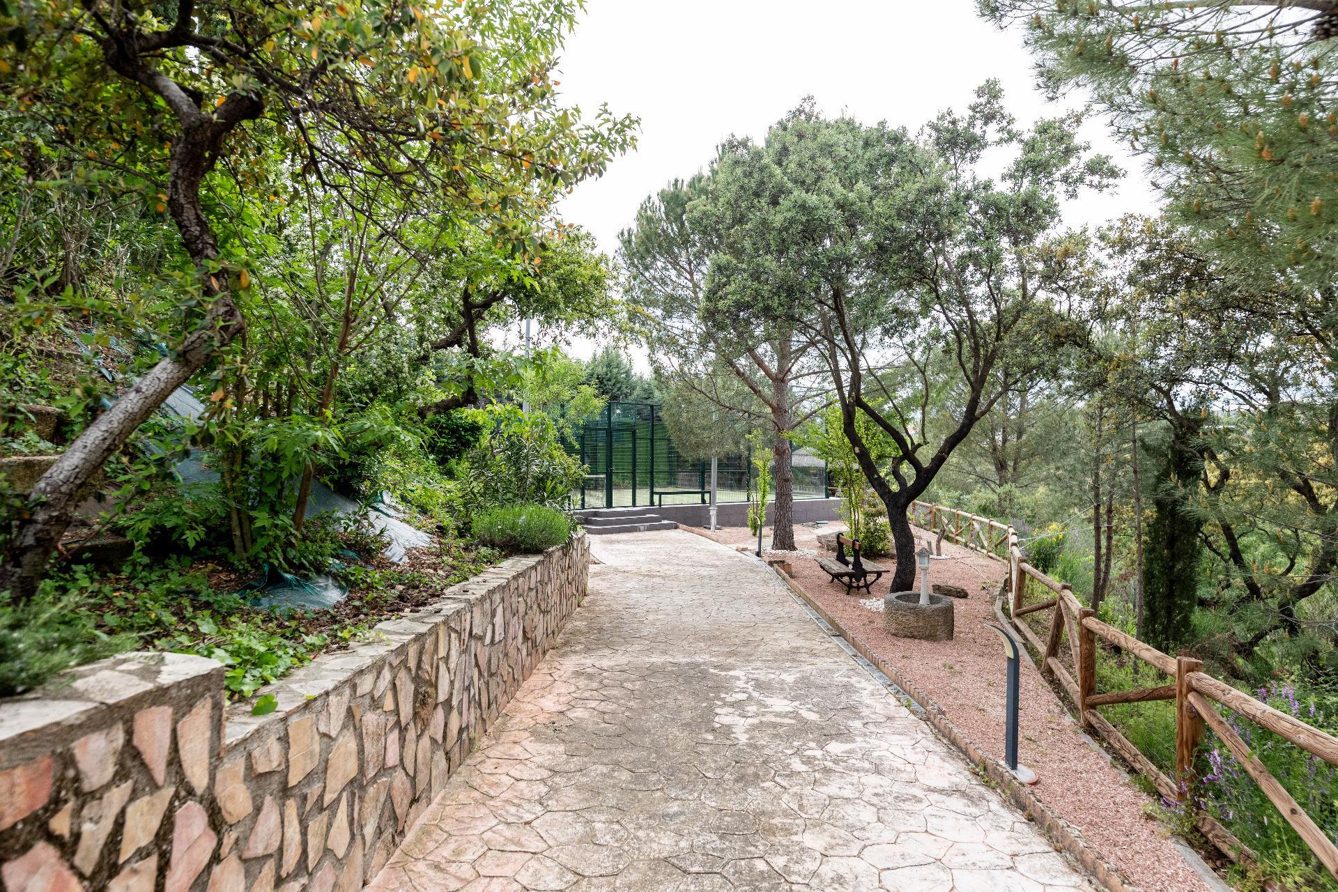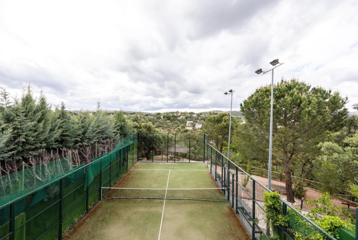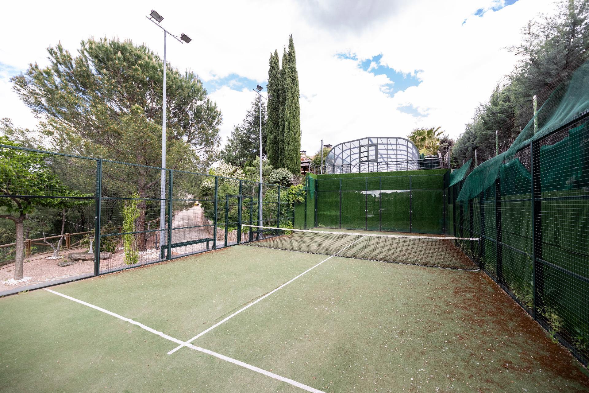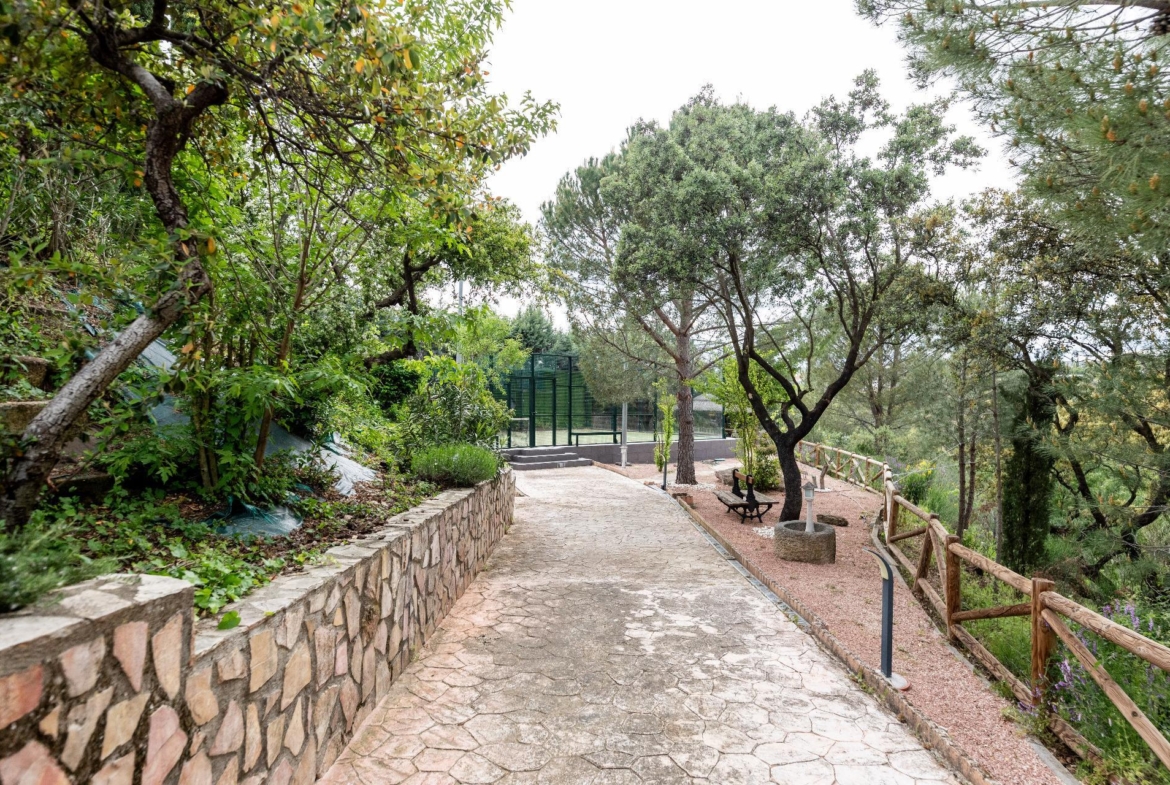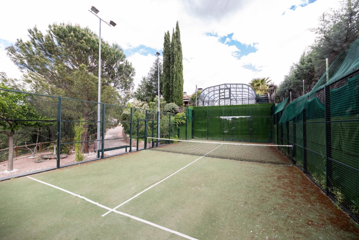 El exterior de la propiedad es un auténtico oasis. Un jardín amplio rodea la vivienda, con una pérgola cubierta ideal para reuniones y una piscina climatizada que permite disfrutar del baño durante todo el año. También dispone de una pista de pádel de alta calidad con iluminación artificial y varias zonas ajardinadas con frondosa vegetación.