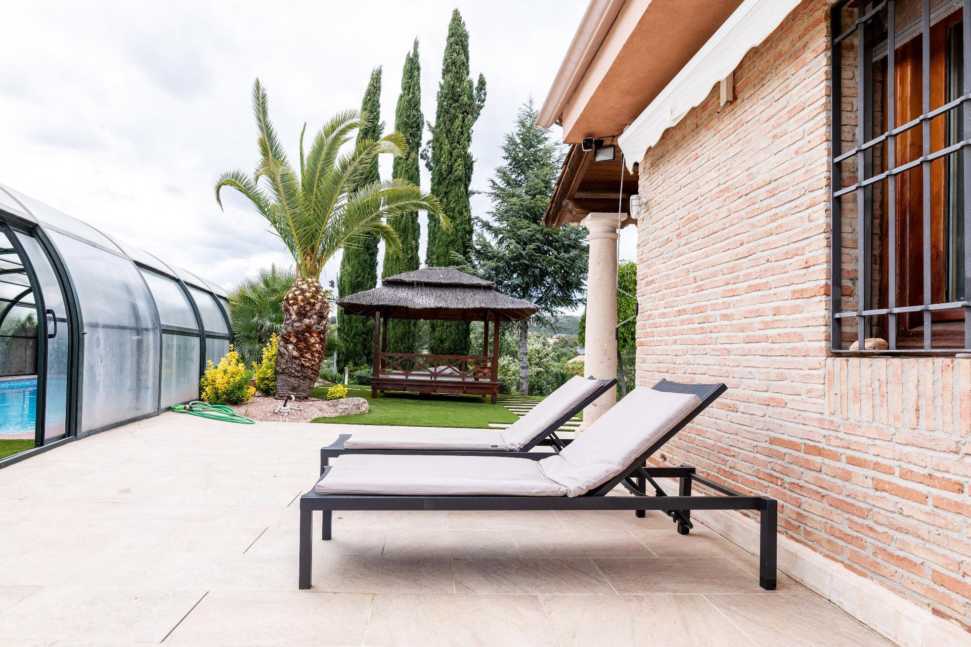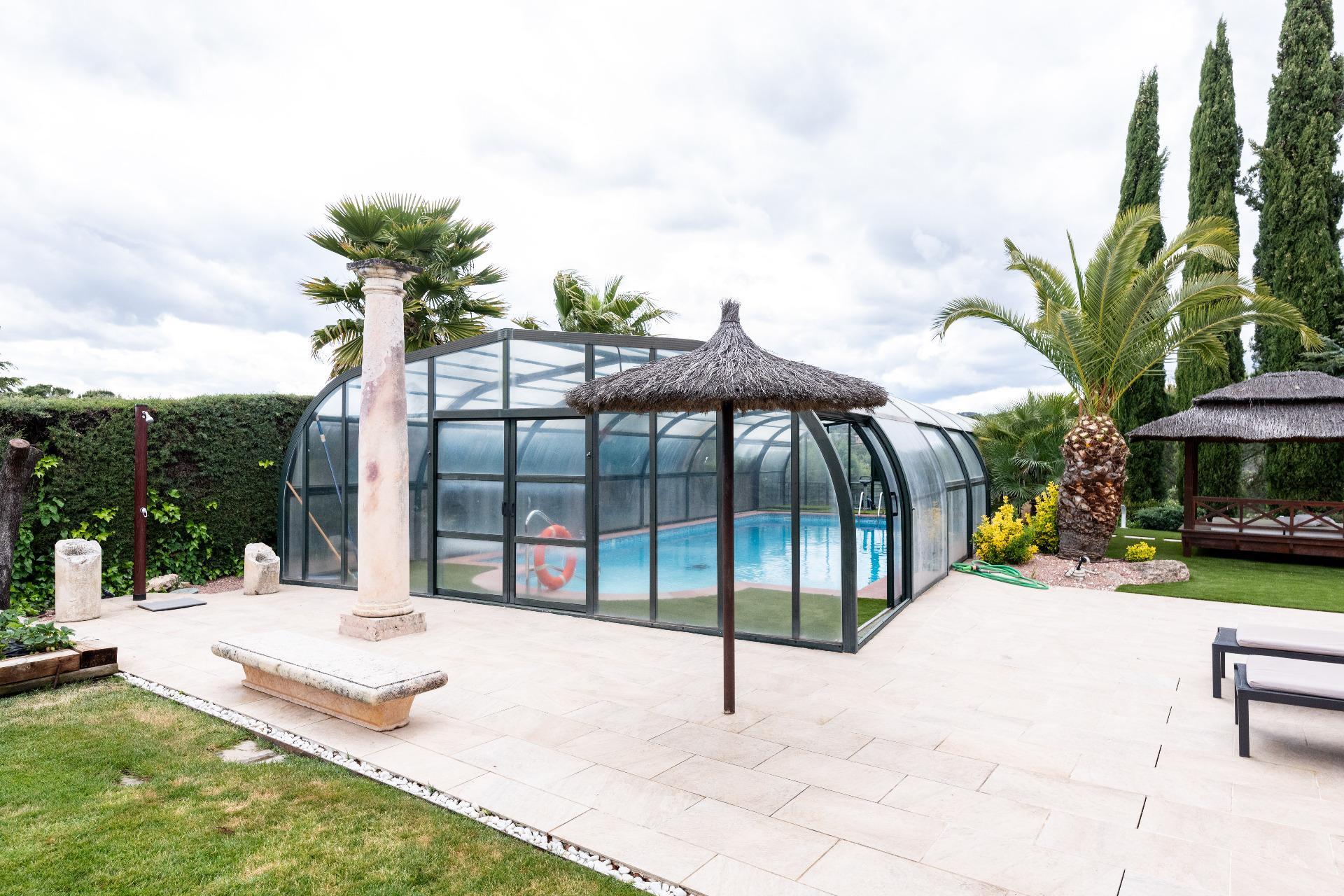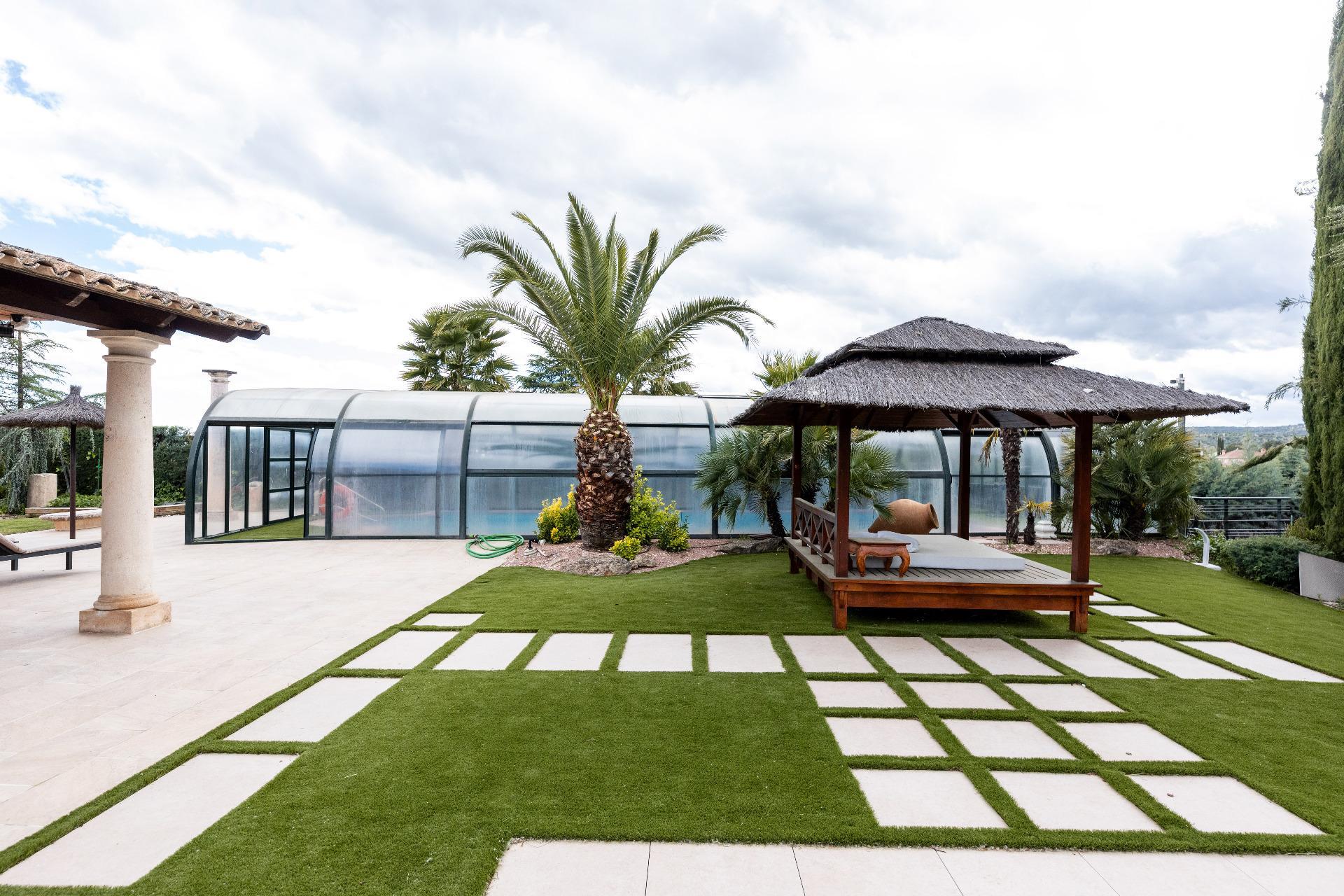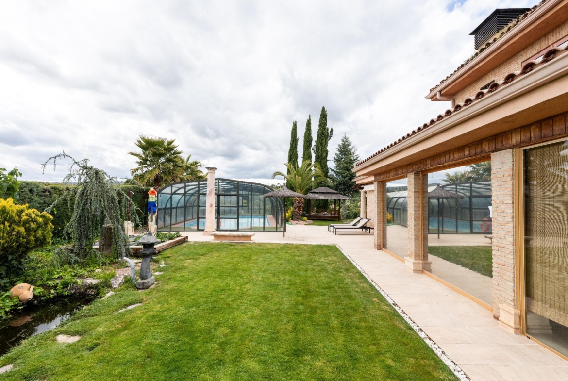El exterior de la propiedad es un auténtico oasis. Un jardín amplio rodea la vivienda, con una pérgola cubierta ideal para reuniones y una piscina climatizada que permite disfrutar del baño durante todo el año. También dispone de una pista de pádel de alta calidad con iluminación artificial y varias zonas ajardinadas con frondosa vegetación.