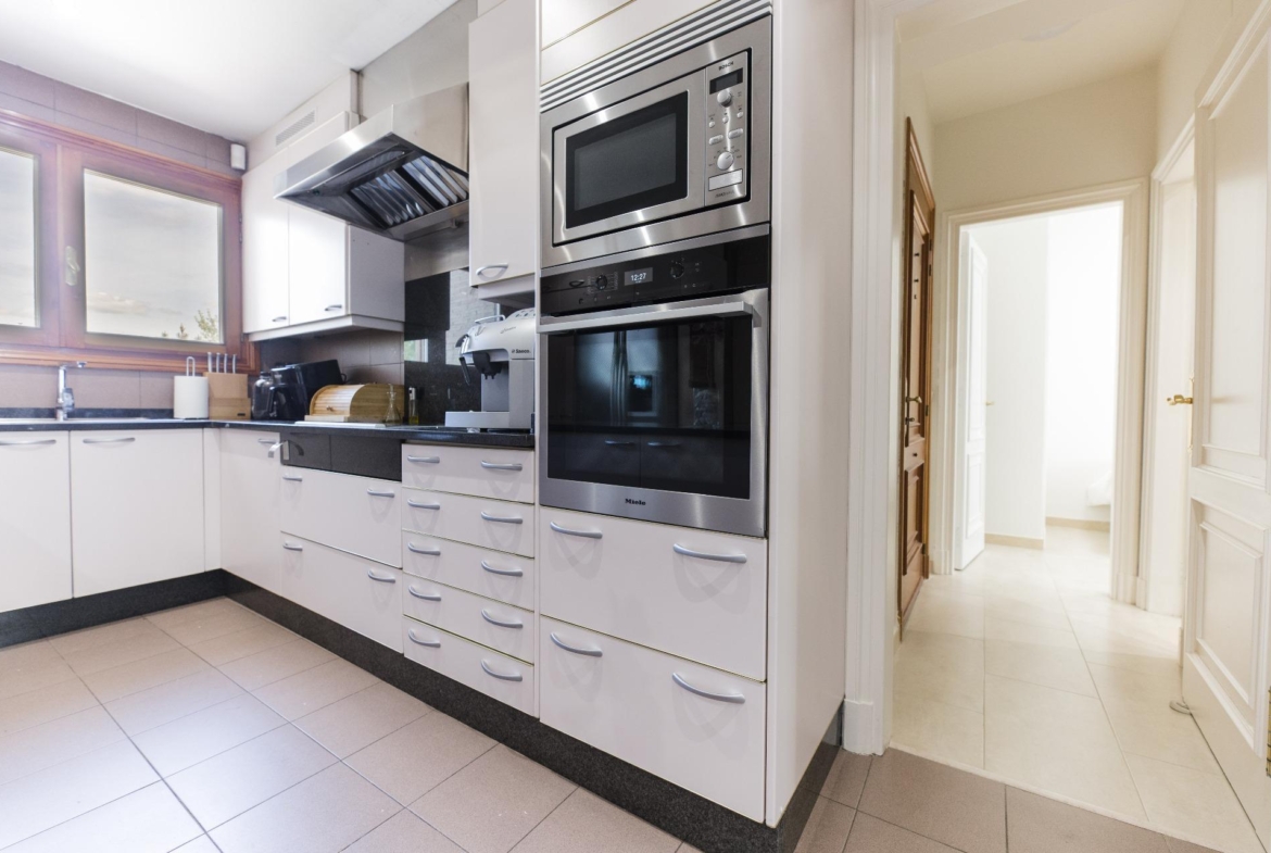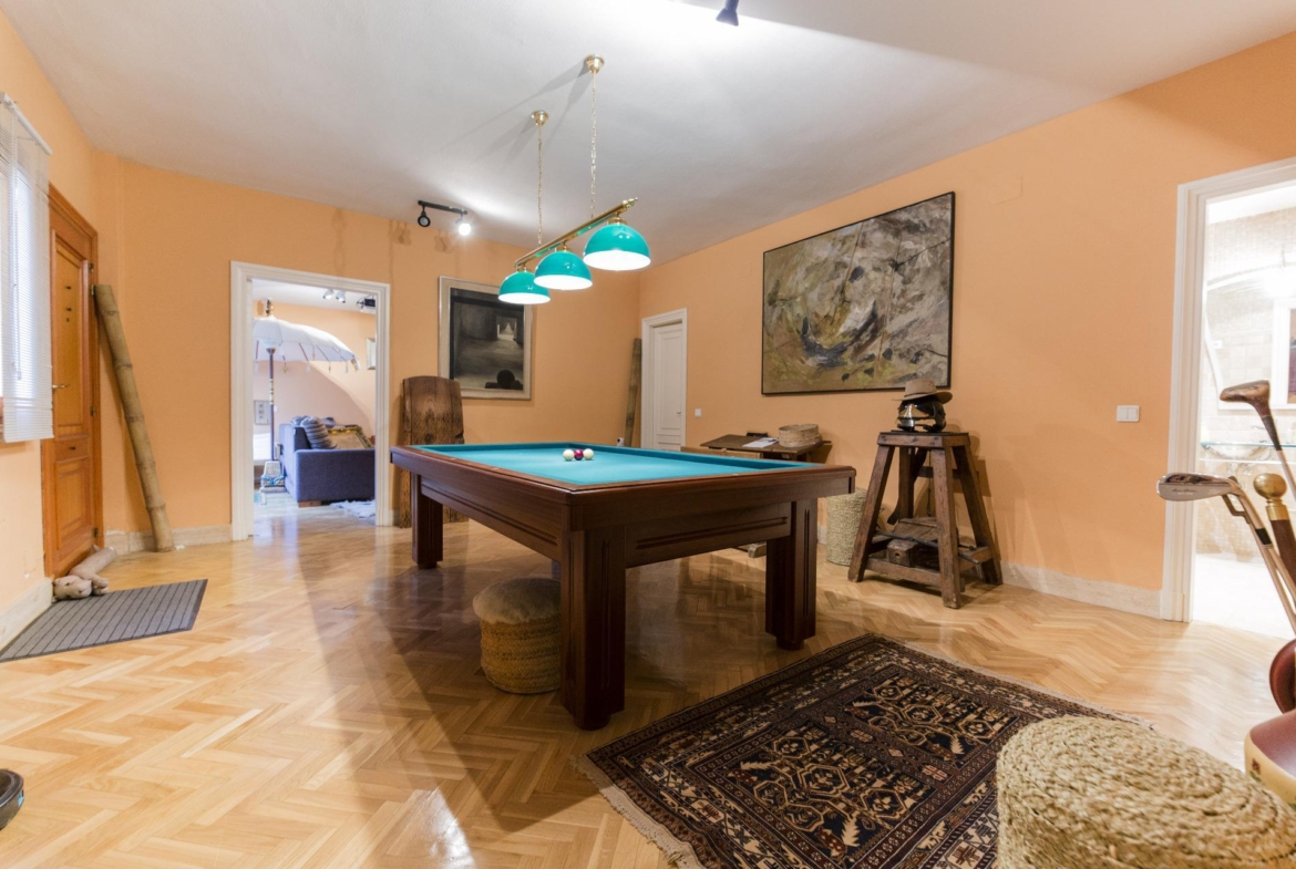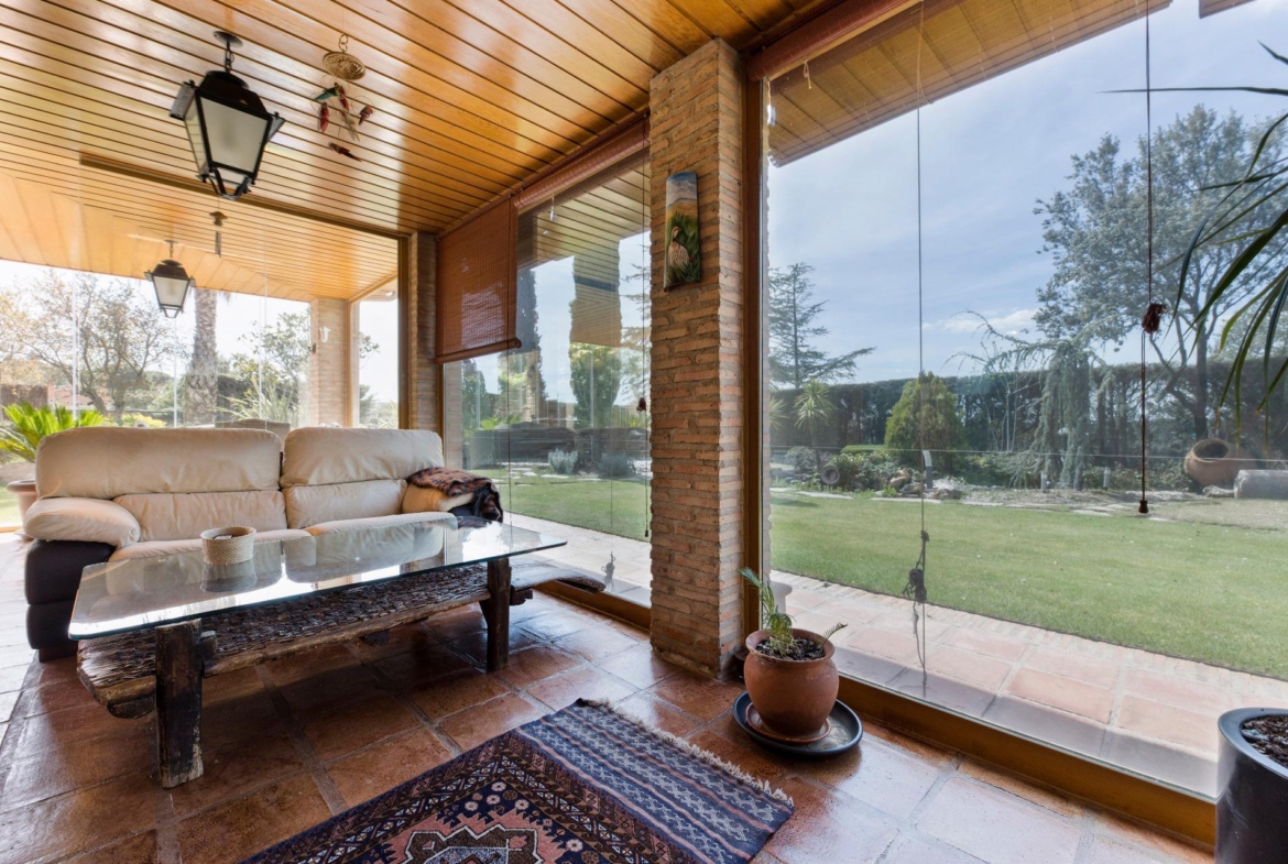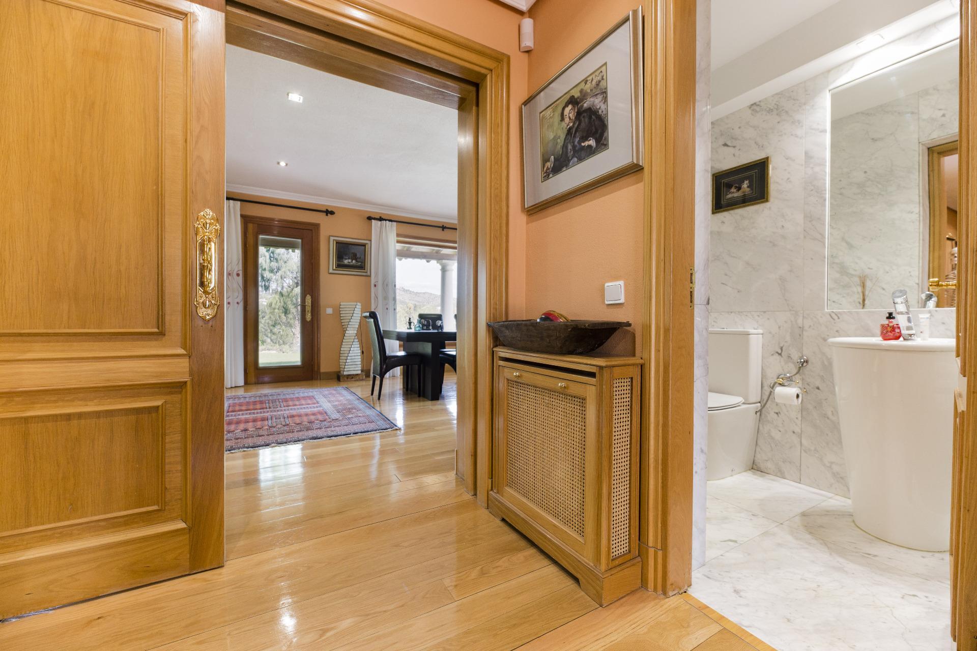 La vivienda se desarrolla en tres plantas. Las dos principales están destinadas a la vida diaria, mientras que el sótano alberga espacios recreativos, la sala de calderas y el garaje. En la planta de acceso, un hall da paso a un salón con grandes ventanales que llenan de luz la estancia. La cocina, amplia y completamente equipada, cuenta con despensa, comedor de diario, lavadero y zona de plancha. También dispone de una habitación de servicio con baño y un área de tendedero adaptable a distintos usos. En el otro extremo, se encuentra un despacho o sala de estar privada, conectado con un porche acristalado en esquina que se abre al jardín y la piscina. La planta también dispone de dos chimeneas.