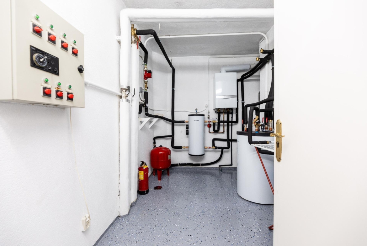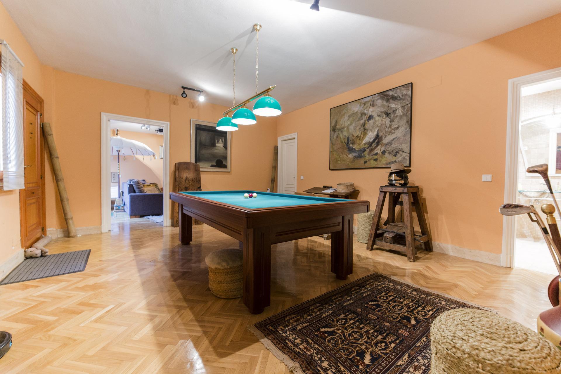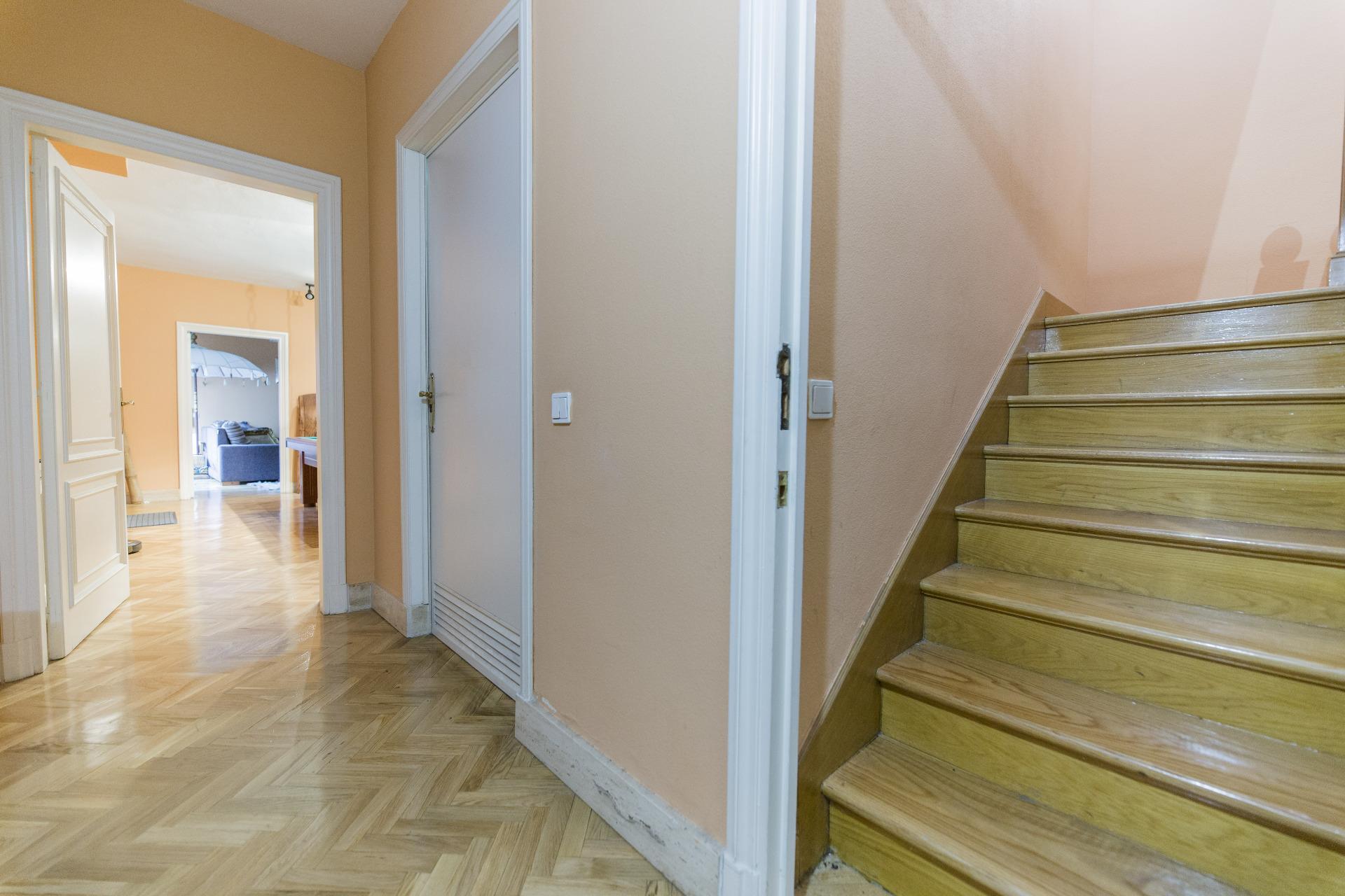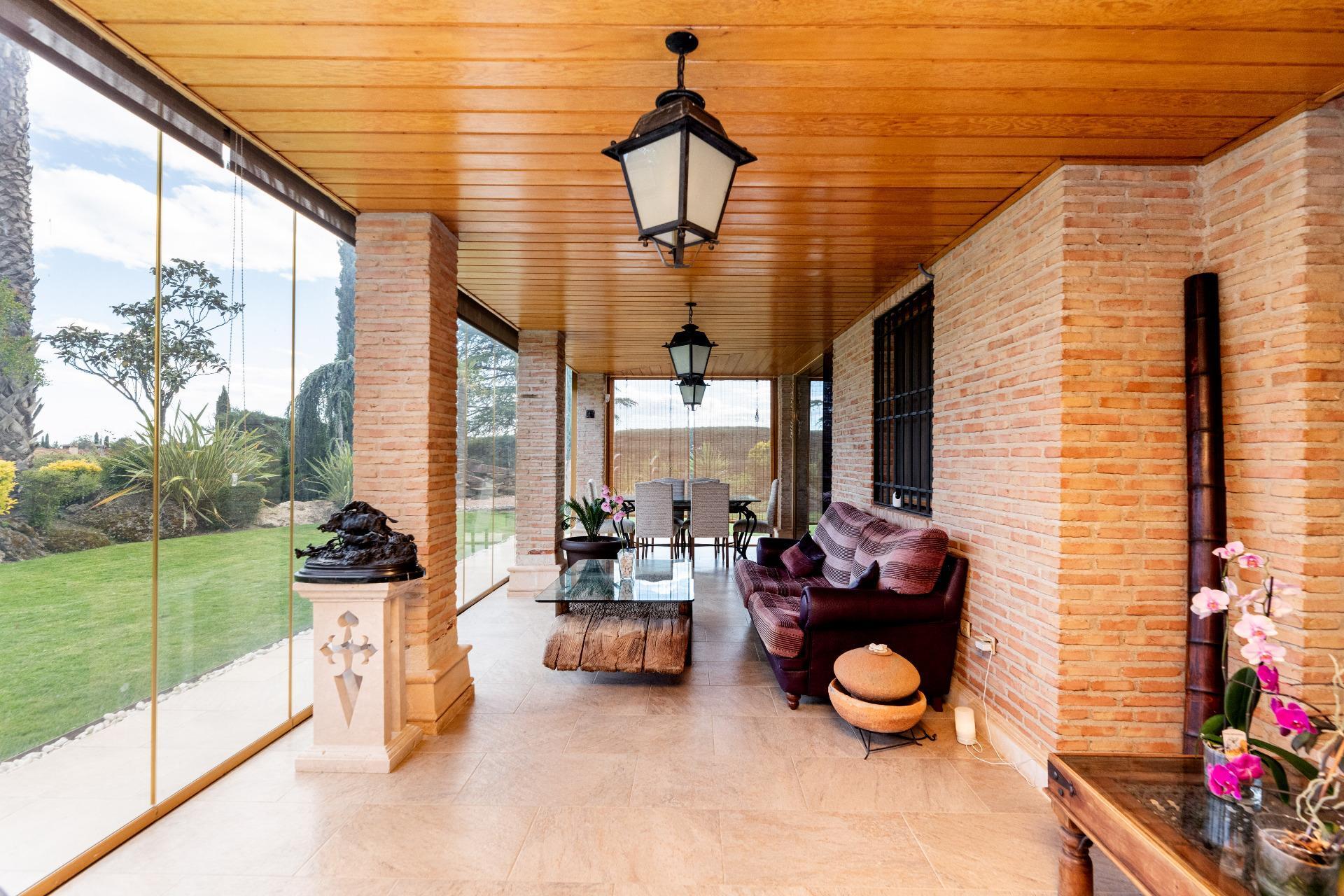 La vivienda se desarrolla en tres plantas. Las dos principales están destinadas a la vida diaria, mientras que el sótano alberga espacios recreativos, la sala de calderas y el garaje. En la planta de acceso, un hall da paso a un salón con grandes ventanales que llenan de luz la estancia. La cocina, amplia y completamente equipada, cuenta con despensa, comedor de diario, lavadero y zona de plancha. También dispone de una habitación de servicio con baño y un área de tendedero adaptable a distintos usos. En el otro extremo, se encuentra un despacho o sala de estar privada, conectado con un porche acristalado en esquina que se abre al jardín y la piscina. La planta también dispone de dos chimeneas.