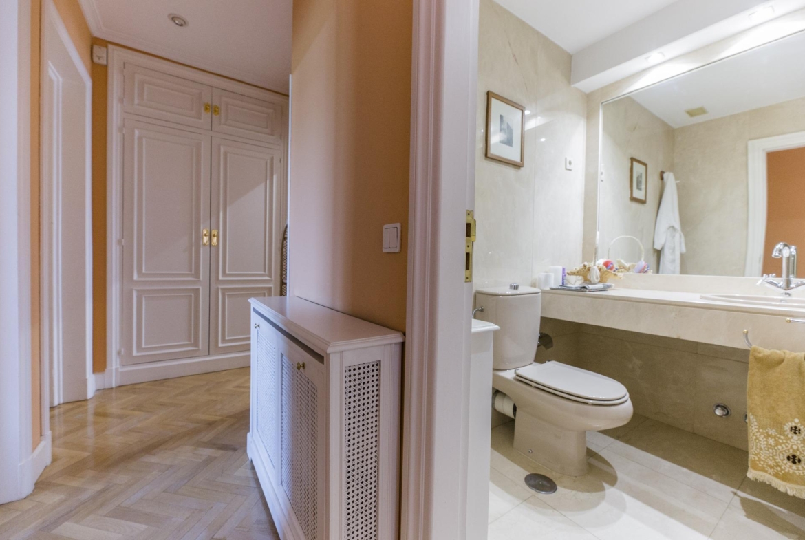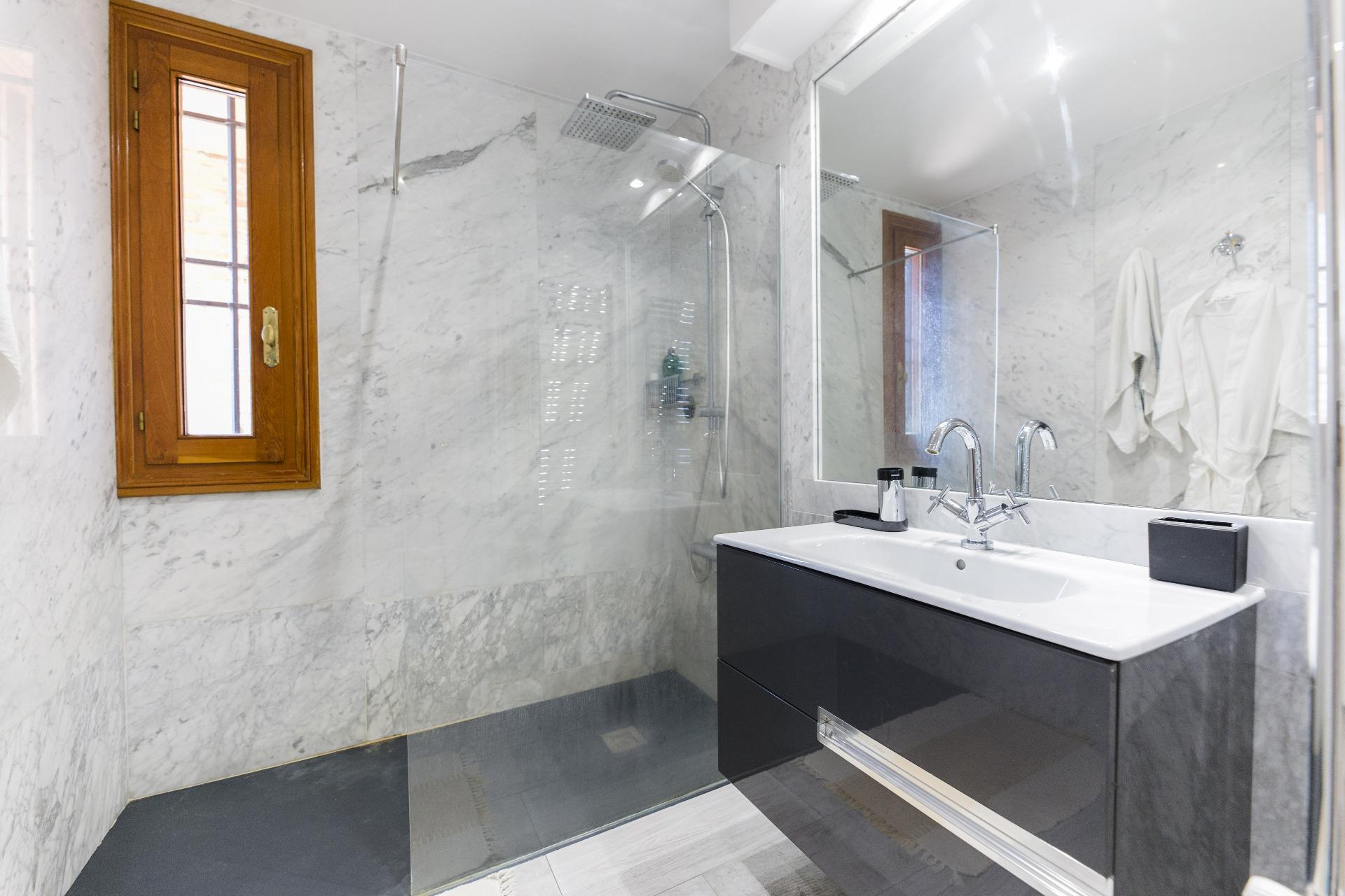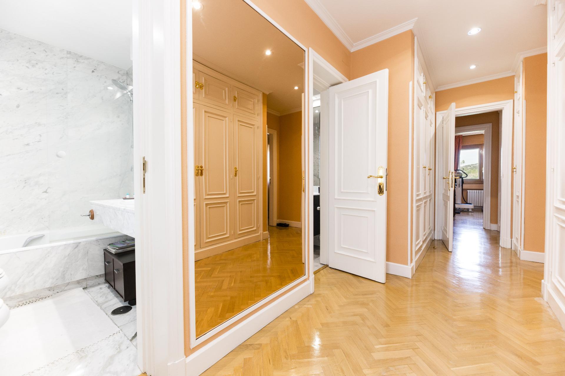En la planta superior se ubican cuatro dormitorios, dos de ellos con baño en suite. La habitación principal, además de sus dos baños privados, cuenta con un gran vestidor y una acogedora zona de estar. Desde aquí, se accede a una terraza con vistas panorámicas.