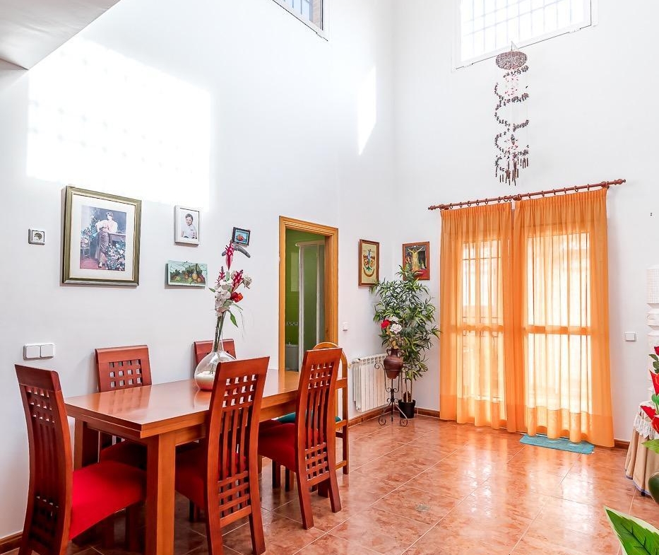 Zona planta calle con extenso salón comedor con chimenea, amplia cocina, y dos dormitorios con dos baños (uno de ellos en suite). Acceso a terraza acristalada y patio exterior.