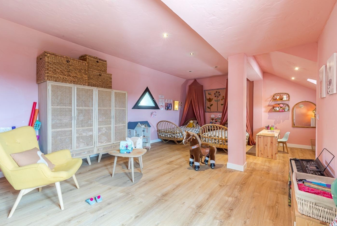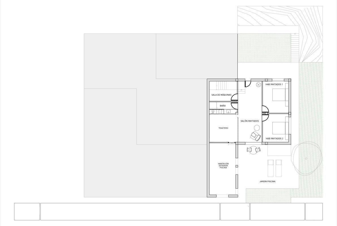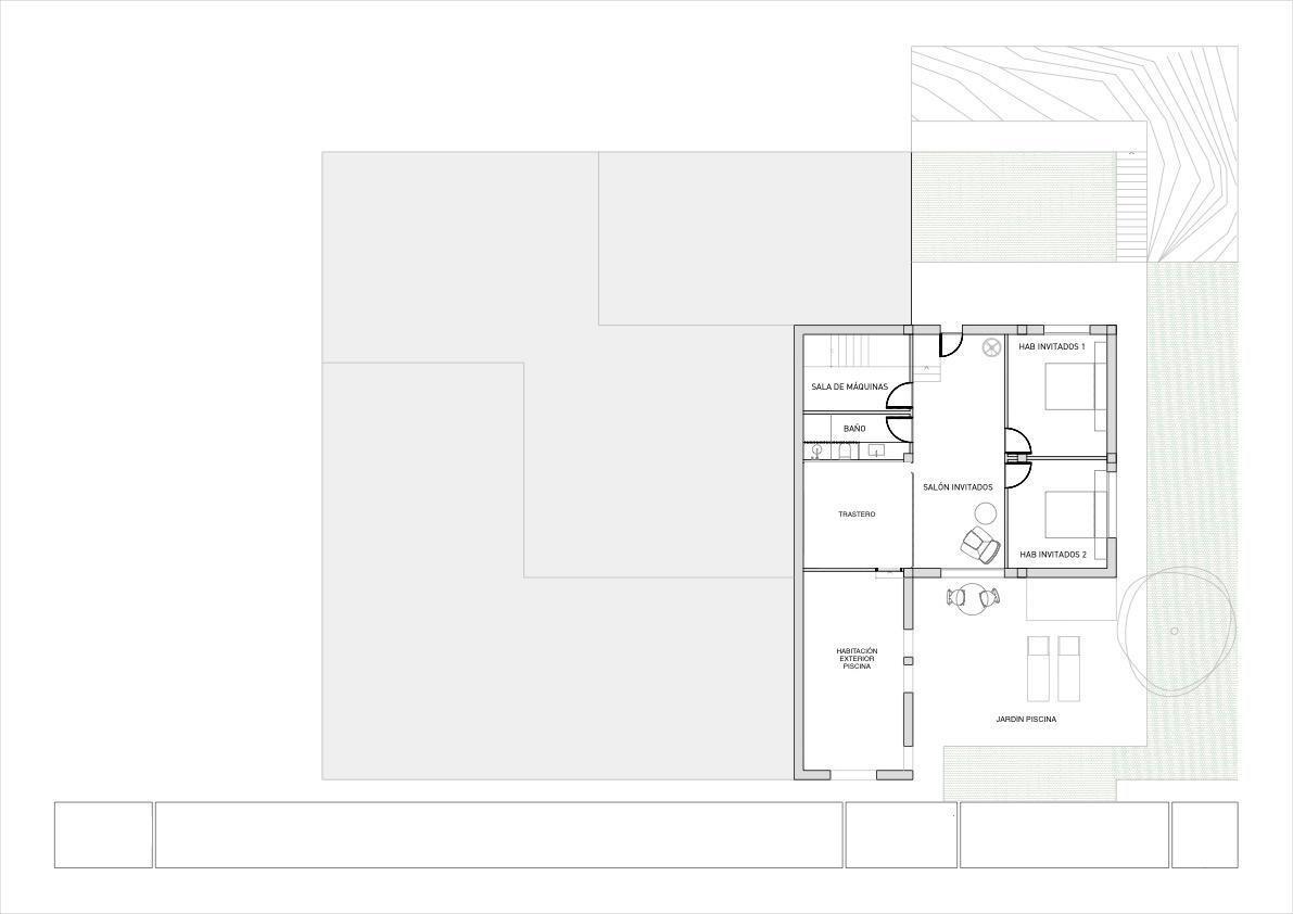 Desde la misma cocina bajamos a la planta baja donde tenemos un salón distribuidor con zona de TV, dos dormitorios de invitados con un baño completo que da uso a estos y un trastero. Todo ello con salida independiente al jardín. En esta planta baja se encuentra la sala de instalaciones de la calefacción que funciona por Aerotermia.