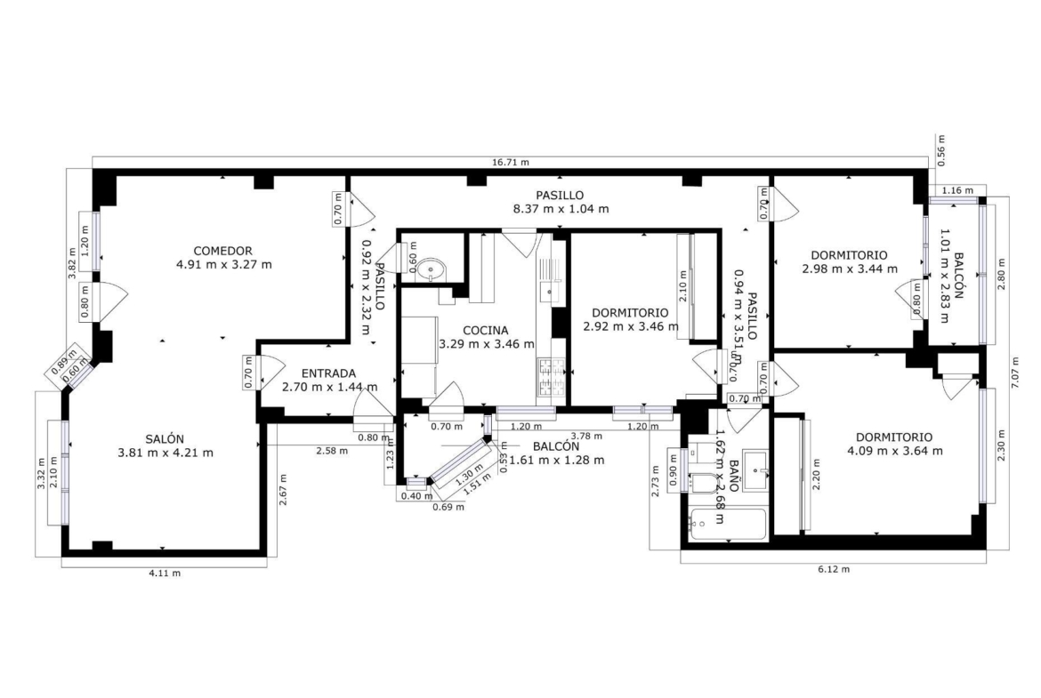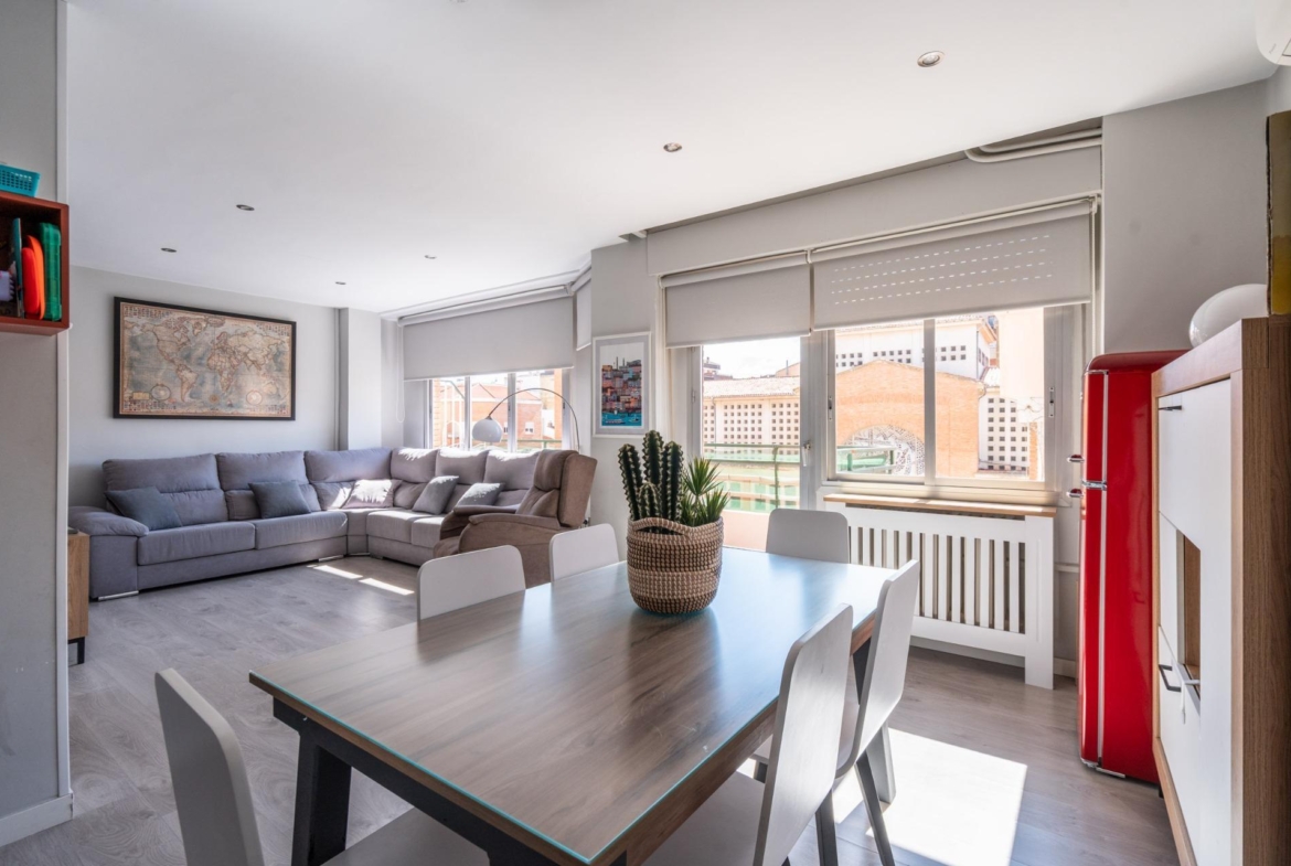 Con 122 m² construidos, la vivienda se organiza en torno a un gran salón comedor que se convierte en el auténtico protagonista. Sus amplios ventanales permiten una entrada generosa de luz natural y conectan con una de las tres terrazas, desde la que se disfrutan vistas despejadas a la plaza y al entorno urbano.