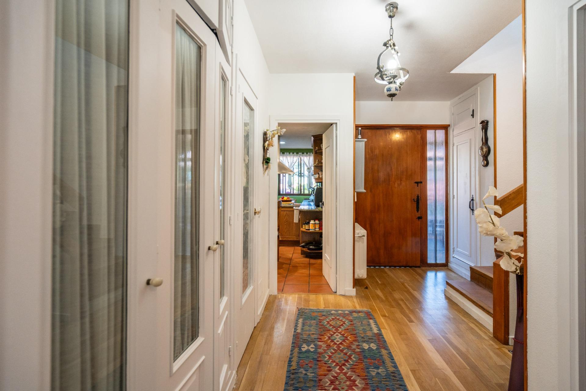 Un elegante y amplio hall recibidor cubierto da la bienvenida, conduciendo hacia un espectacular salón comedor muy luminoso, organizado en dos ambientes diferenciados de zona de estar dentro de un espacio completamente abierto. Desde aquí se accede a un gran porche-terraza que se convierte en una extensión natural del interior y que conecta mediante escaleras con el jardín, diseñado con distintas zonas de disfrute con pérgola, área de barbacoa, espacios ajardinados y una cómoda zona de aparcamiento.