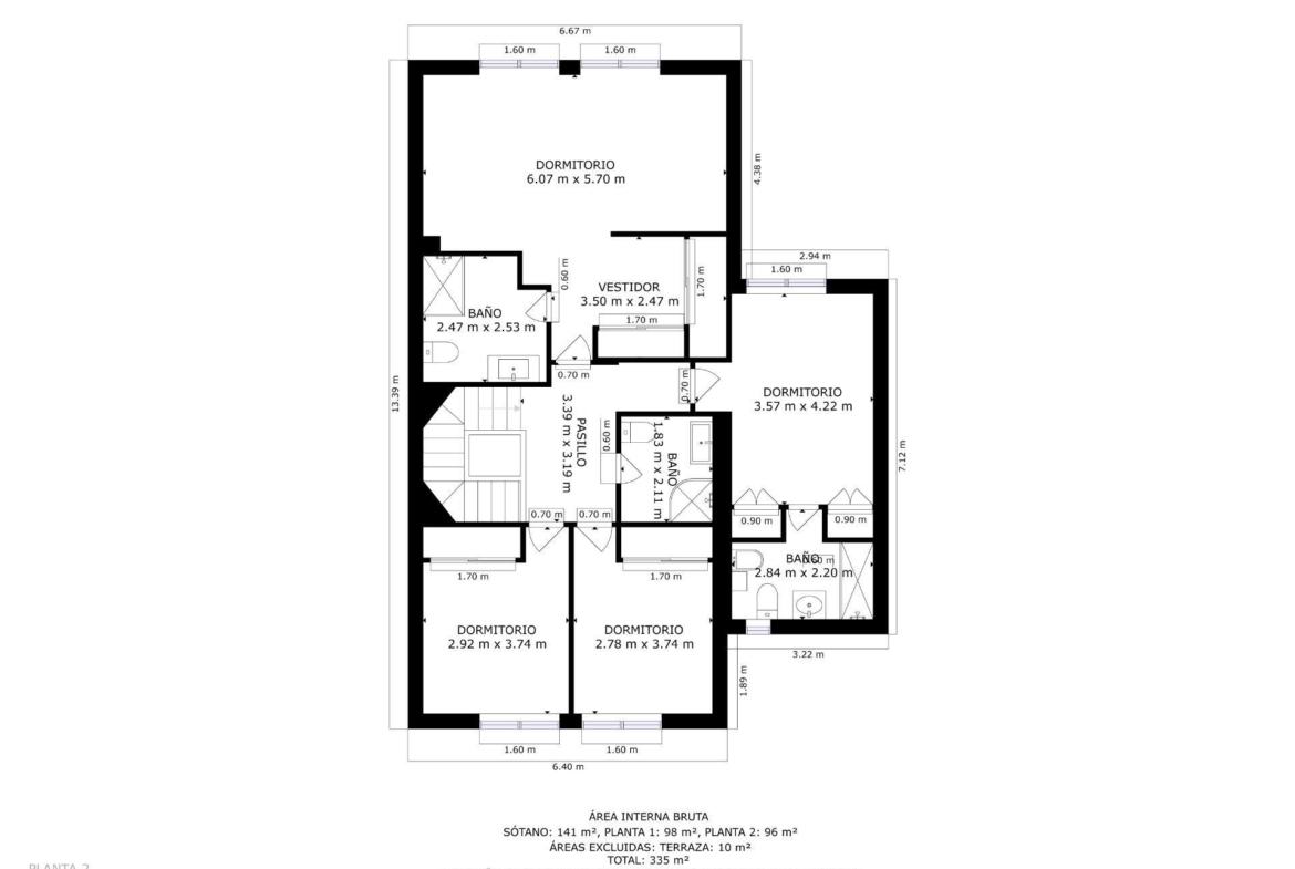 La vivienda cuenta con cinco dormitorios y cinco baños en total, garantizando amplitud y privacidad. En la planta de descanso se encuentran dos dormitorios en suite, uno de ellos con terraza privada, junto a otros dos que comparten un baño completo. El dormitorio principal se presenta como una verdadera suite privada, con su propio baño completo y una cómoda zona de vestidor.