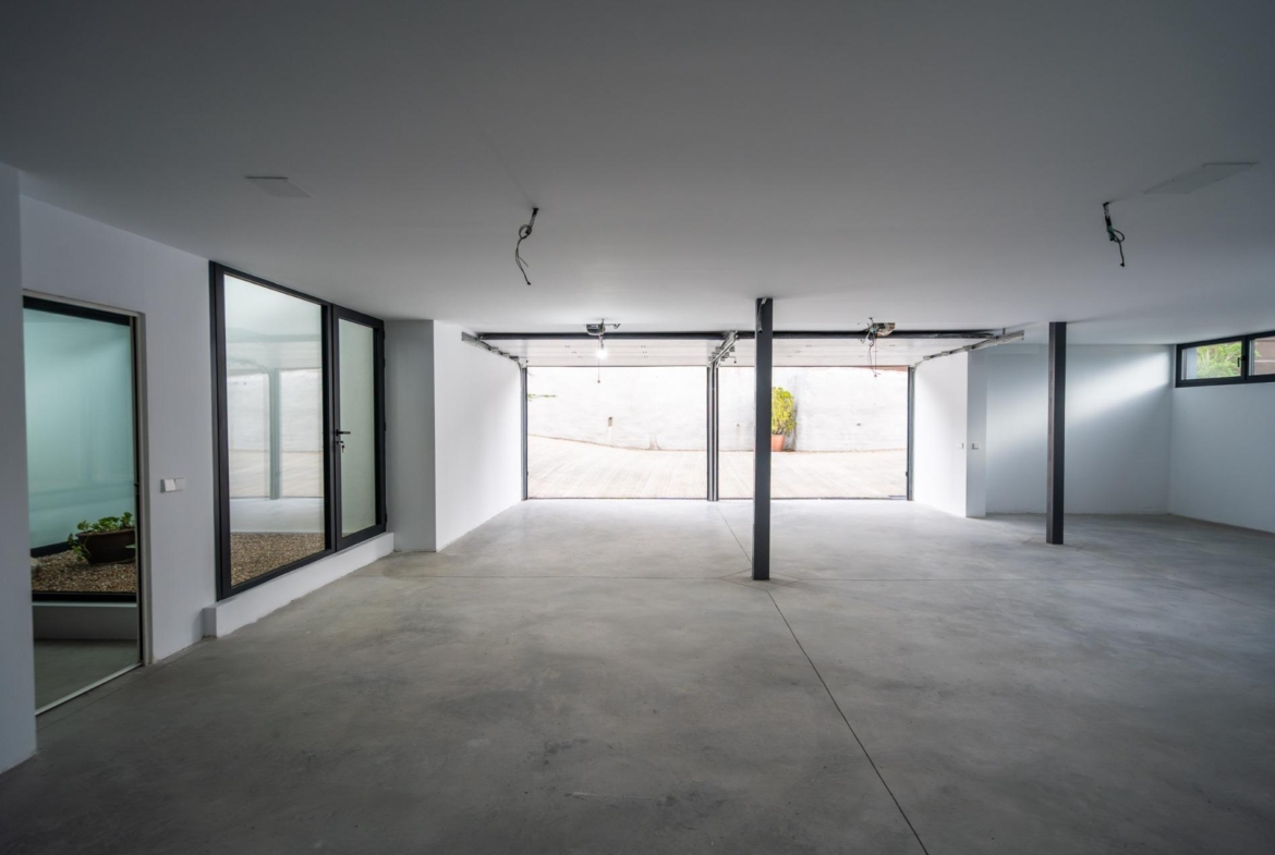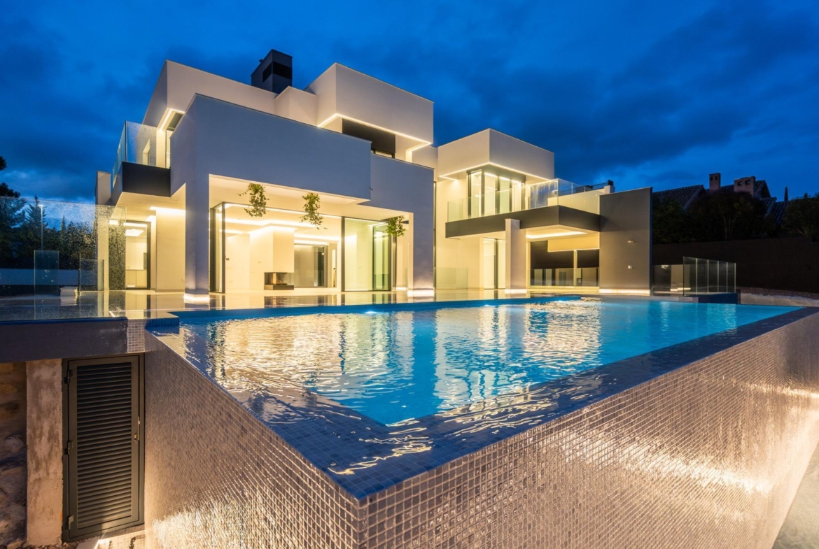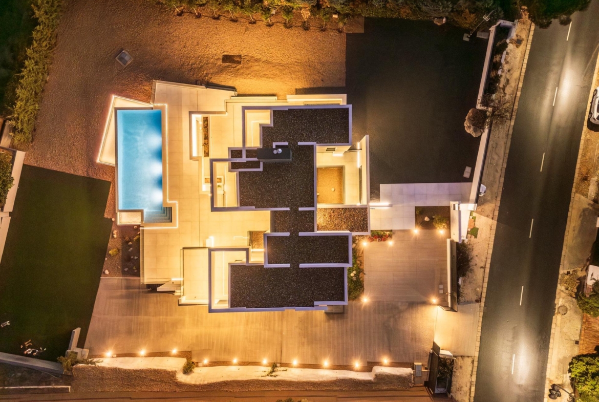 El jardín, de diseño minimalista y elegante, rodea la vivienda ofreciendo distintos ambientes para disfrutar al aire libre. La piscina desbordante y su amplia zona de solárium crean un entorno único y exclusivo, accesible desde casi todas las estancias de la casa.